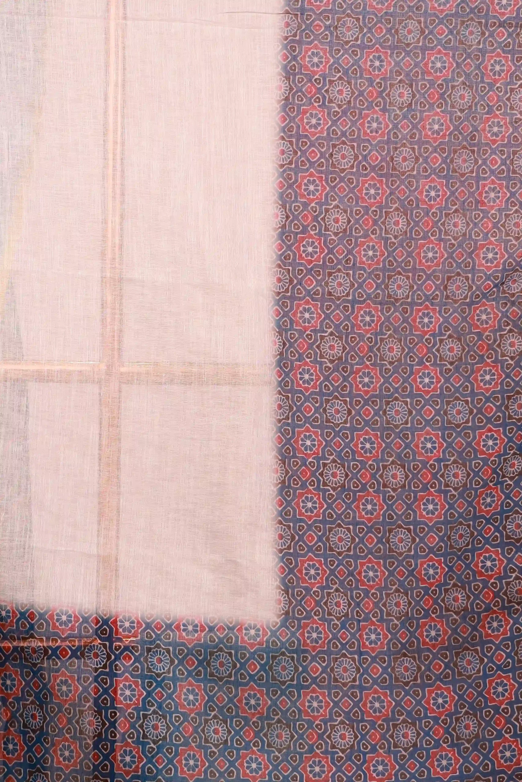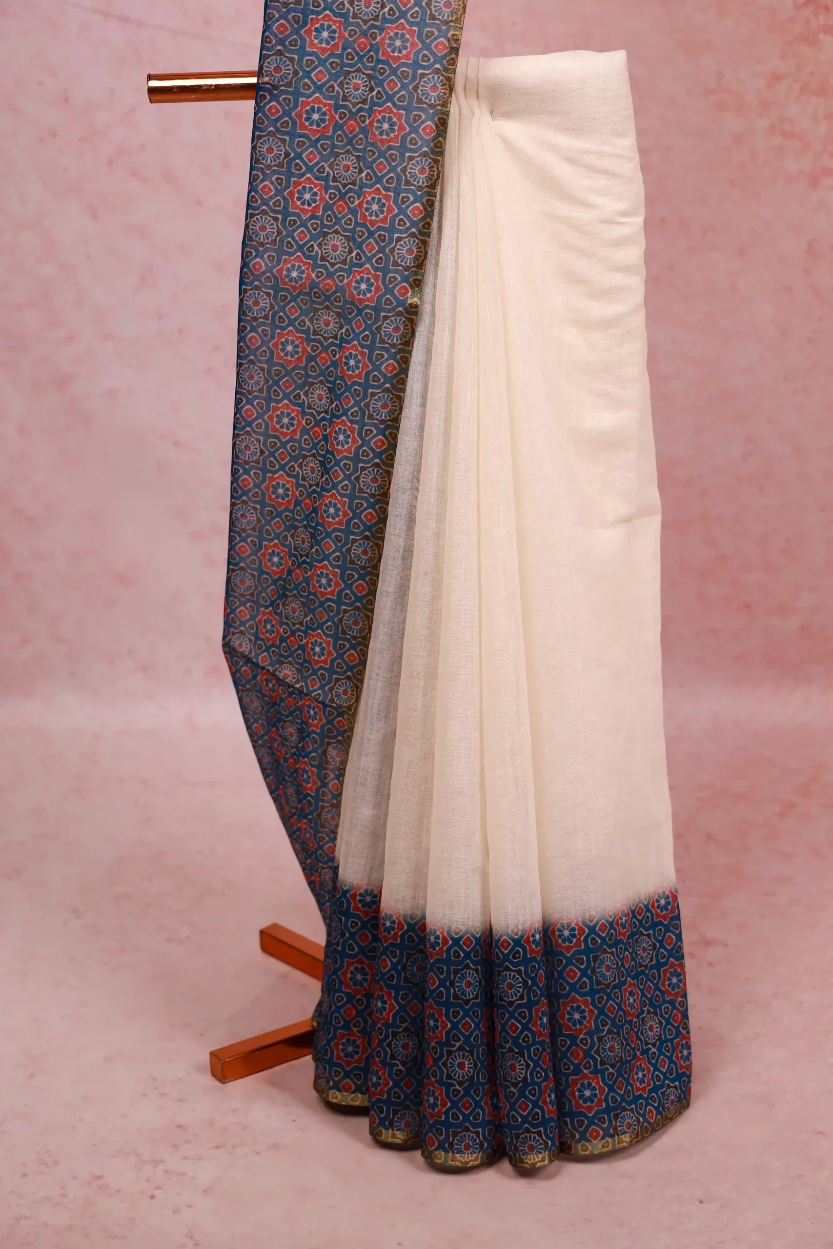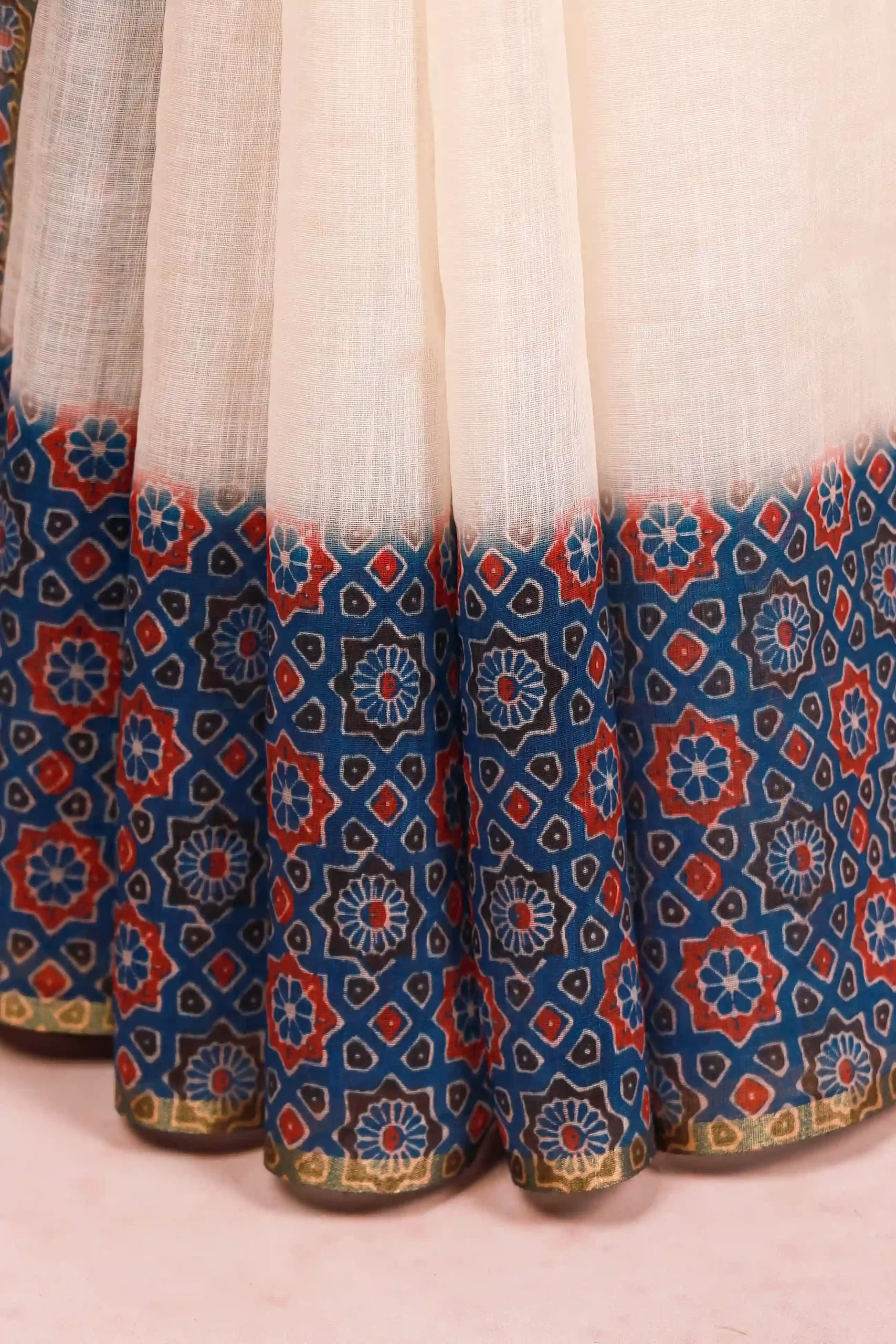 Off White Semi Linen Kerala Plain Saree with Small Border. Includes Unstitched Blouse