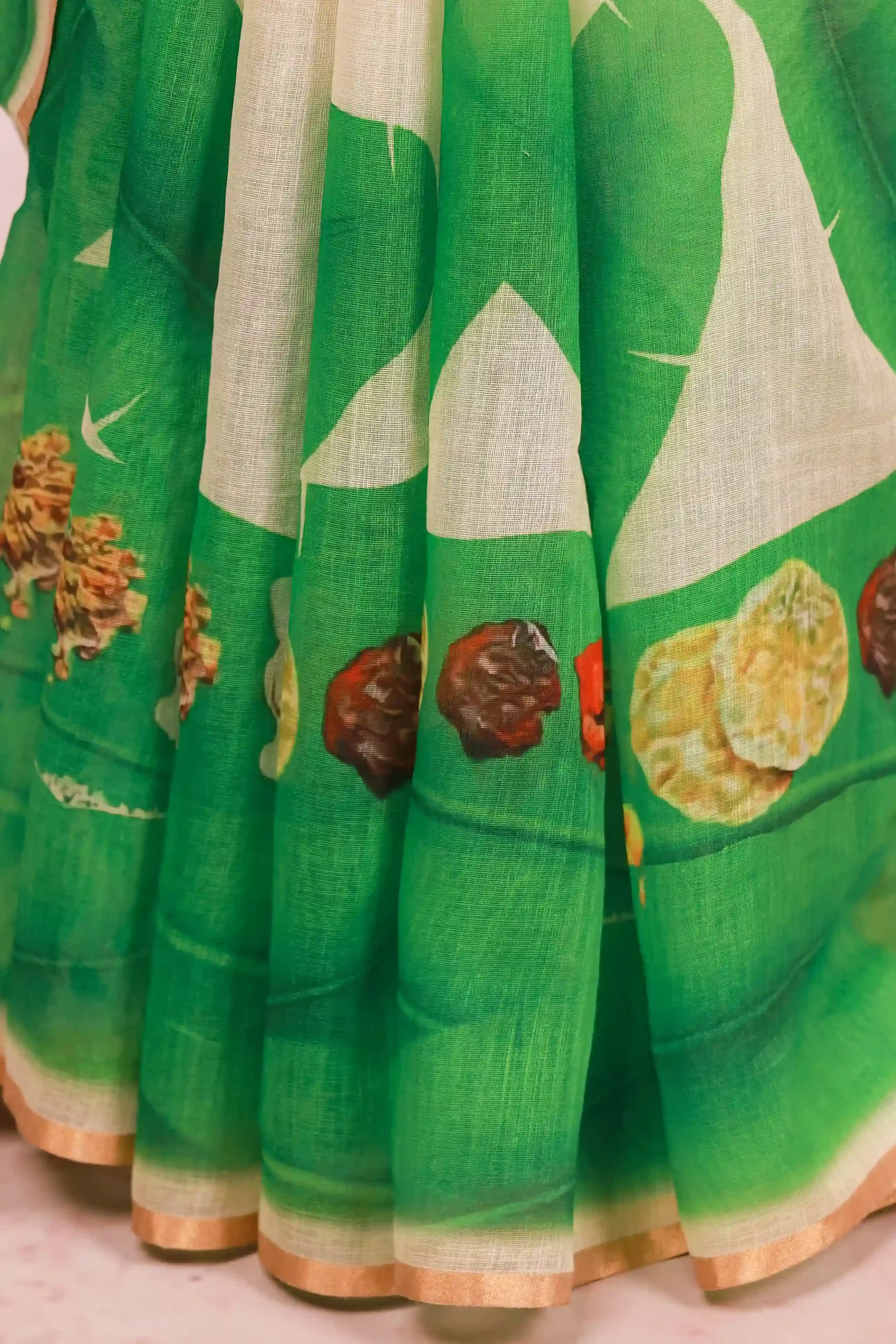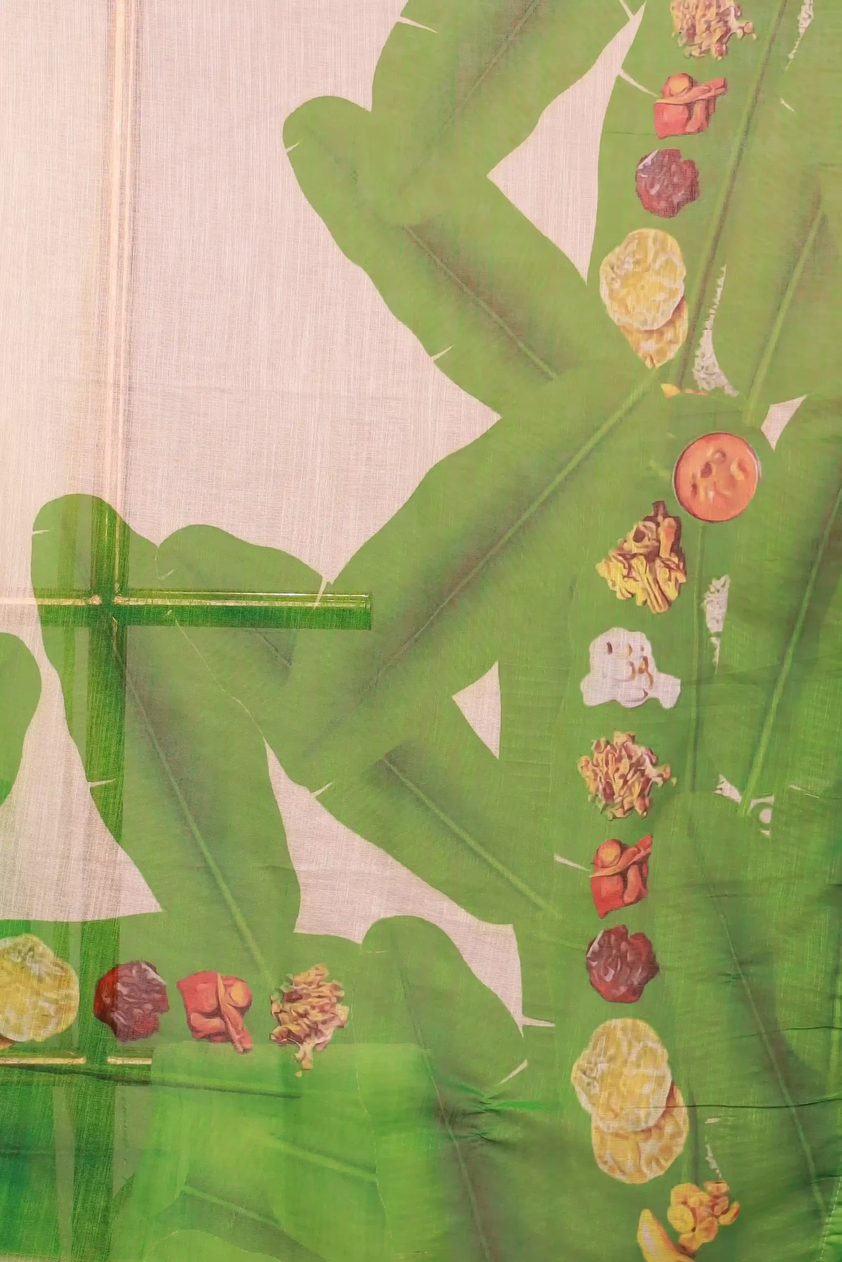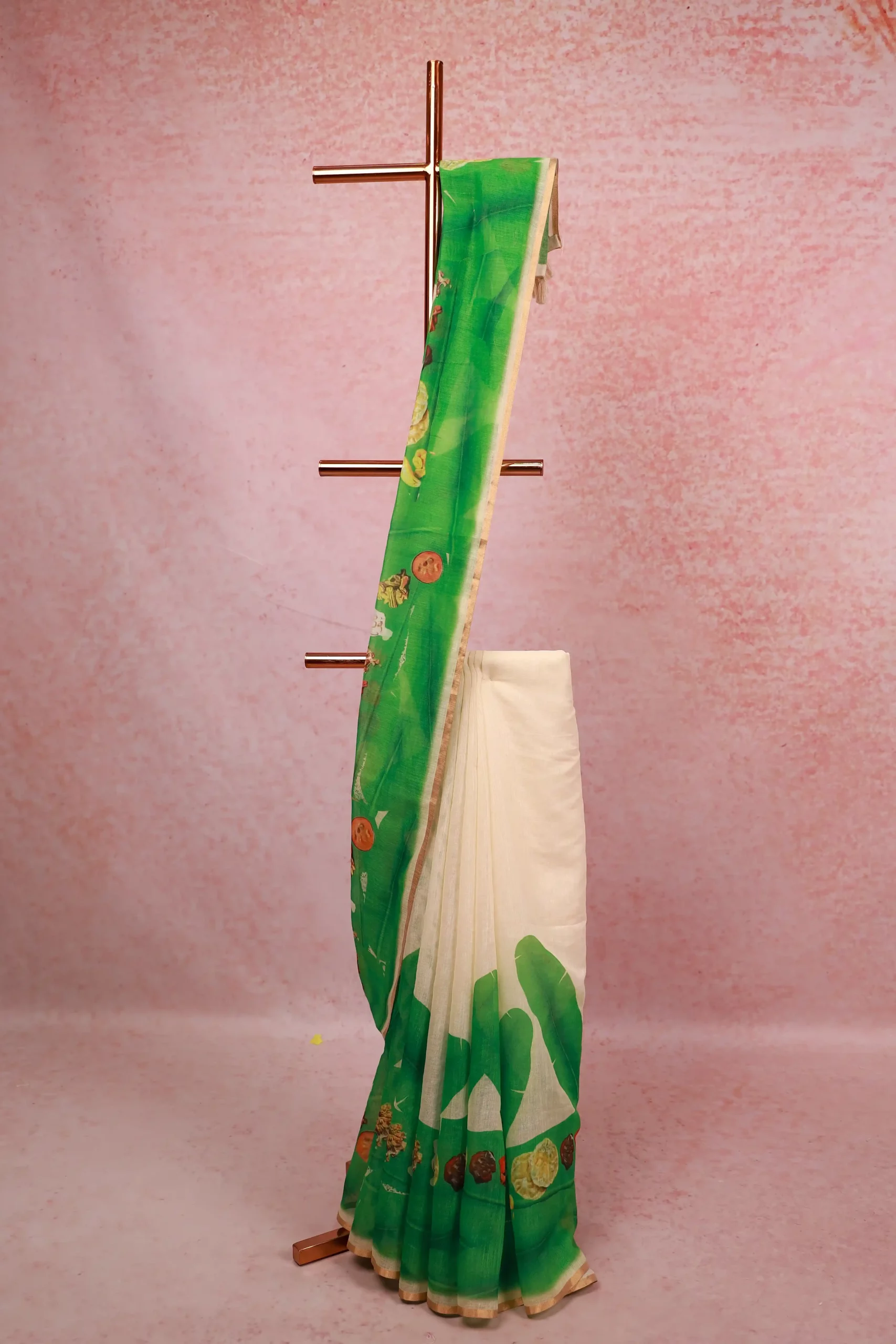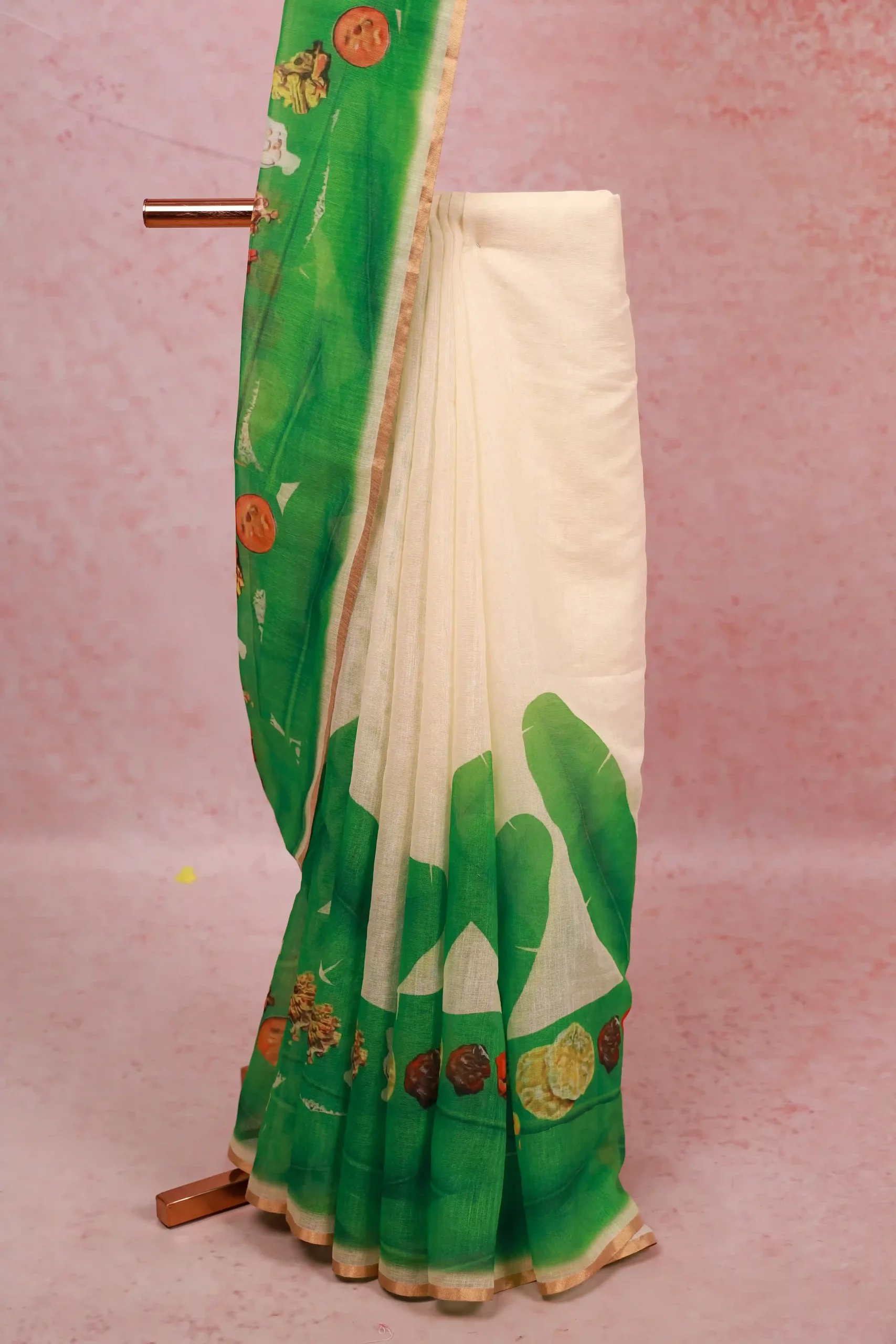 Off White Semi Linen Kerala Printed Saree with Small Border. Includes Unstitched Blouse