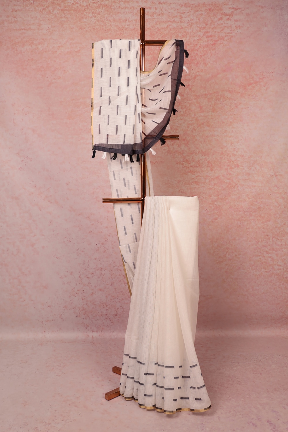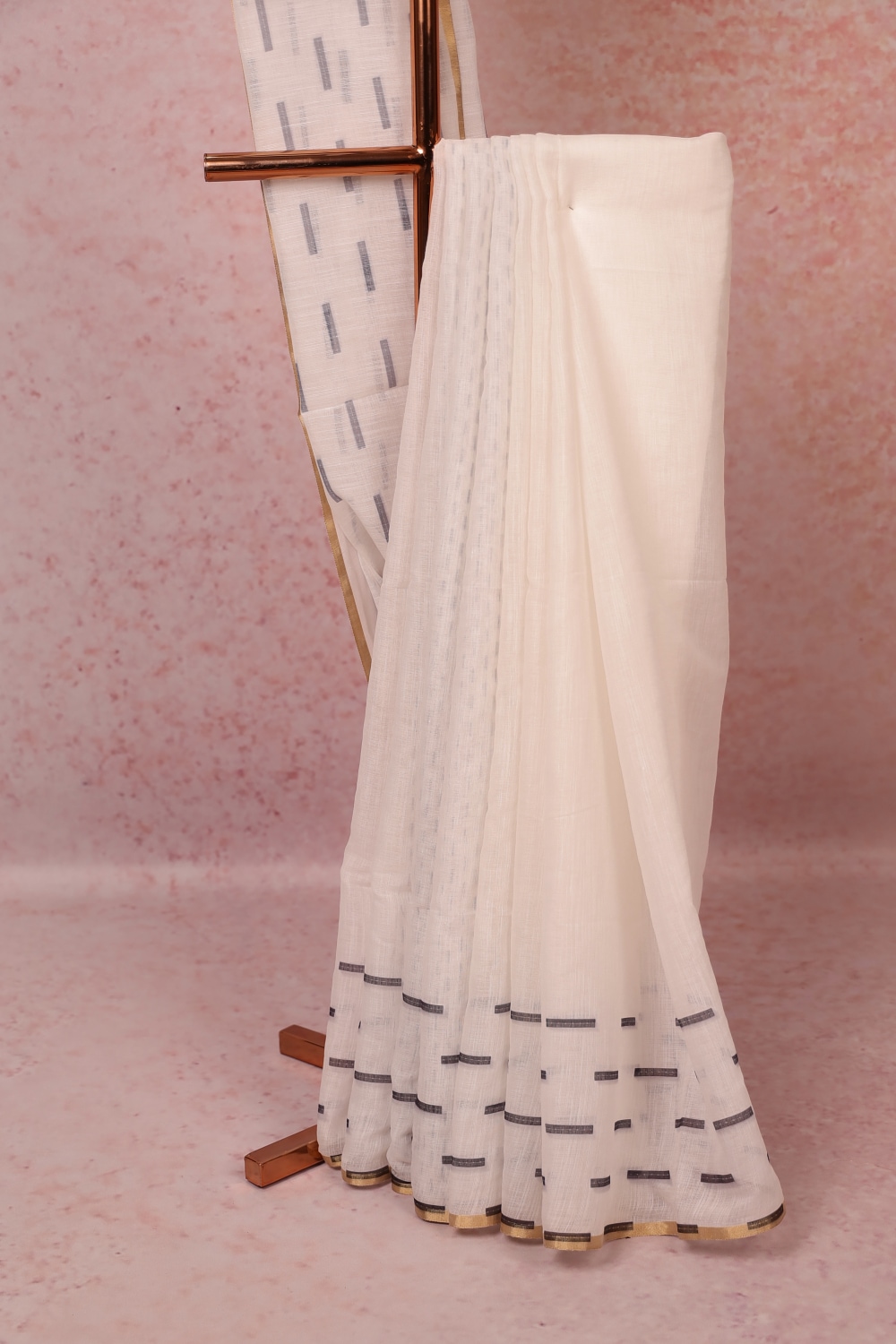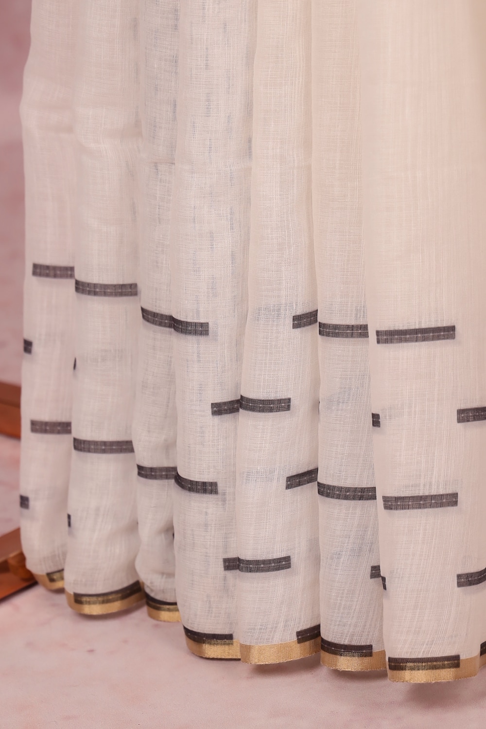 Off White Semi Linen Printed Saree with Small border. Includes Unstitched Blouse