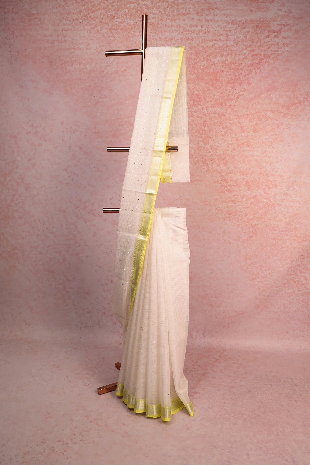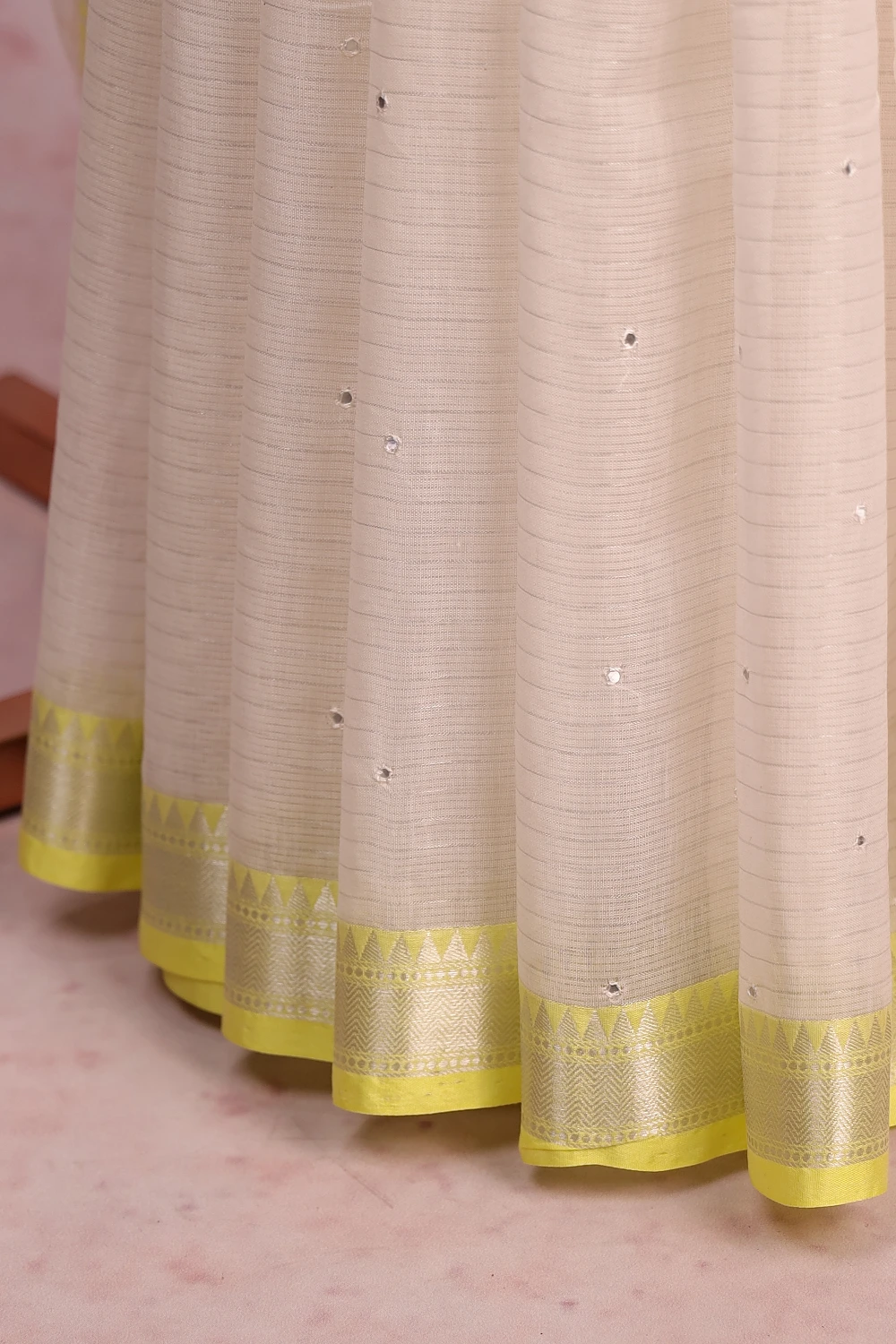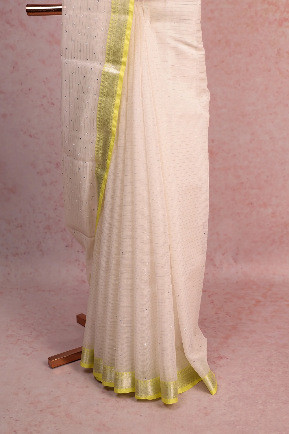 Off White Semi Silk Lines With Sequines Saree with Contrast Border. Includes Un stitched Blouse