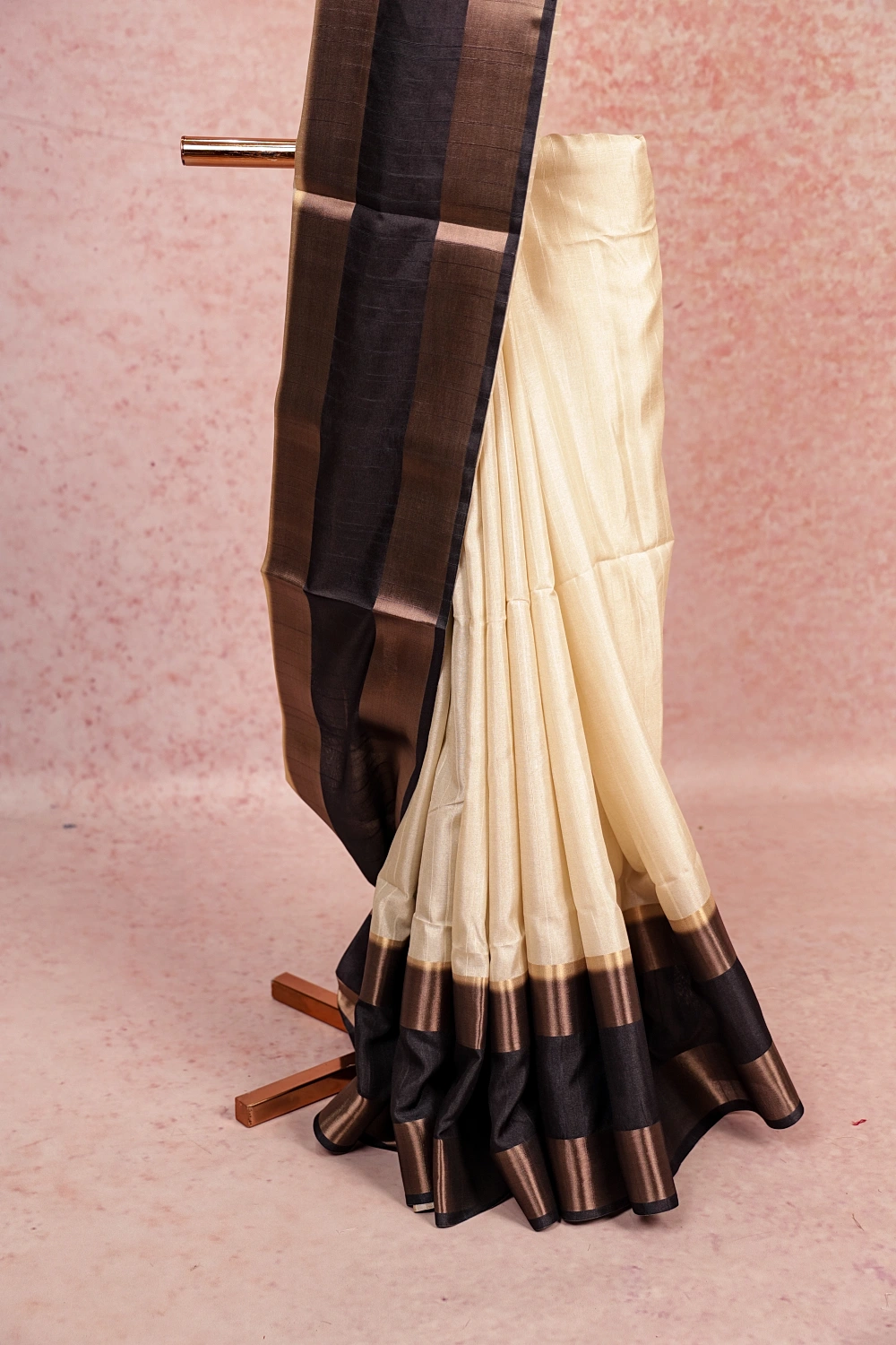 Off White Semi Tussar Stripes Saree With Plain Border. Includes Unstitched Blouse