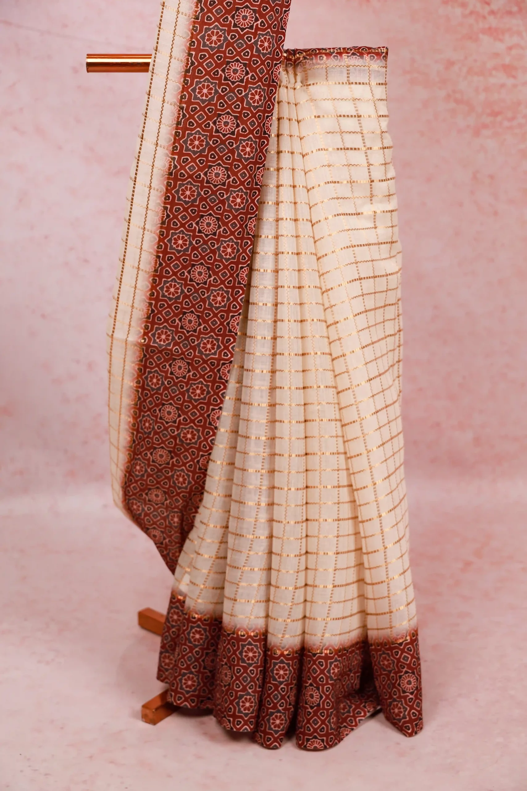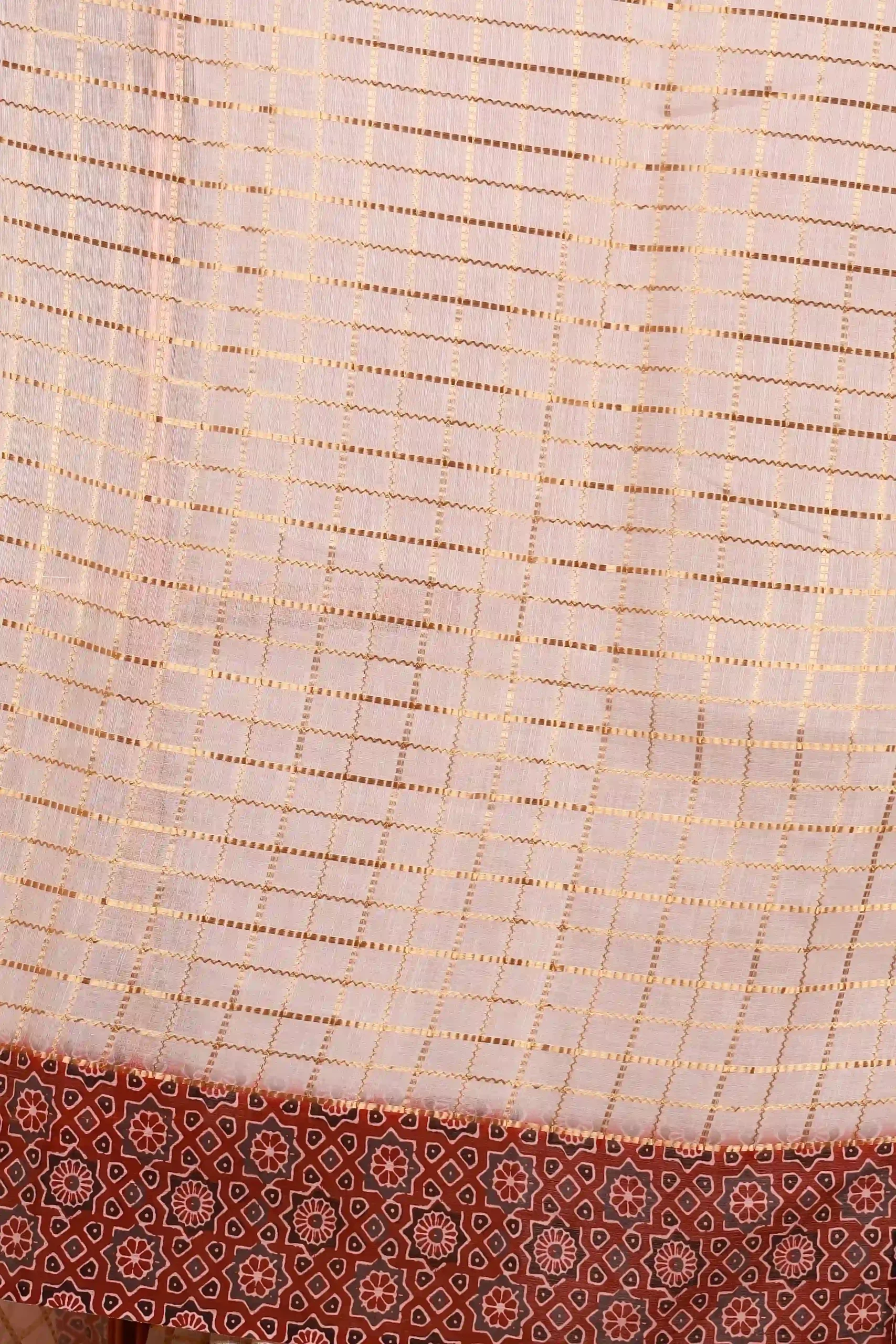 Off White Tissue Kota Kerala Check Saree with Printed Border. Includes Unstitched Blouse