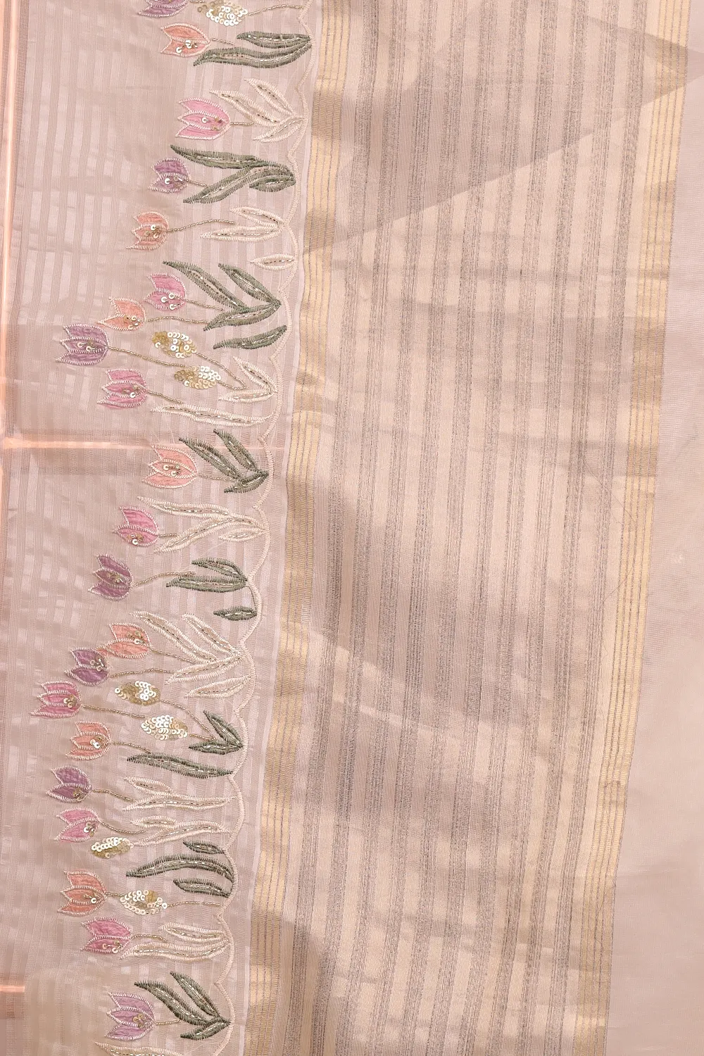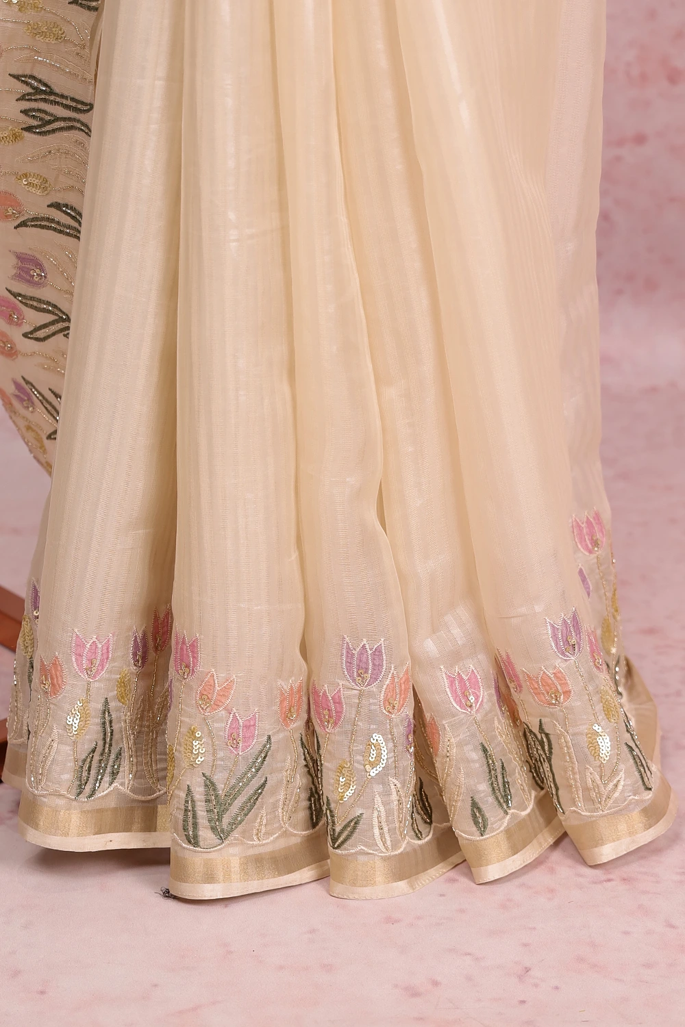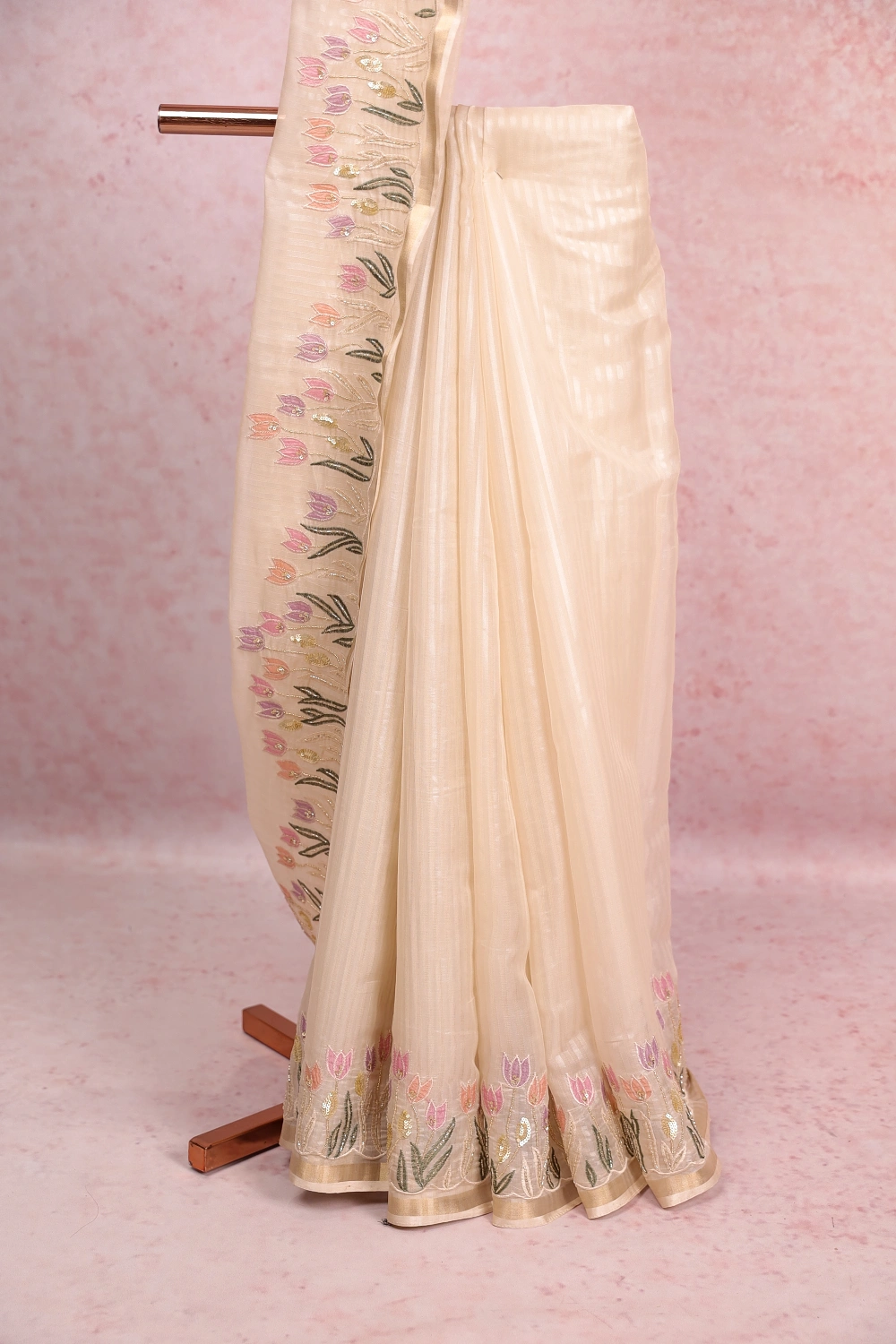 Off White Tissue Organza Lines Saree With Hand Work Border. Includes Un Stitched Blouse
