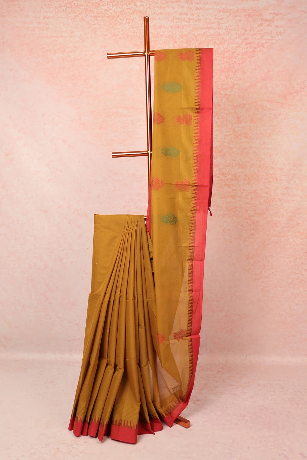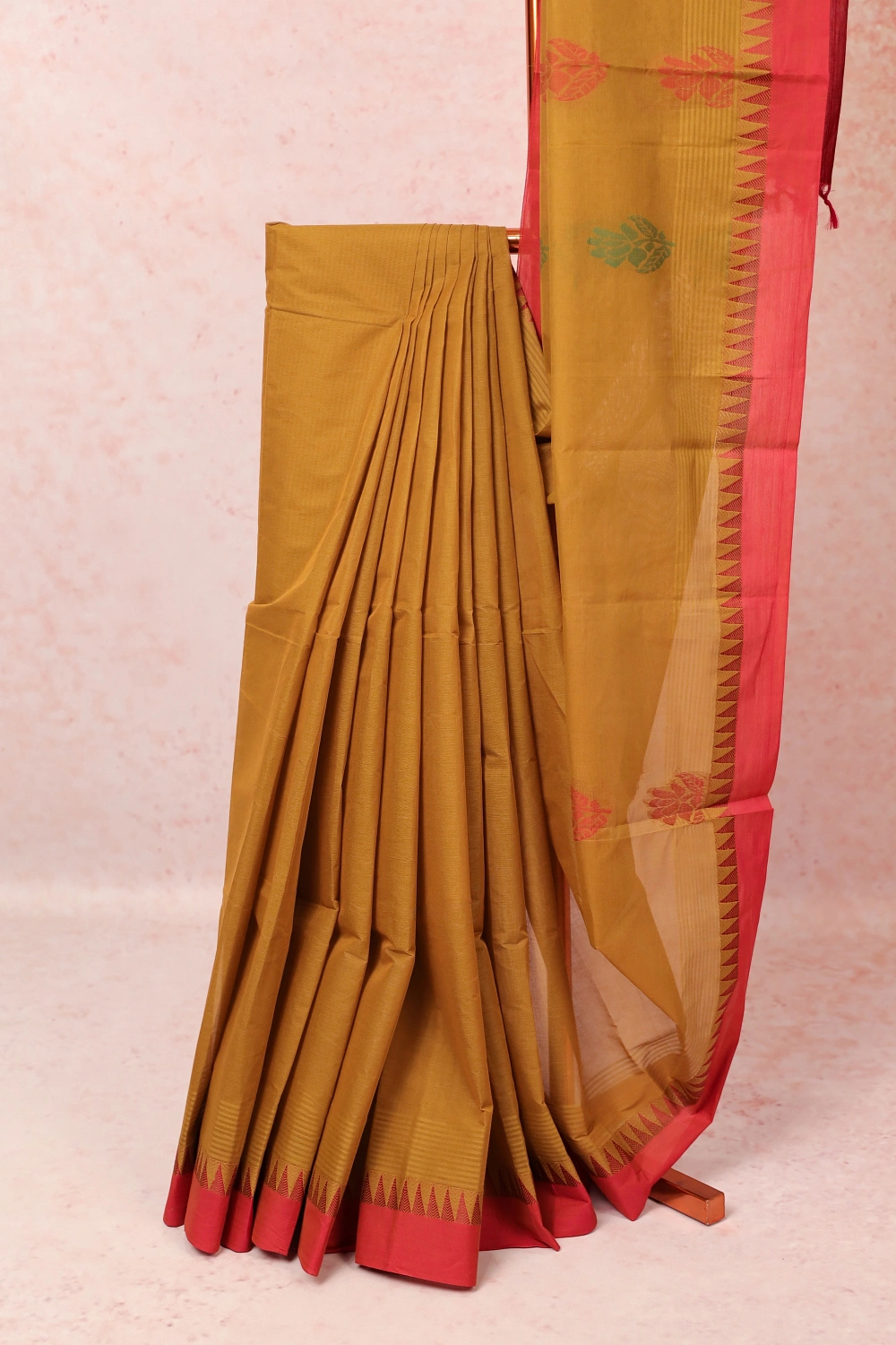 Olive Green Cotton Butta Saree with Plain border. Includes Unstitched Blouse
