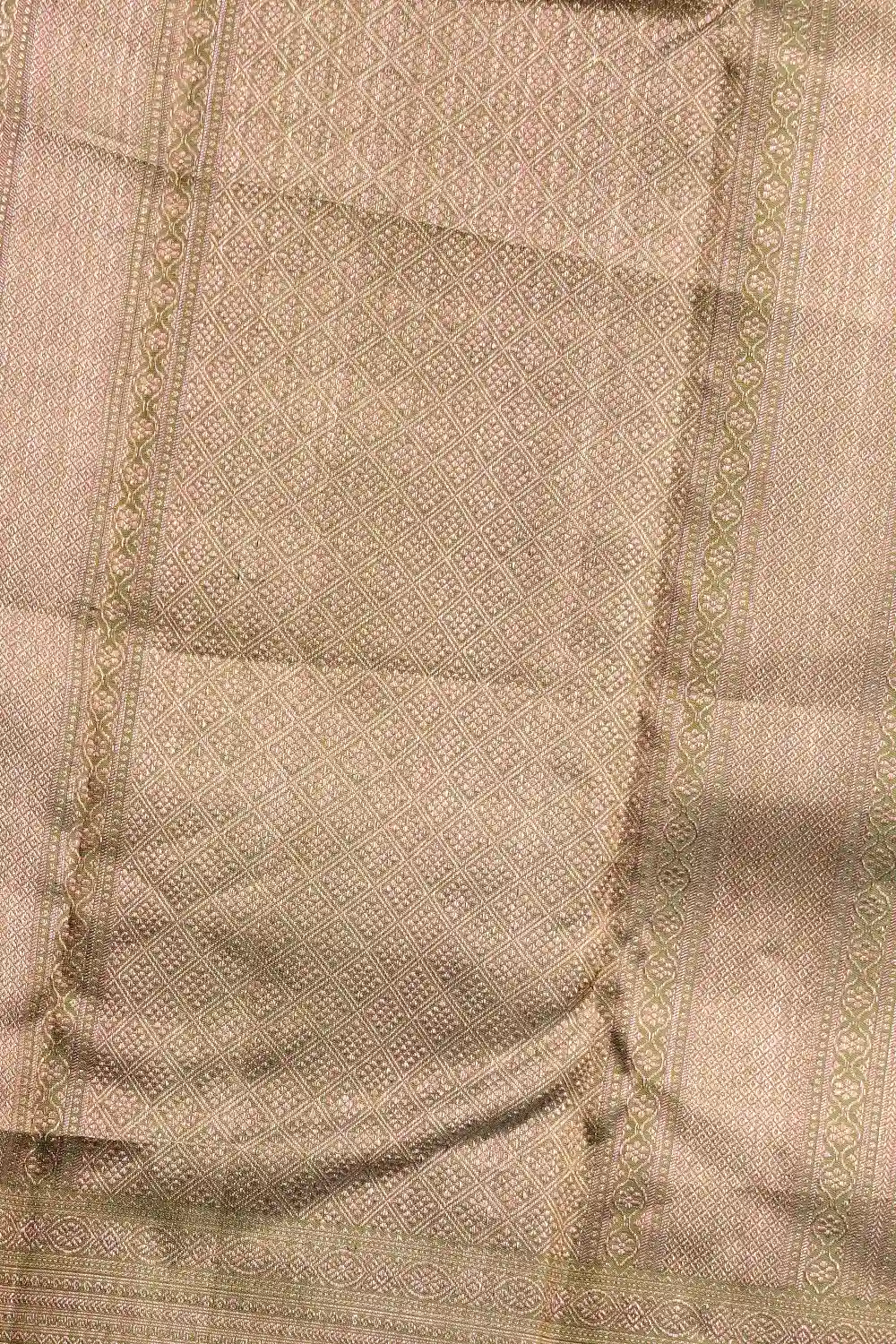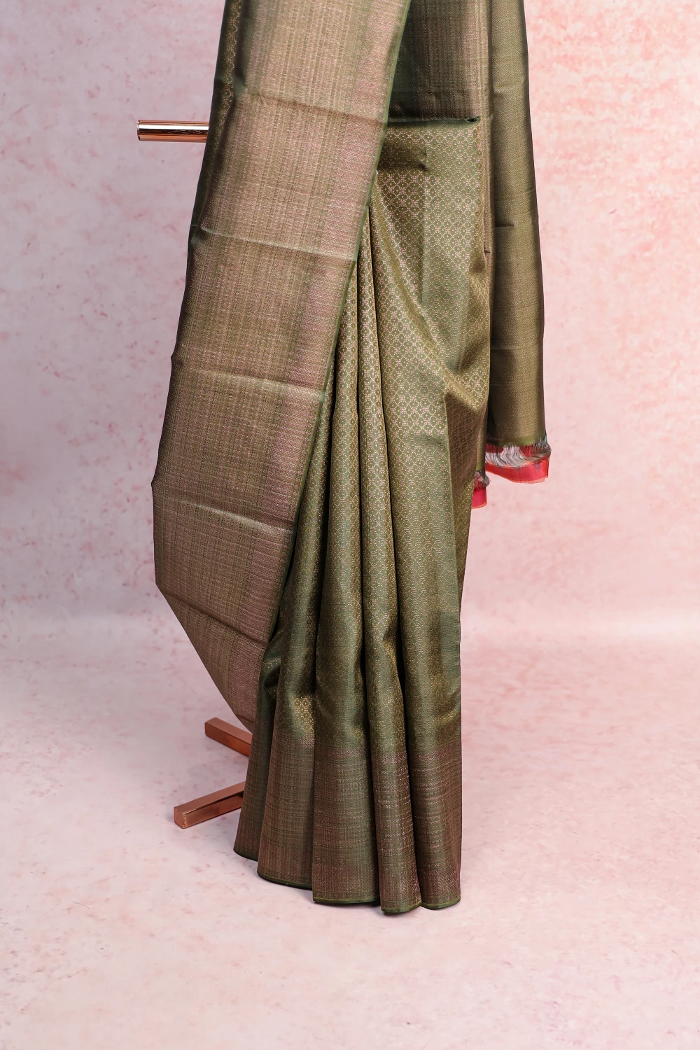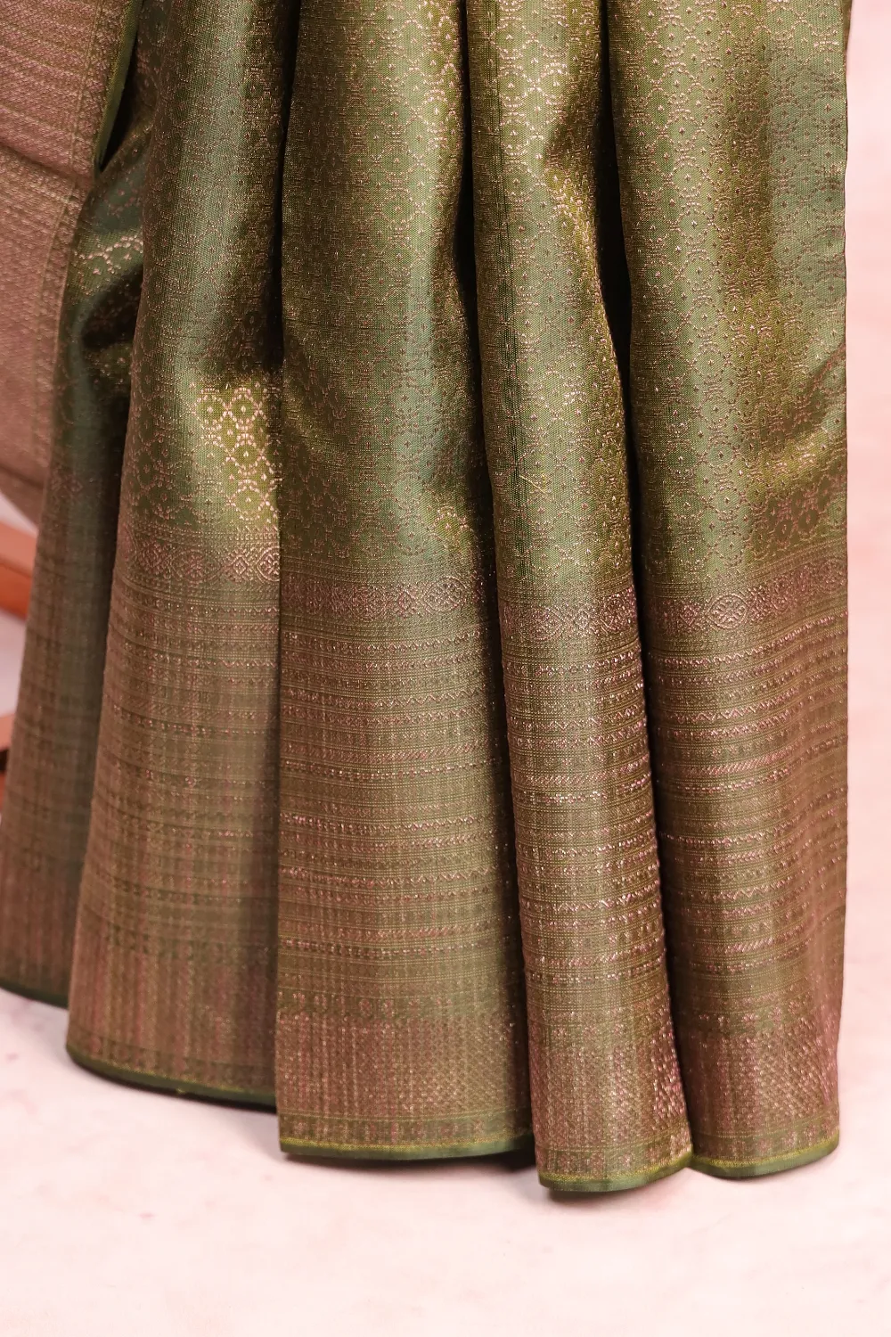 Olive Green Kancheepuram Silk Brocade Saree with Line Border. Includes Unstitched Blouse