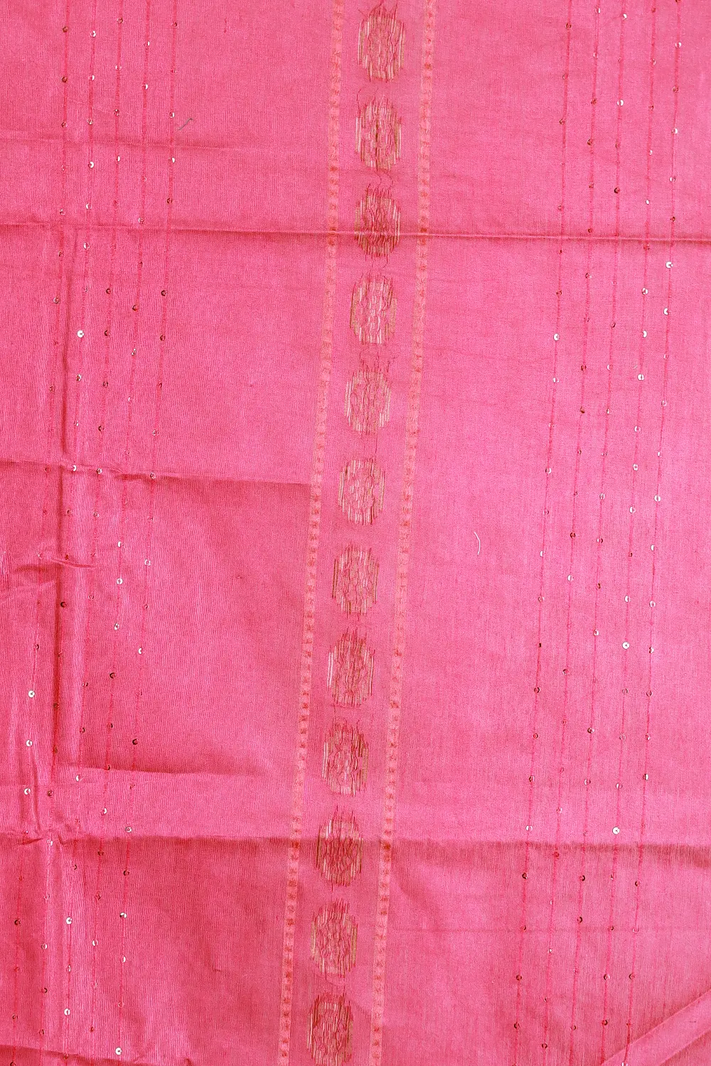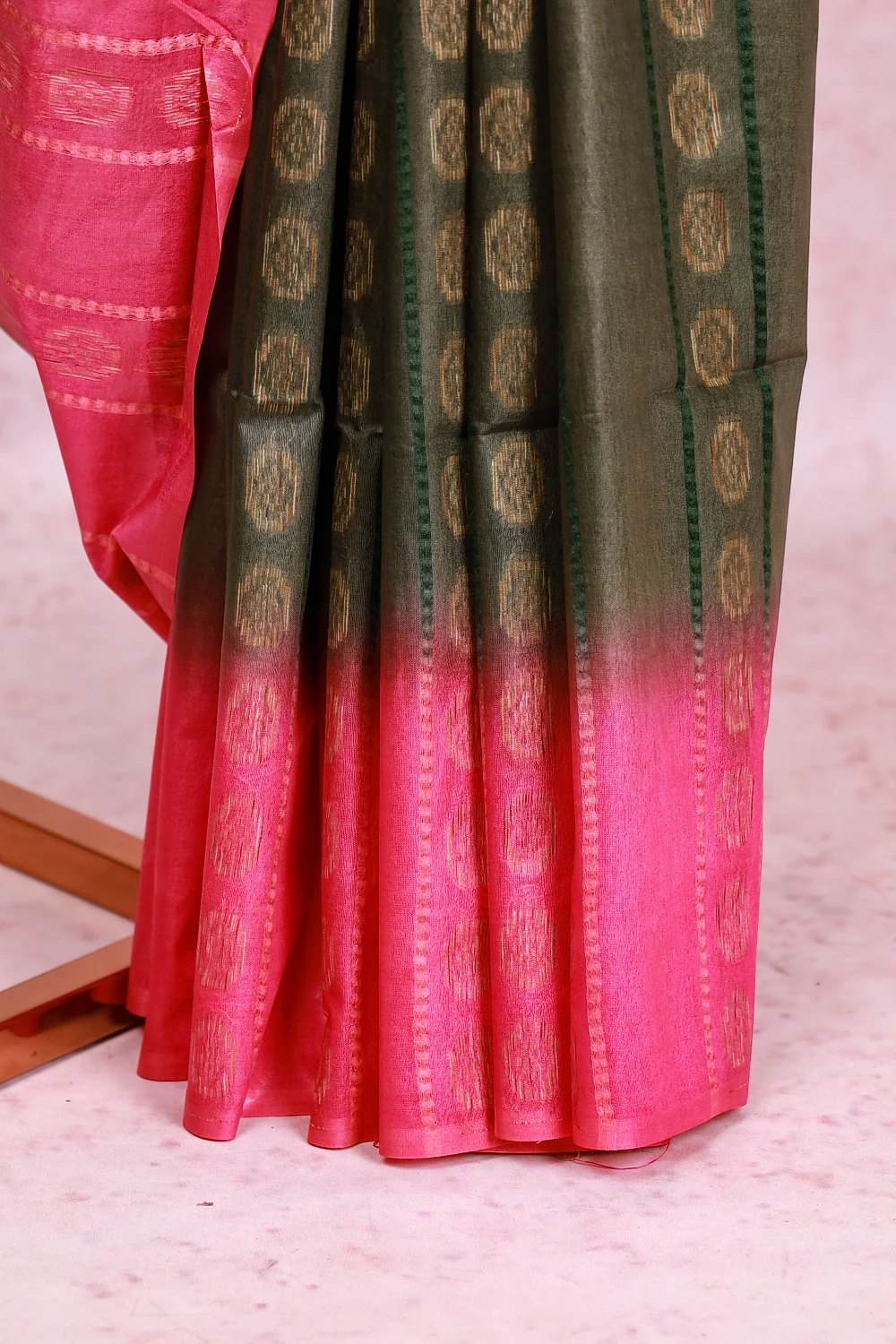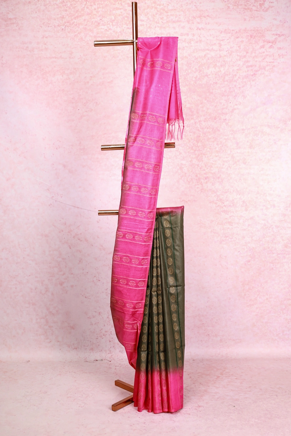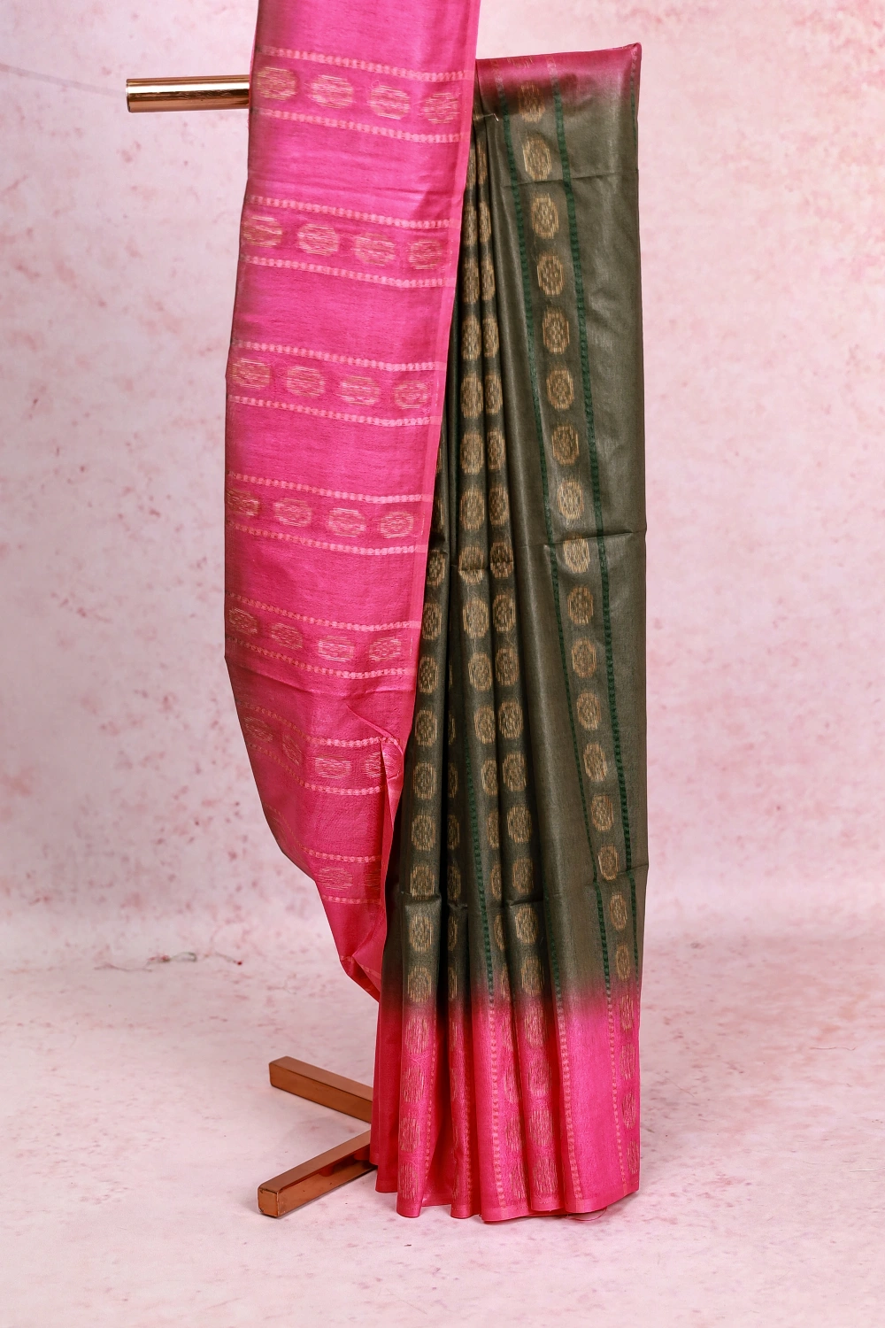 Olive Green Semi Tussar Self Work Saree With Contrast Colour Border. Includes Un Stitched Blouse