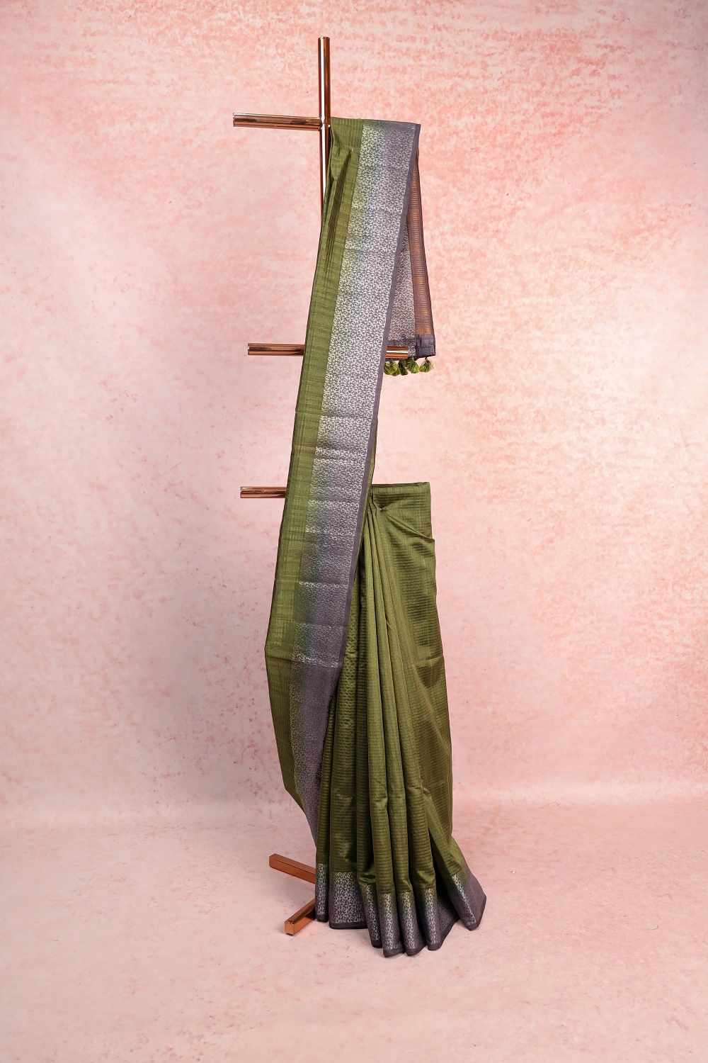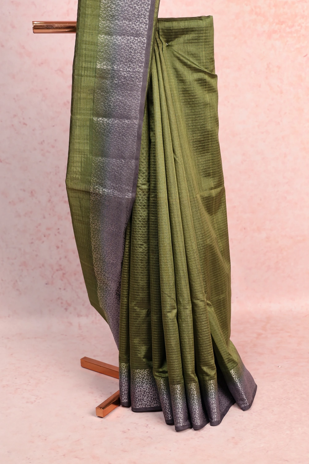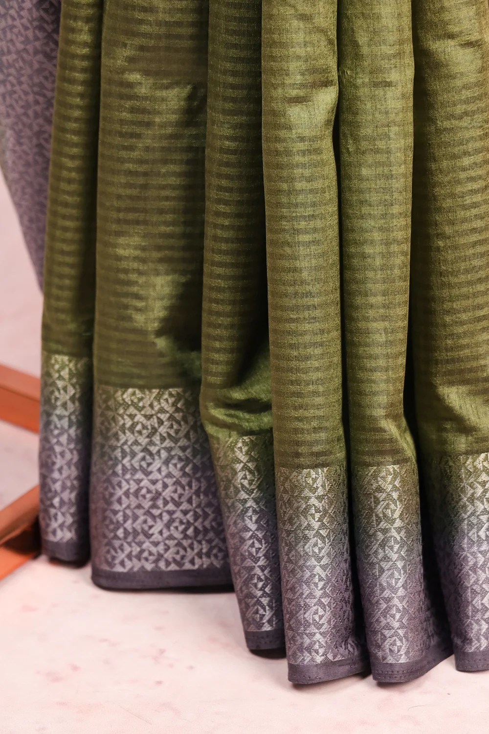 Olive Green Semi Tussar Self Design Saree with Designer Border. Includes Un stitched Blouse