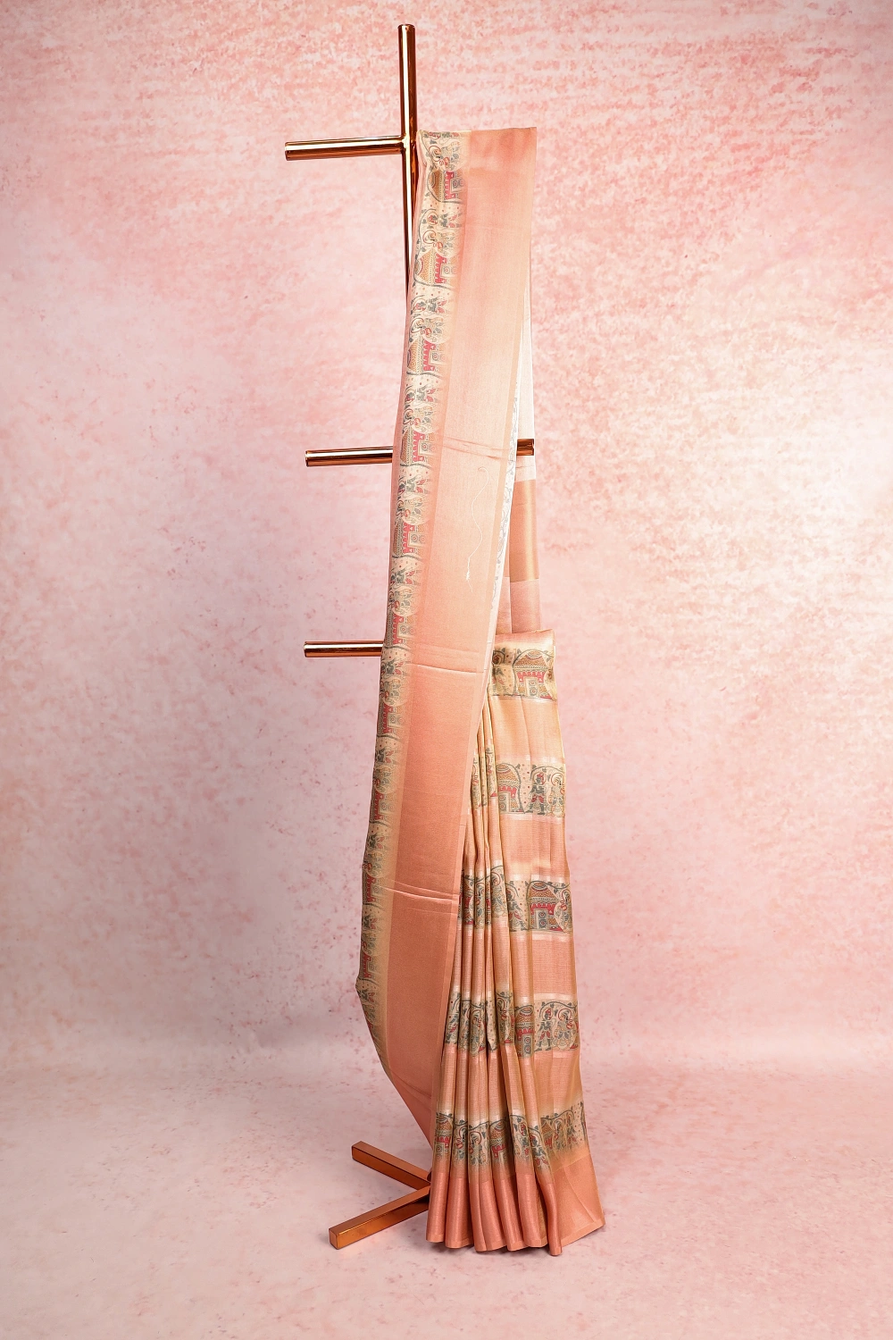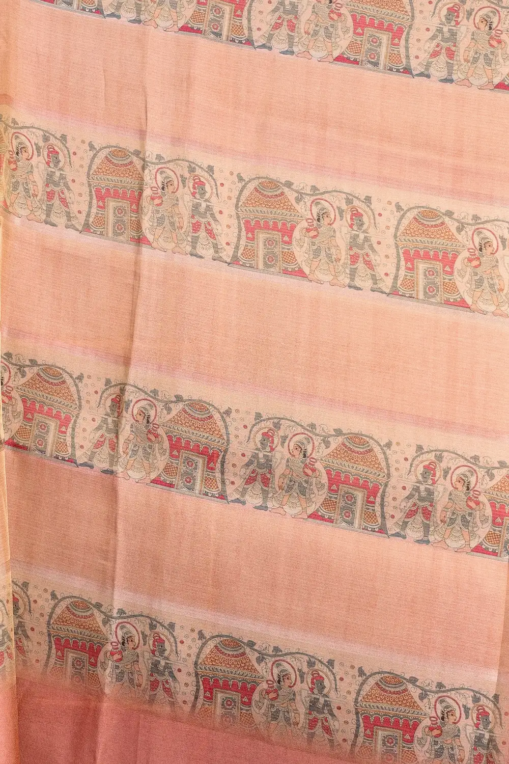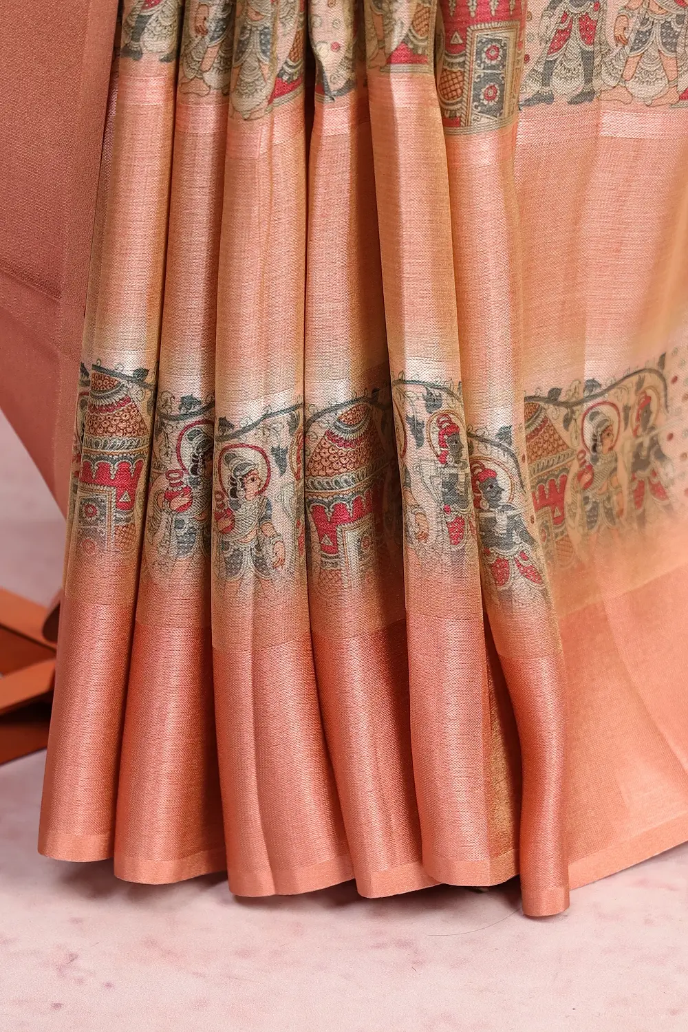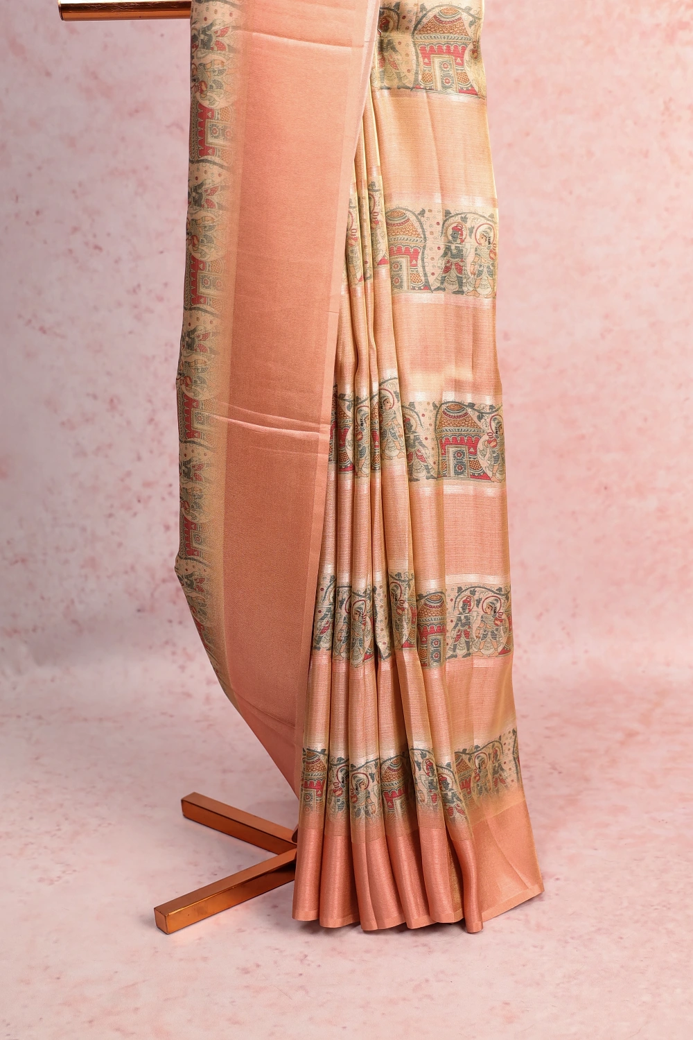 Onion Color TissueJute Printed with Plain Border. Includes Un stitched Blouse
