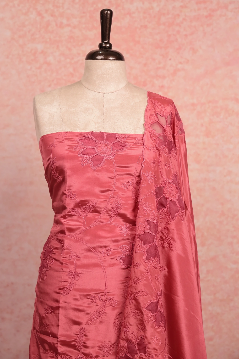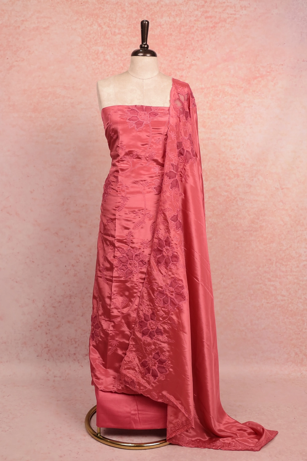 Onion Pink Crepe Applic Work Unstitched Churidar Material. Includes Dupatta.