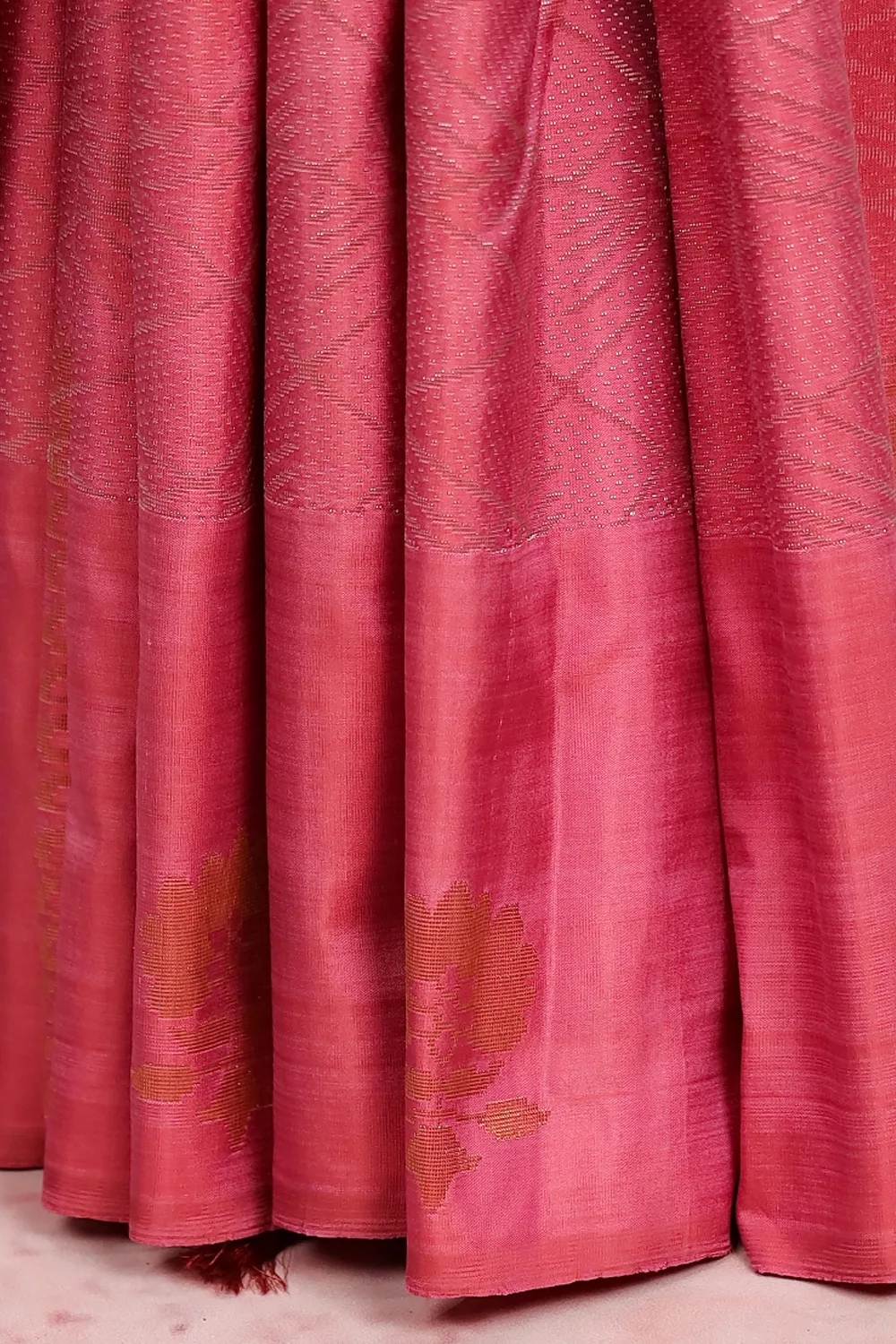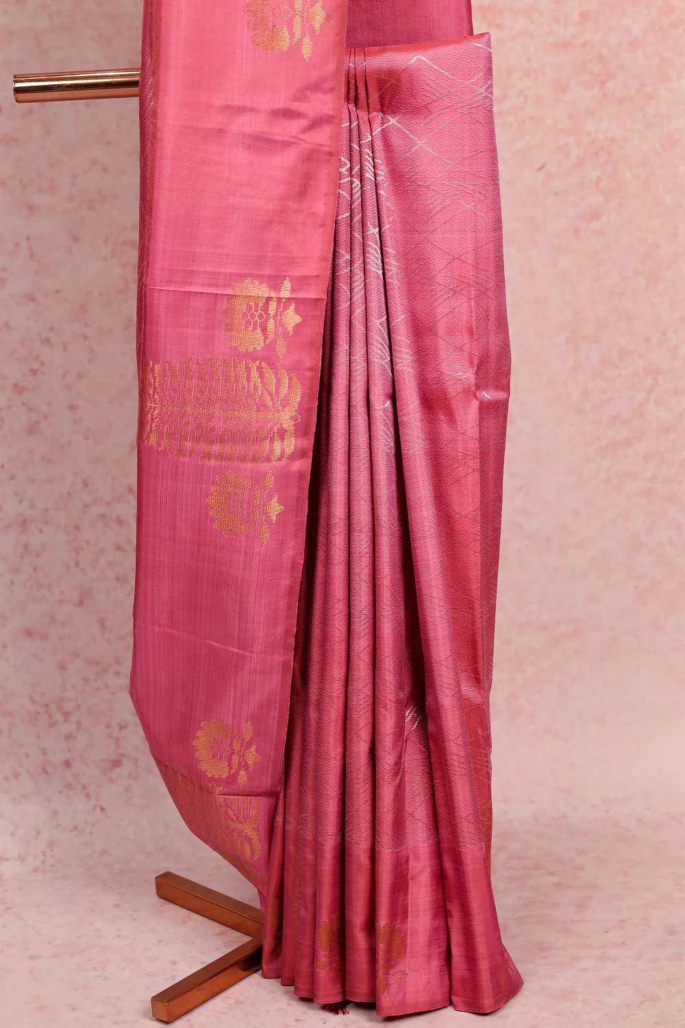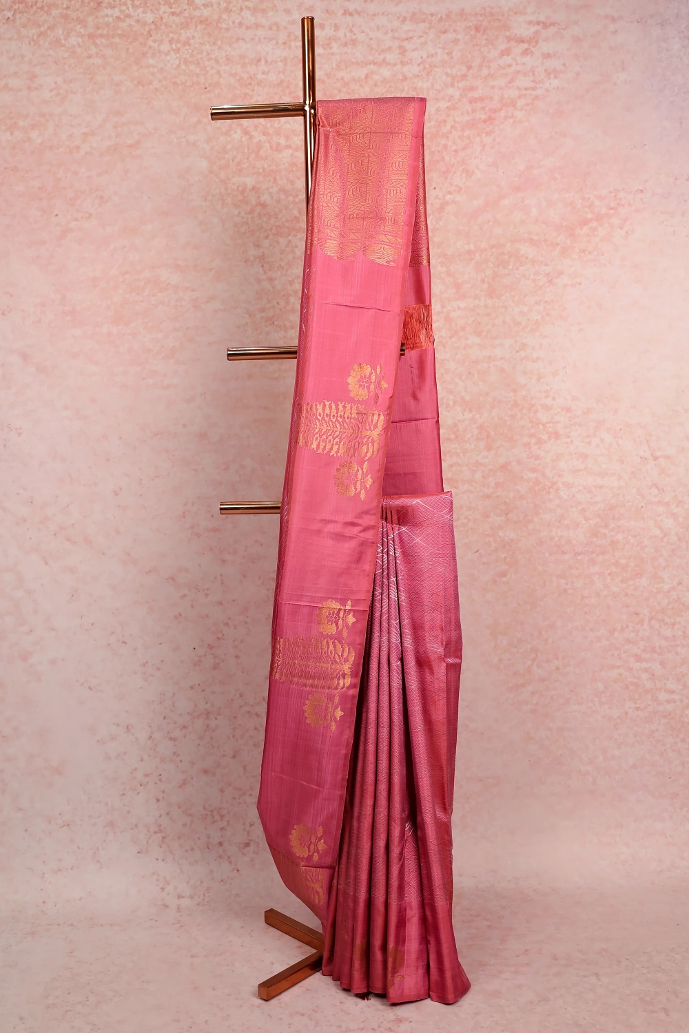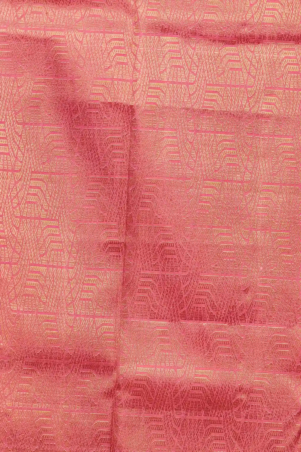 Onion Pink Kancheepuram Silk Zari Design Saree with Designer Border. Includes Unstitched Blouse