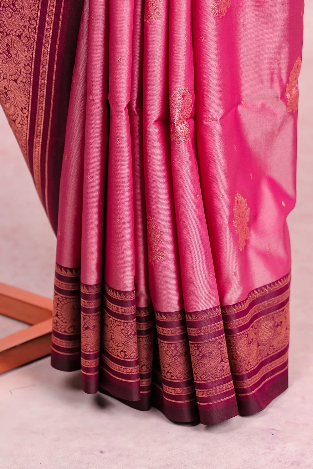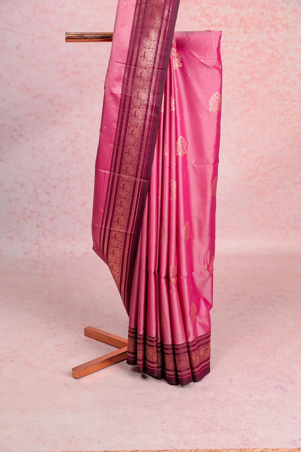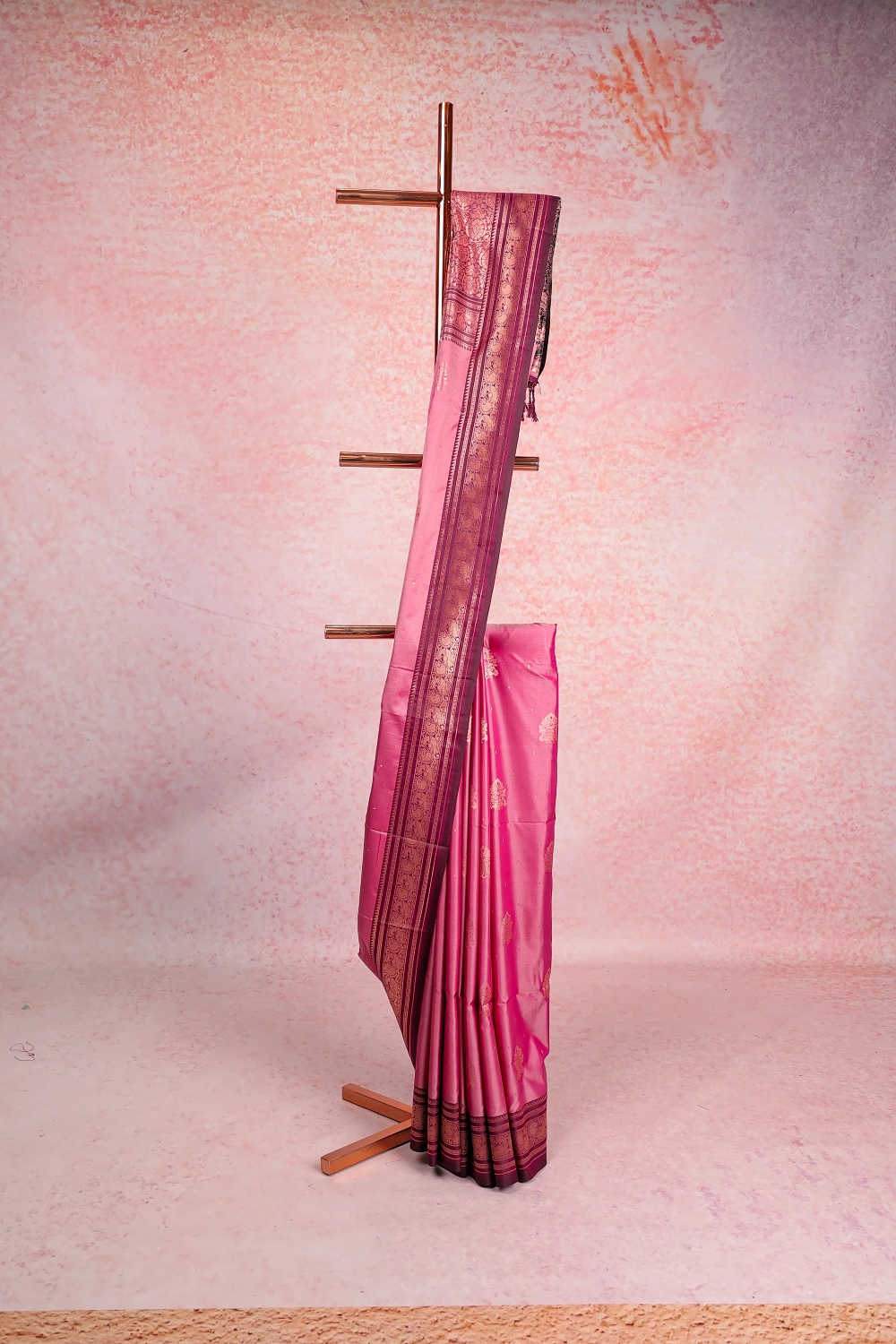 Onion Pink Semi Silk Brocade Saree With Copper Border. Includes Unstitched Blouse