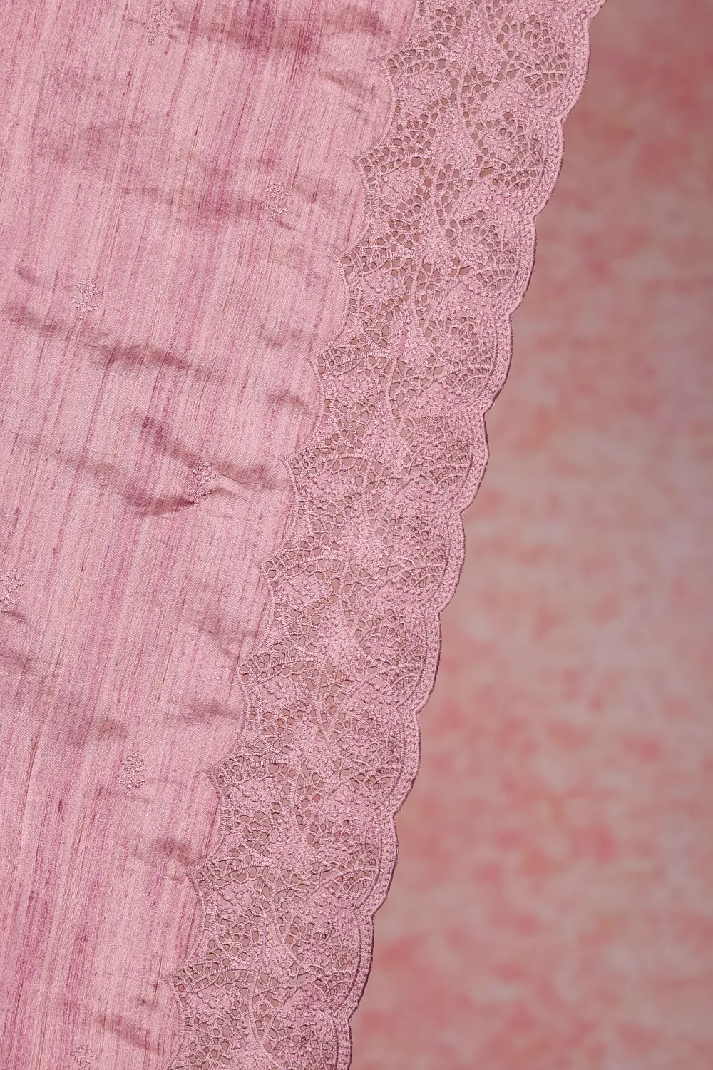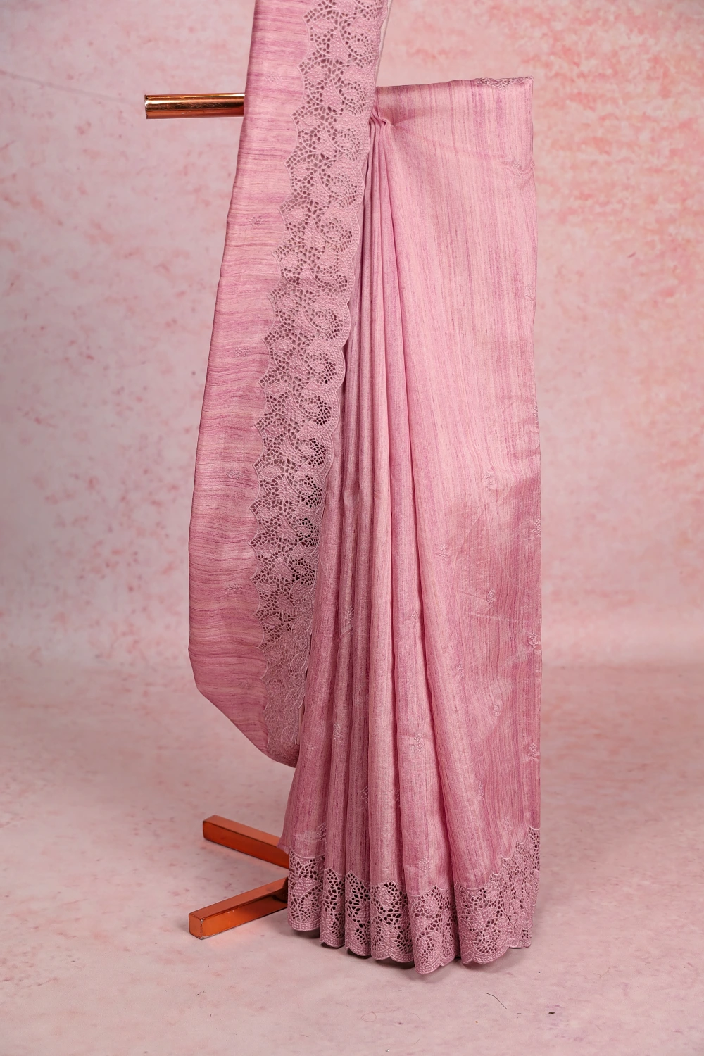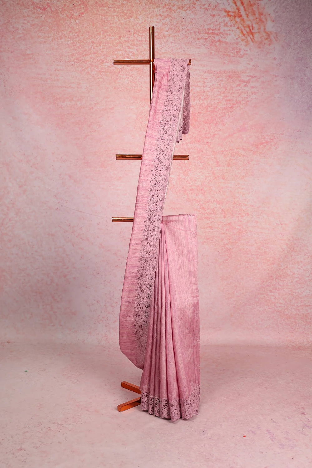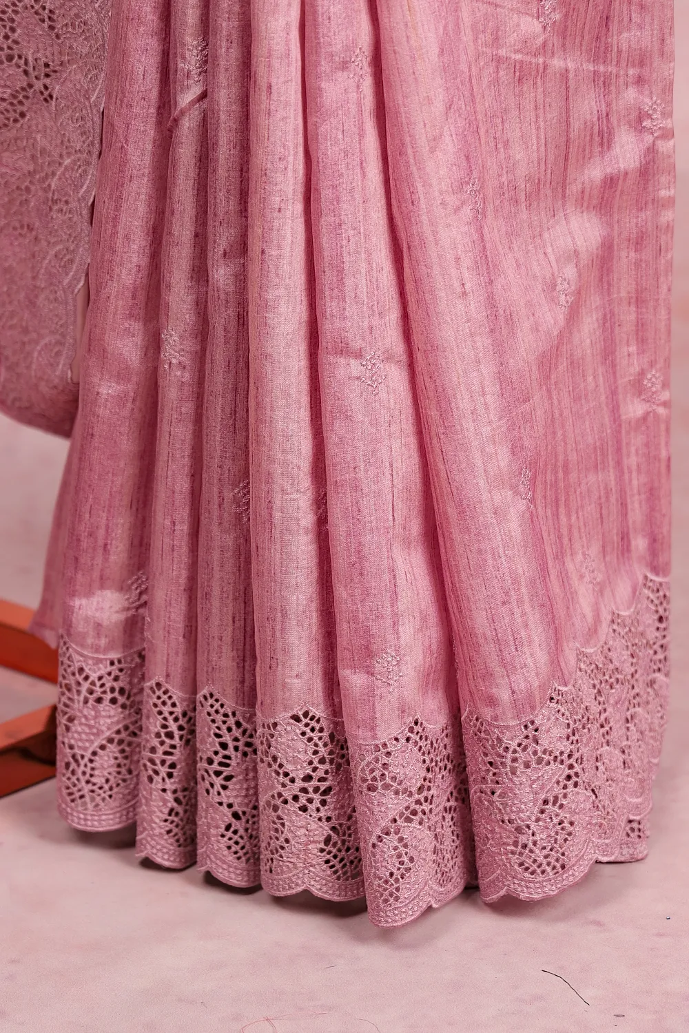 Onion Pink Semi Tussar Cut Work Saree With Cut Work Border. Includes Unstitched Blouse