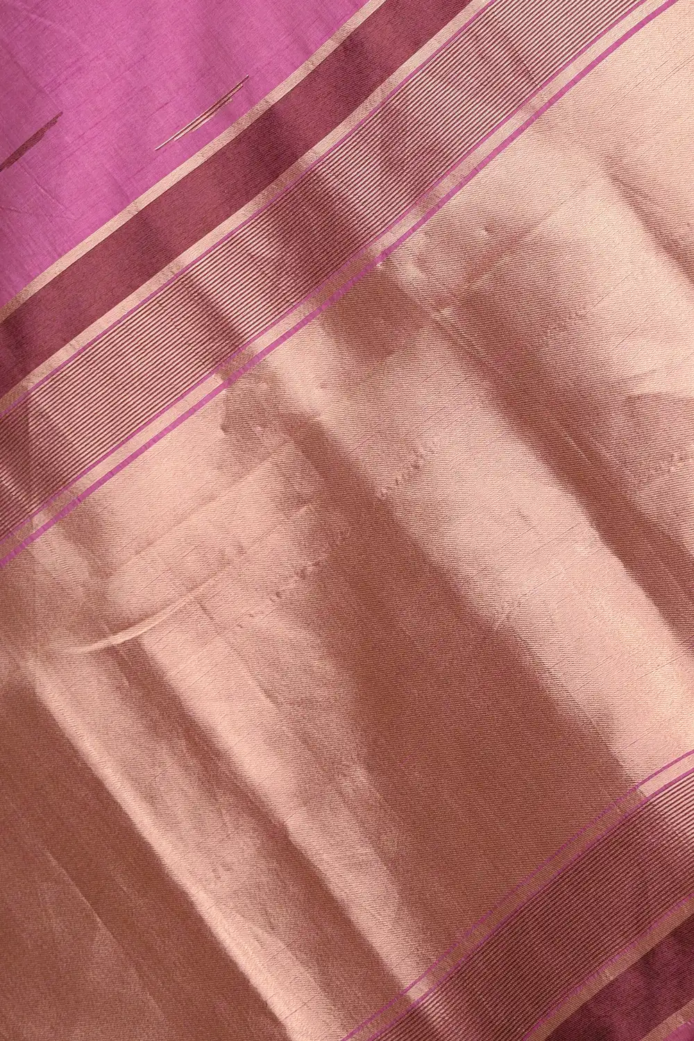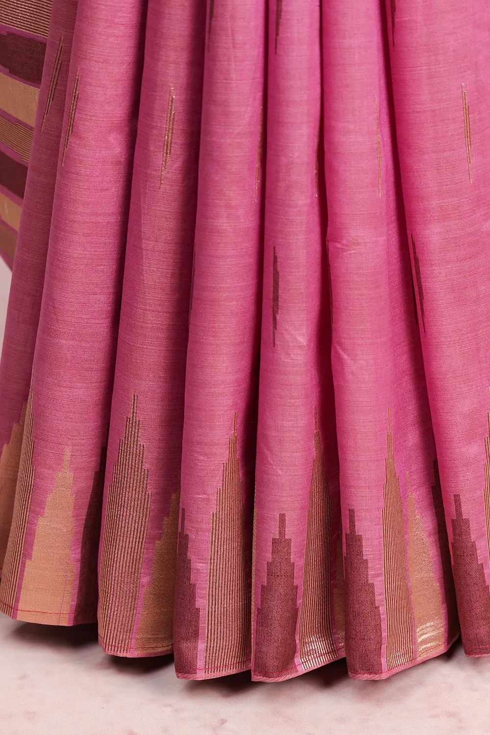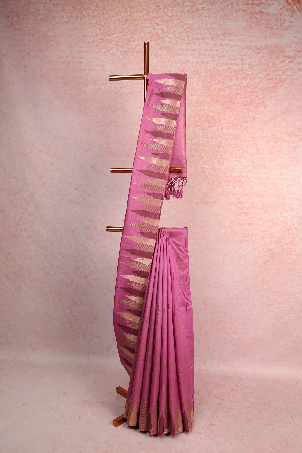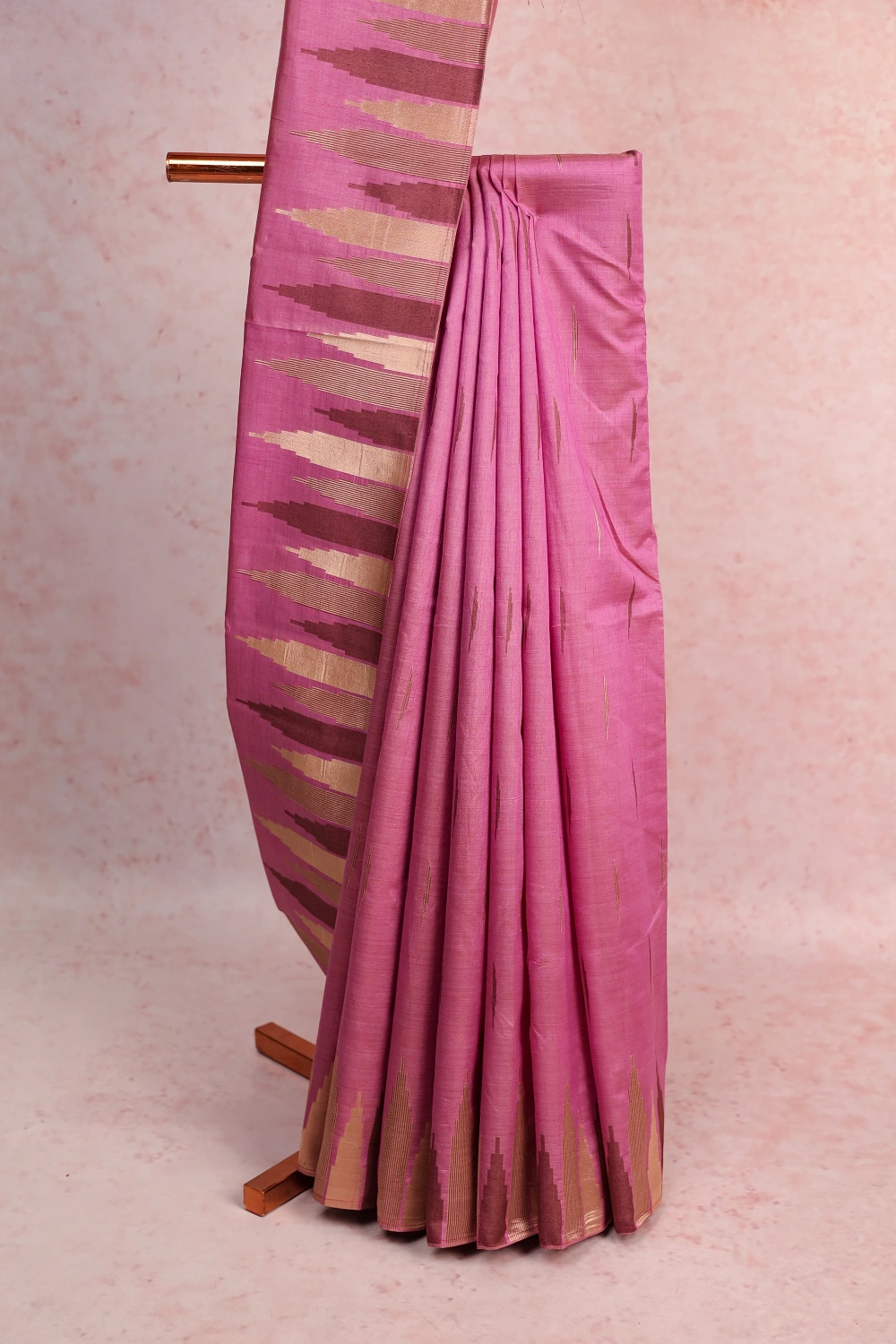 Onion Pink Semi Tussar Zari Design Saree with Temple Border. Includes Unstitched Blouse