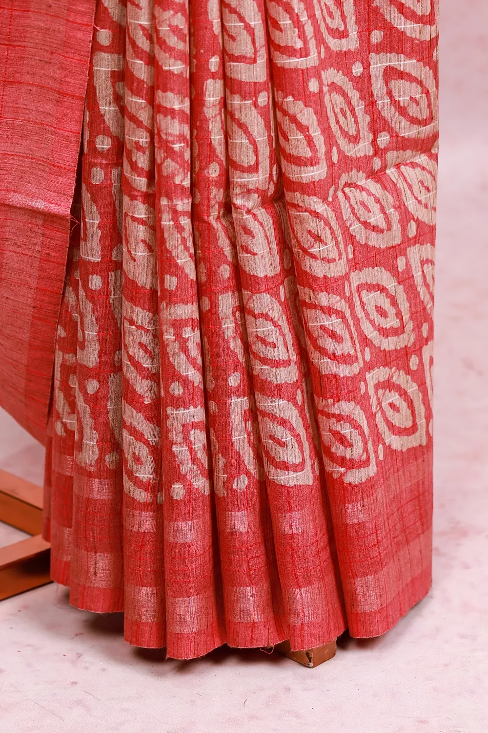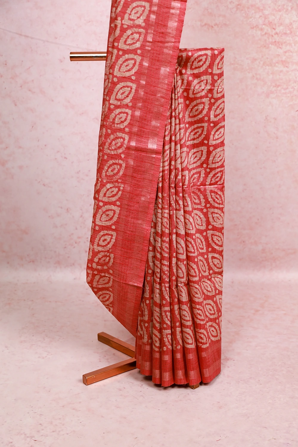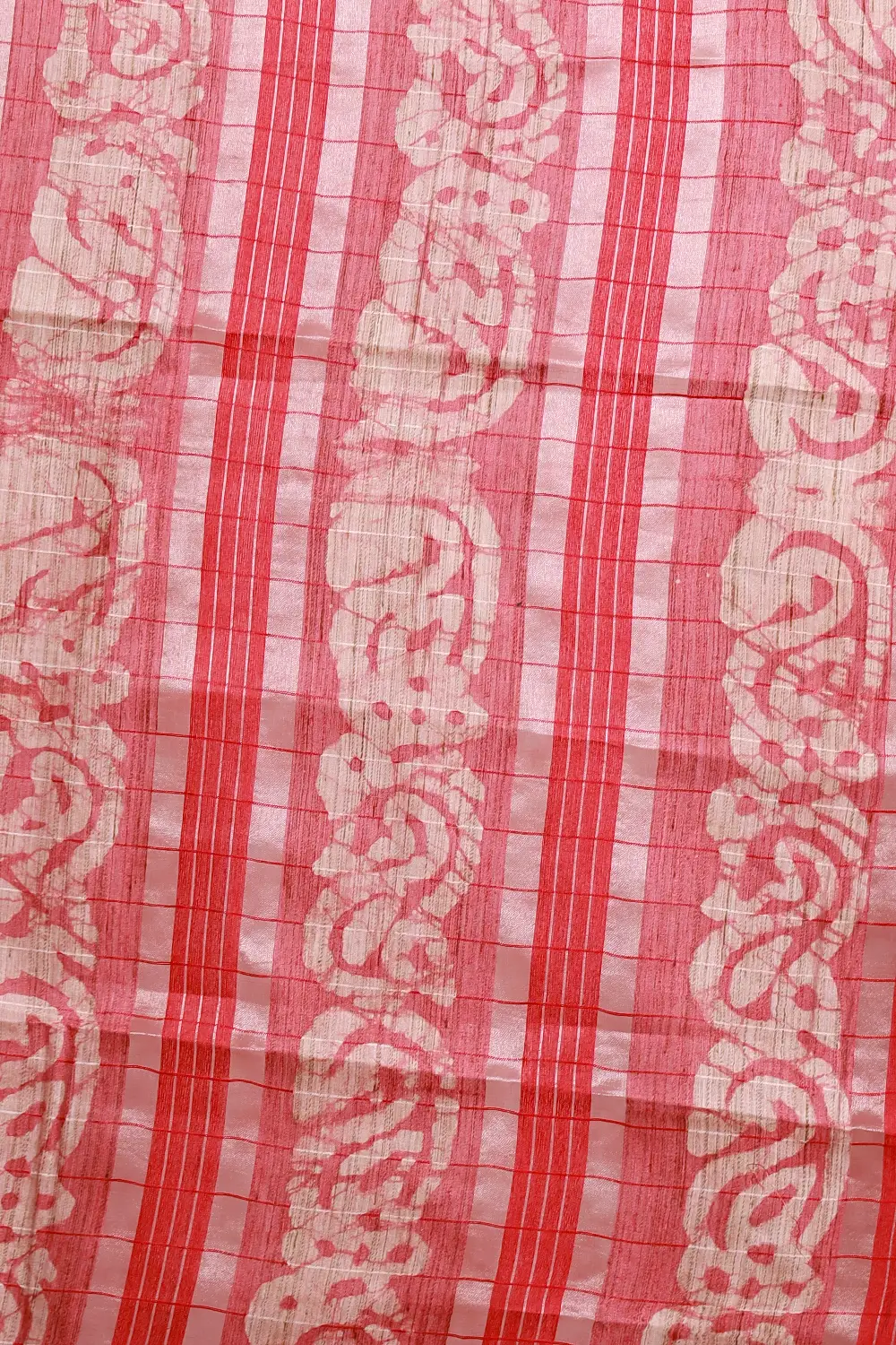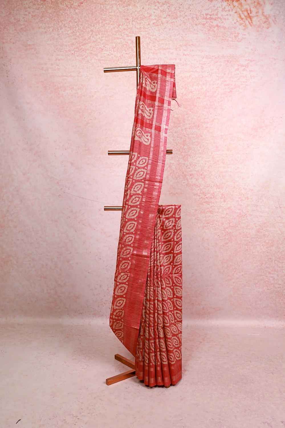 Onion Pink Semi Tussar Bathik Printed Saree With Zari Border. Includes Unstitched Blouse