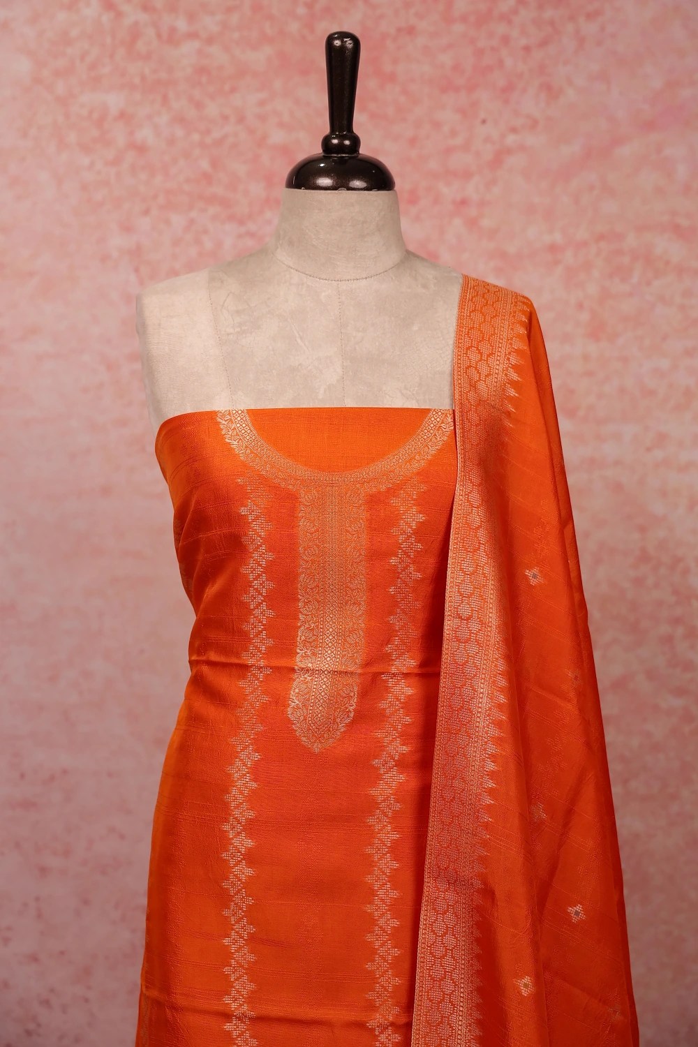 Orange Chanderi Silk Stripes Unstitched Churidar Material. Includes Dupatta.