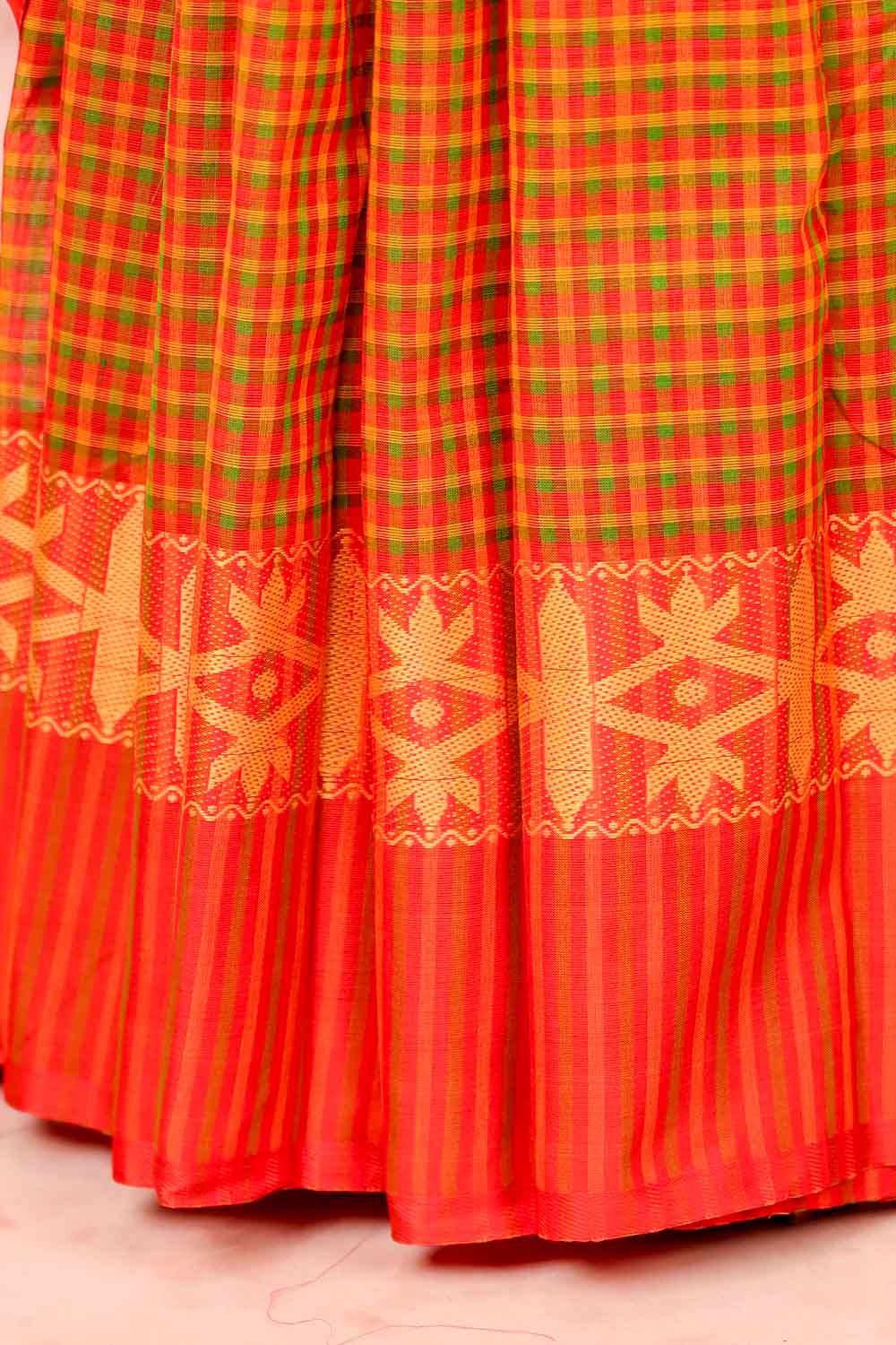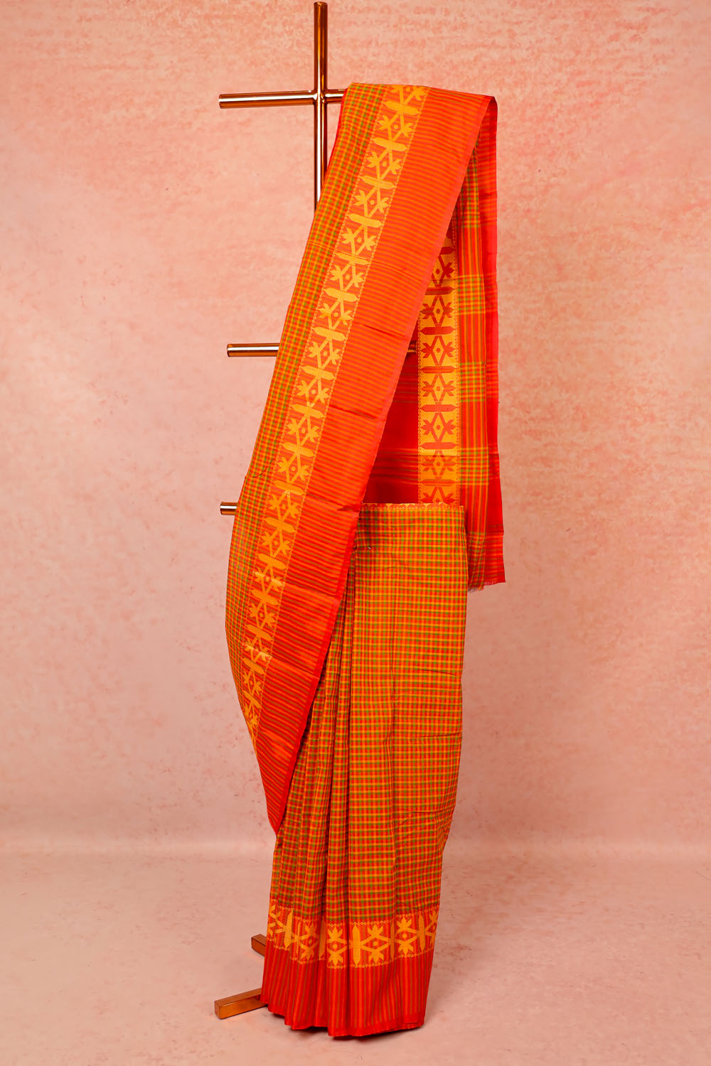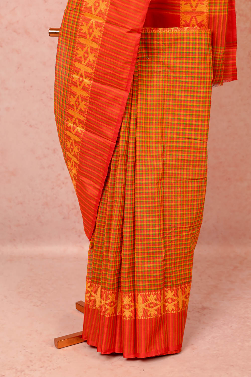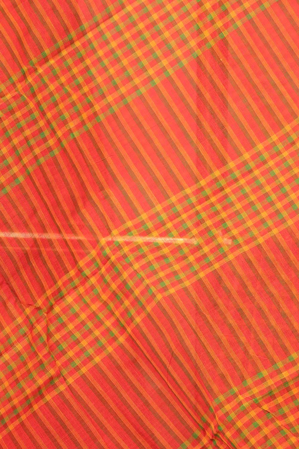 Orange Cotton Check Saree with Line border.