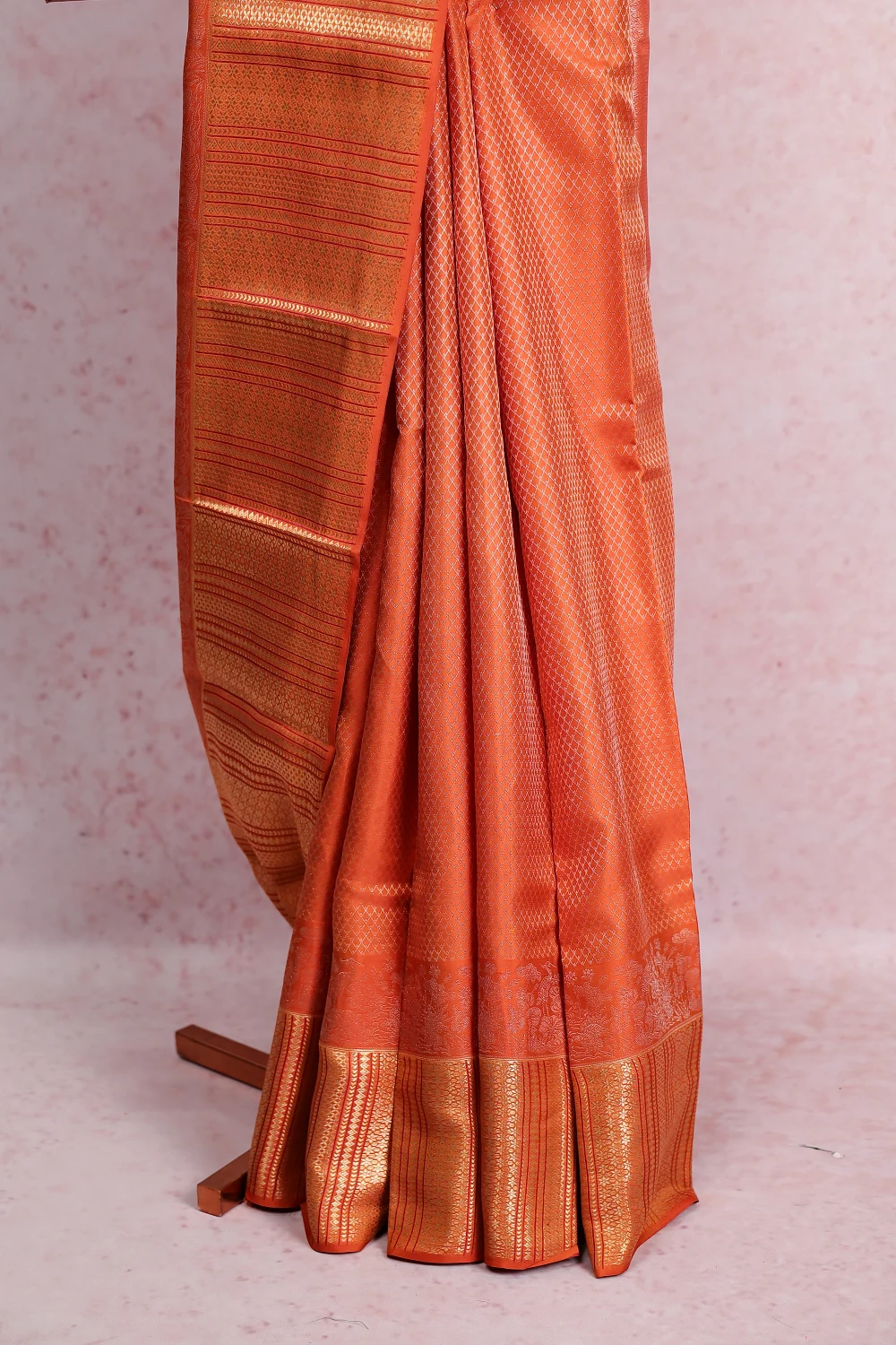 Orange Kancheepuram Silk Brocade Saree With Designer Border. Includes Un Stitched Blouse