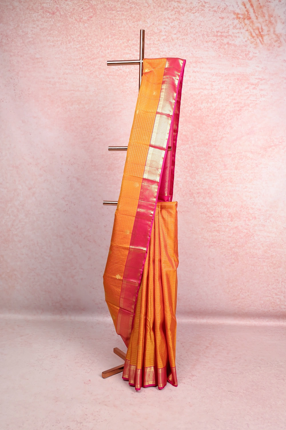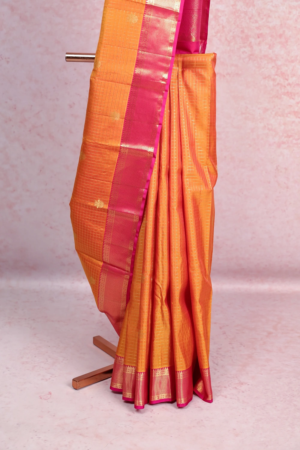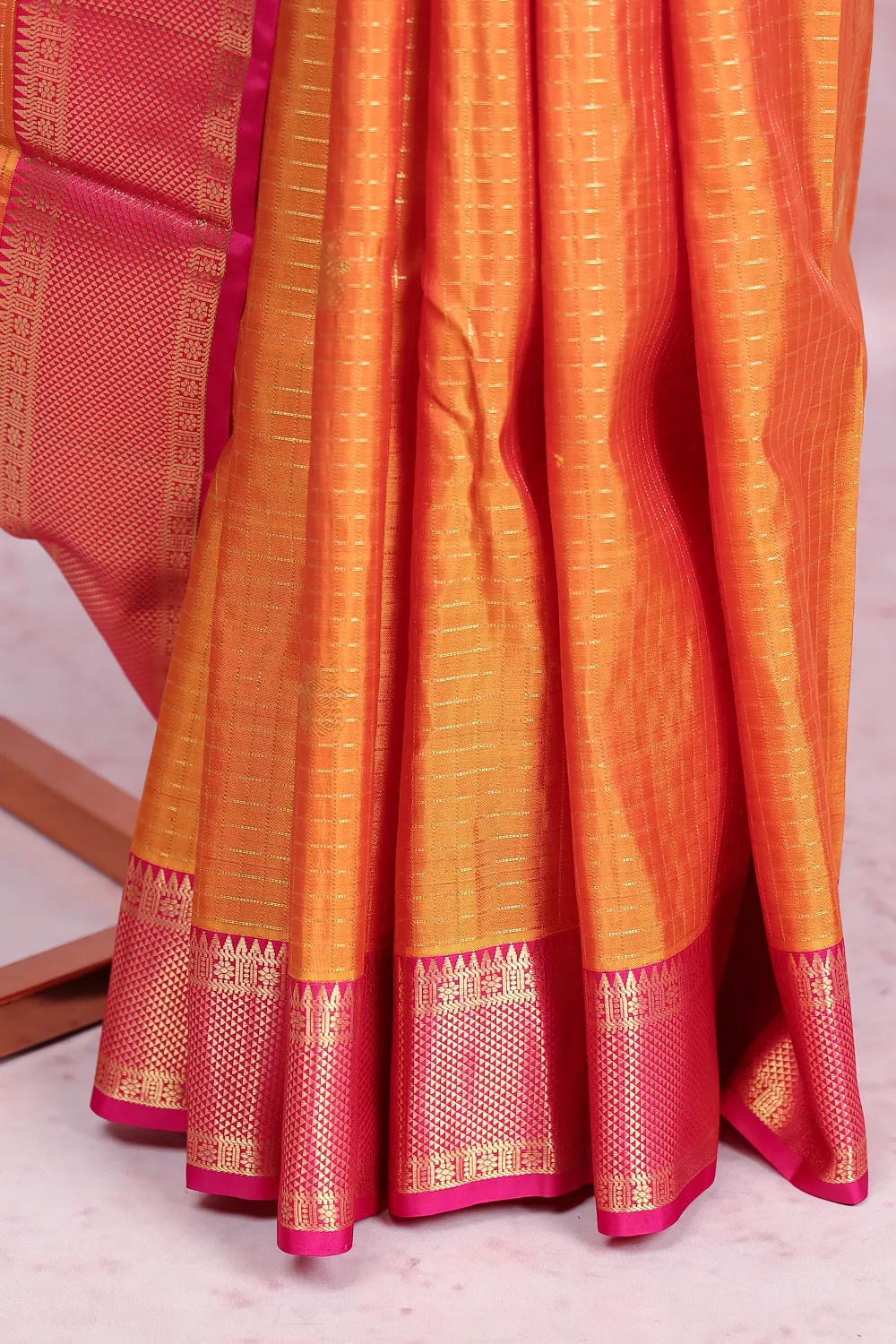 Orange Kancheepuram Check Saree With Plain Border. Includes Un Stitched Blouse