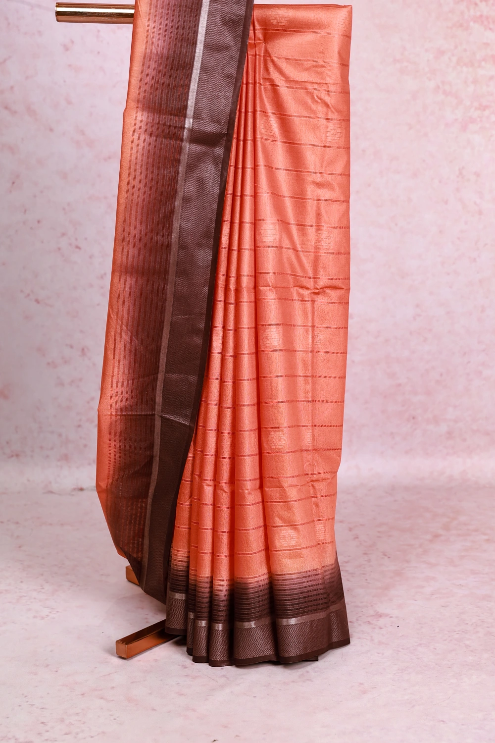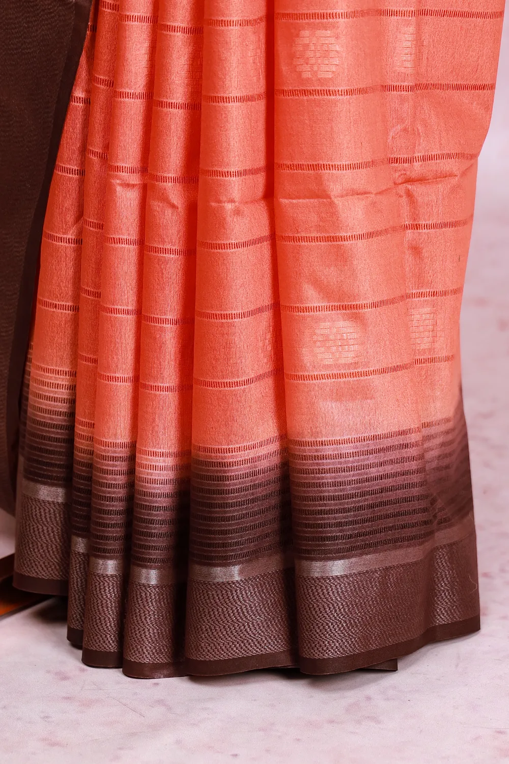Orange Semi Tussar Lines with Butta Saree With Zari Border. Includes Un Stitched Blouse