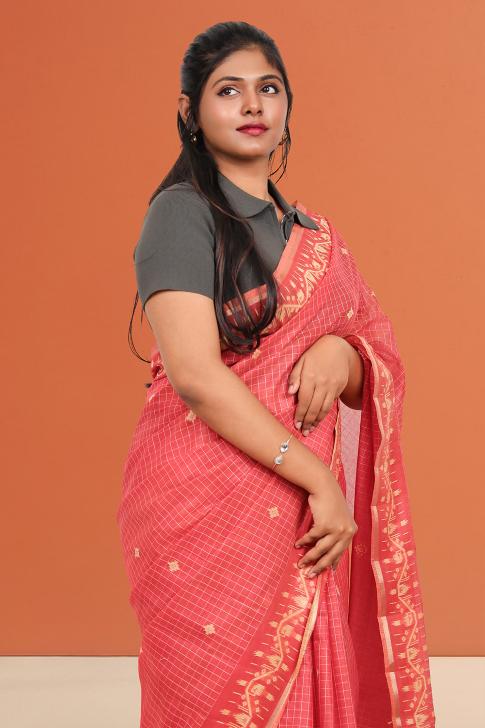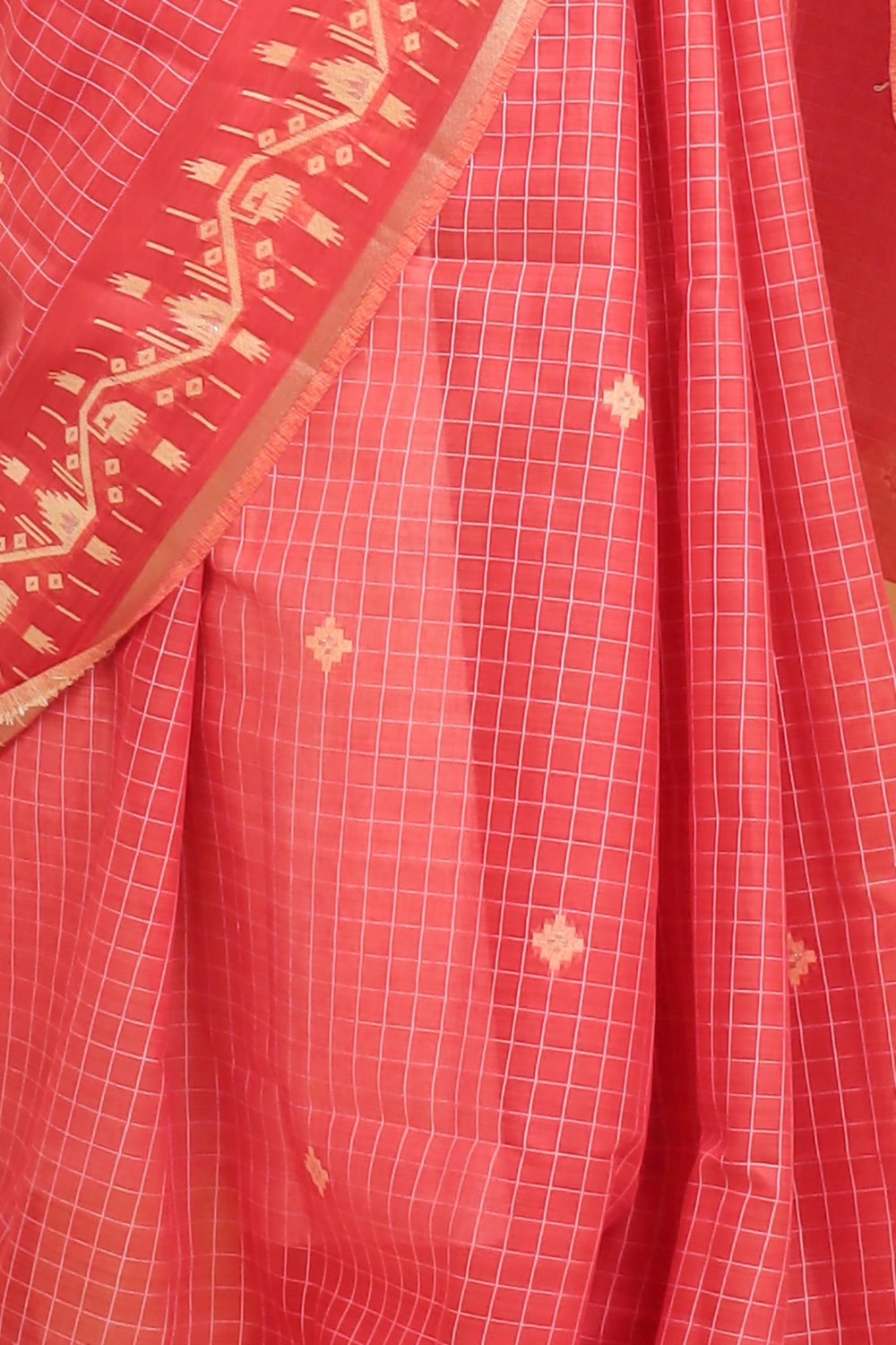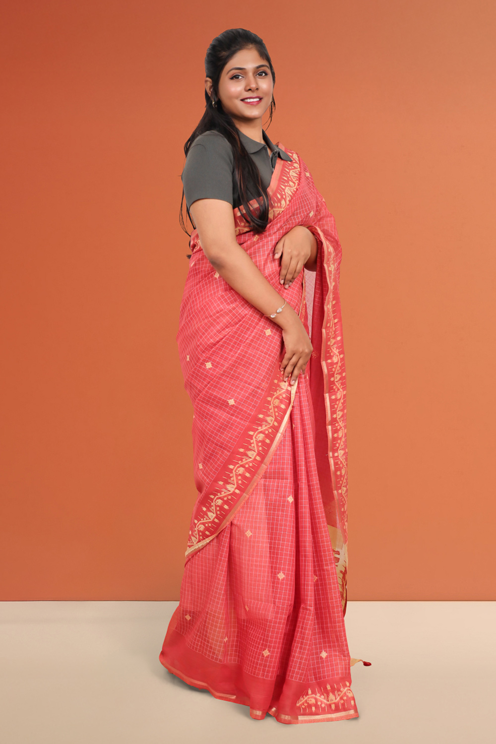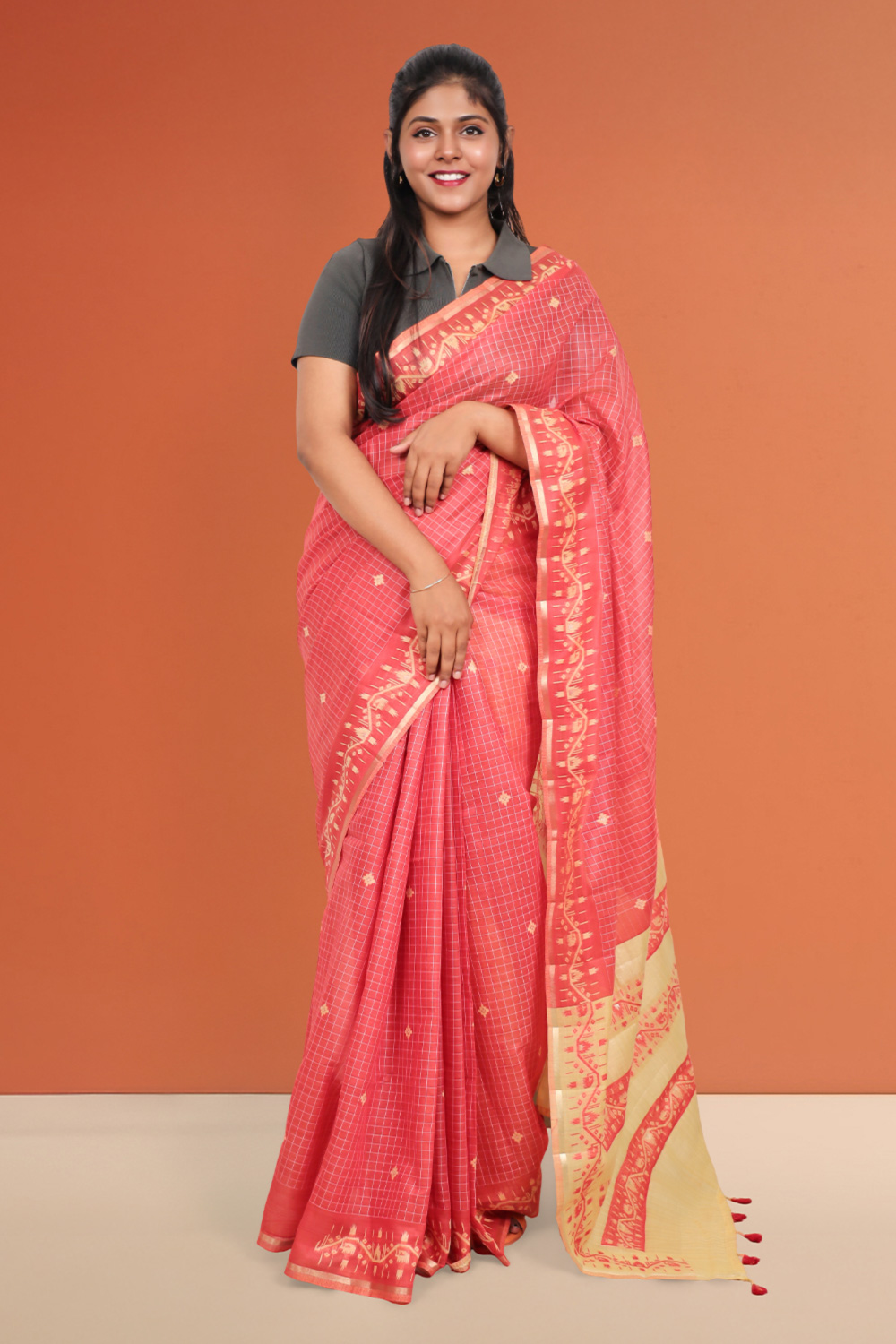 Orange Semi Tussar Checks Saree with Thread border. Includes Unstitched Blouse