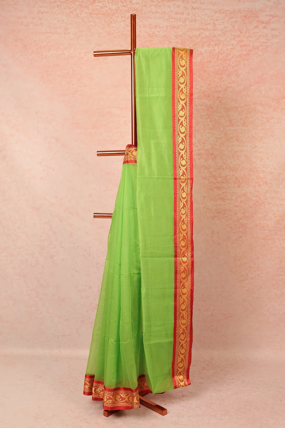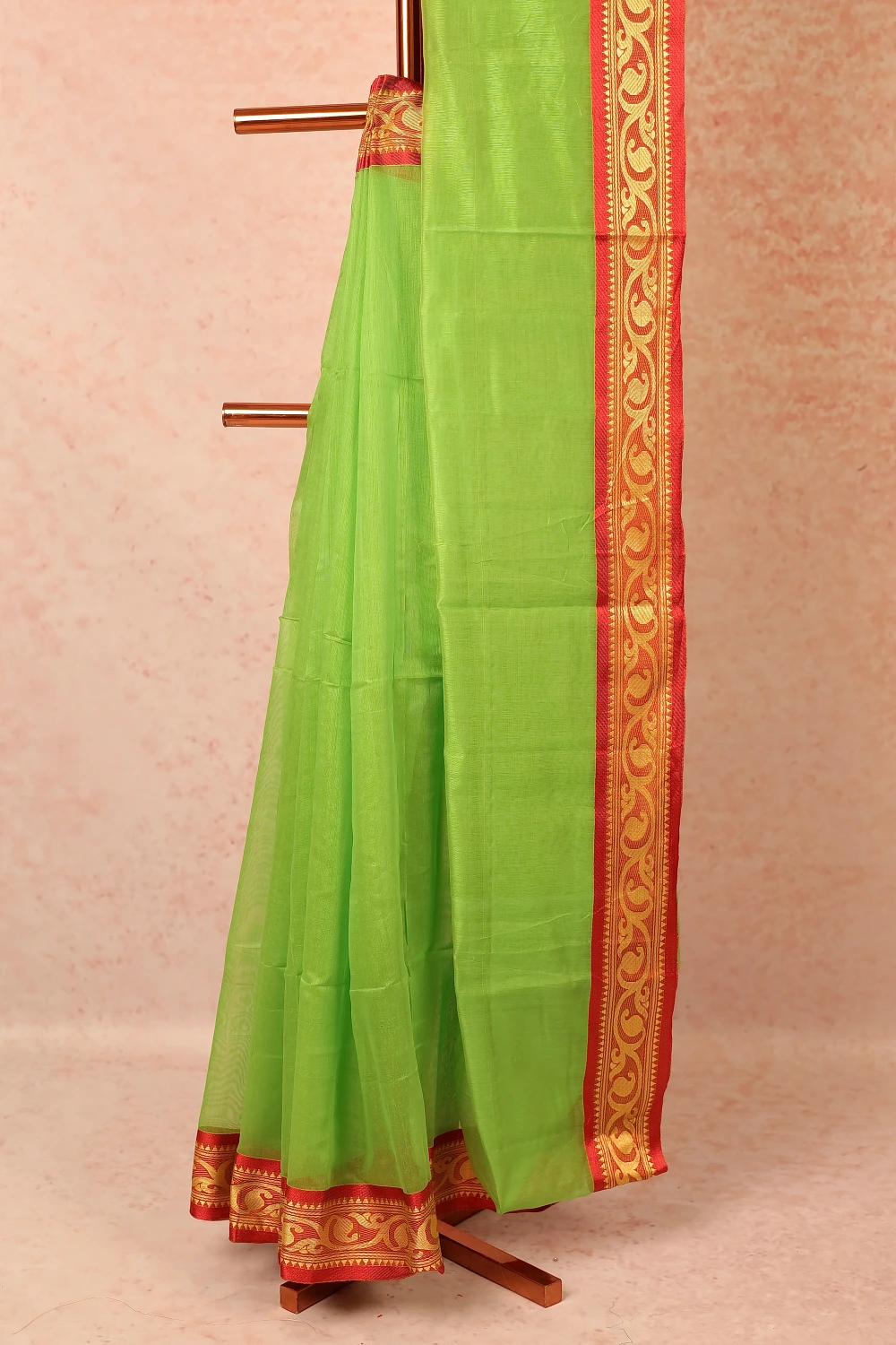 Parrot Green Cotton Plain Body Saree with Designer border. Includes Unstitched Blouse