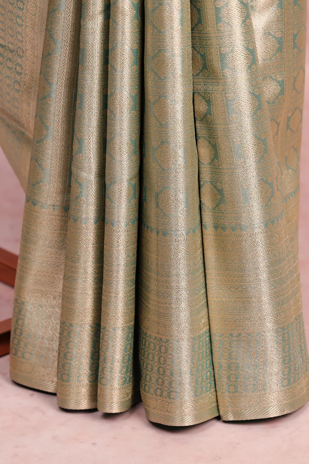 Pastel Green Kancheepuram Semi Tissue Silk Brocade Saree with Designer Border. Includes Unstitched Blouse