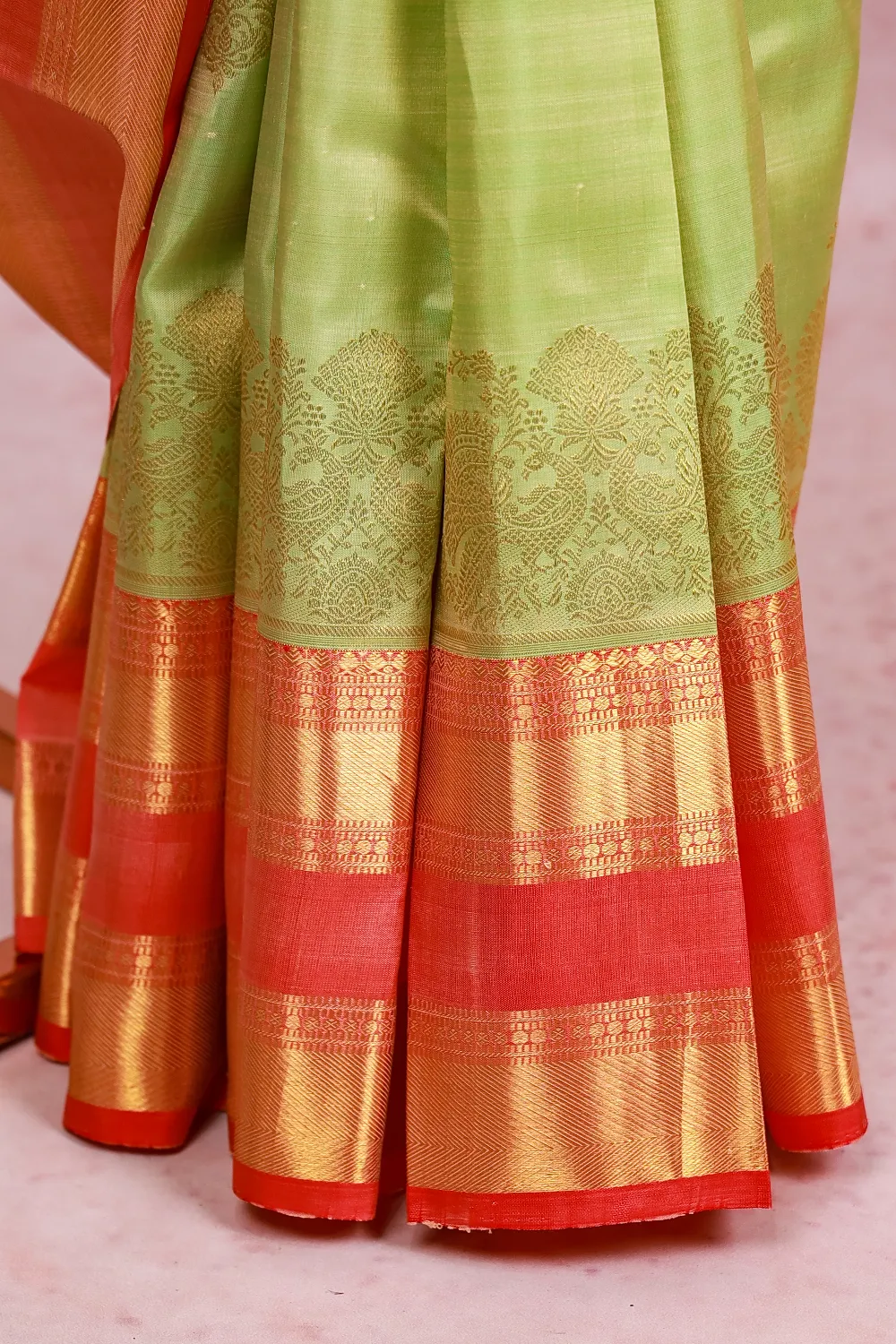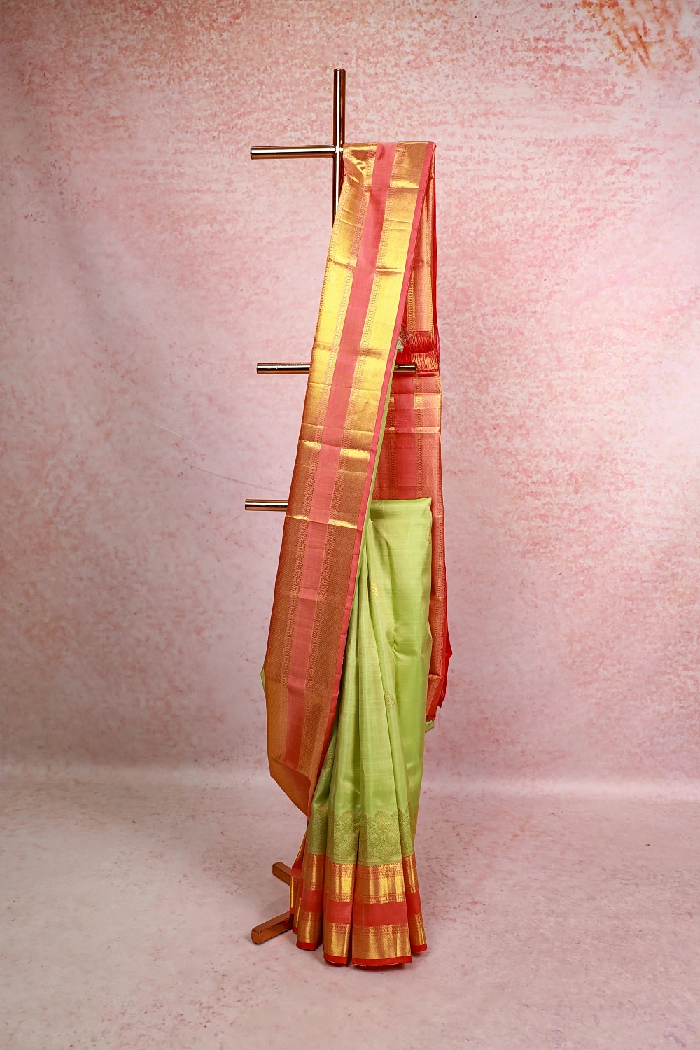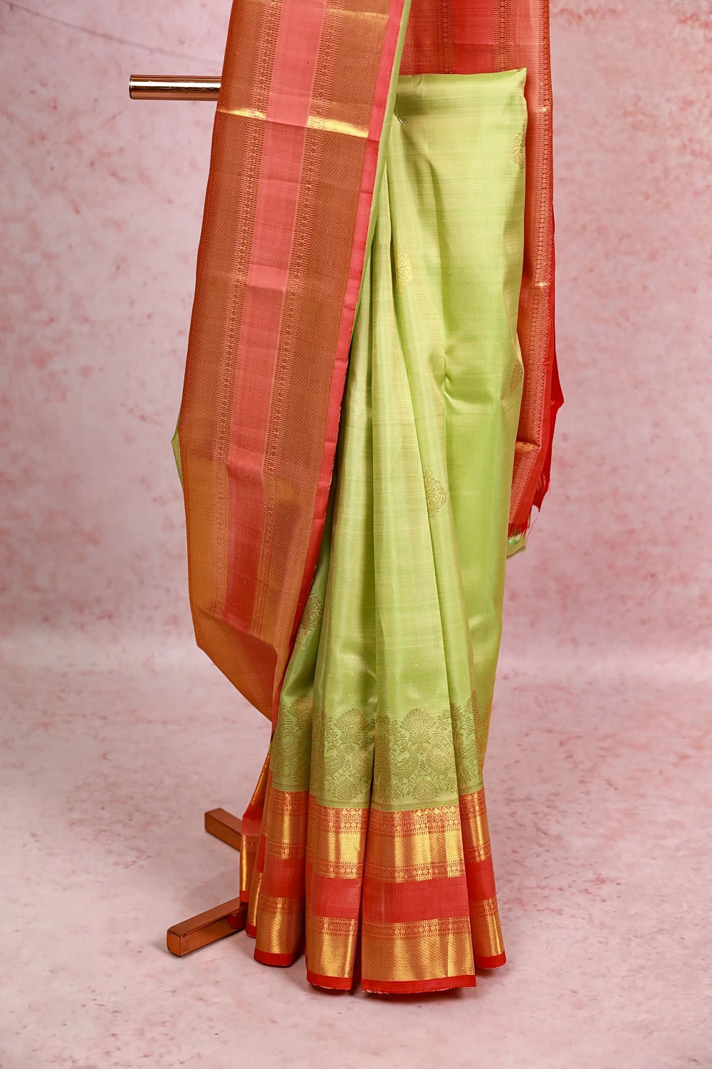 Pastel Green Kancheepuram Silk Butta Saree With Traditional Zari Border. Includes Unstitched Blouse
