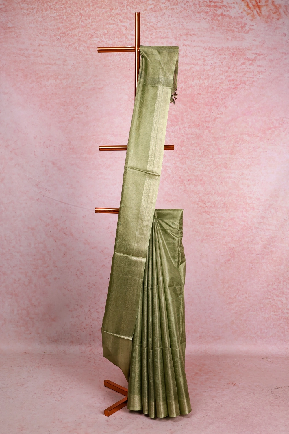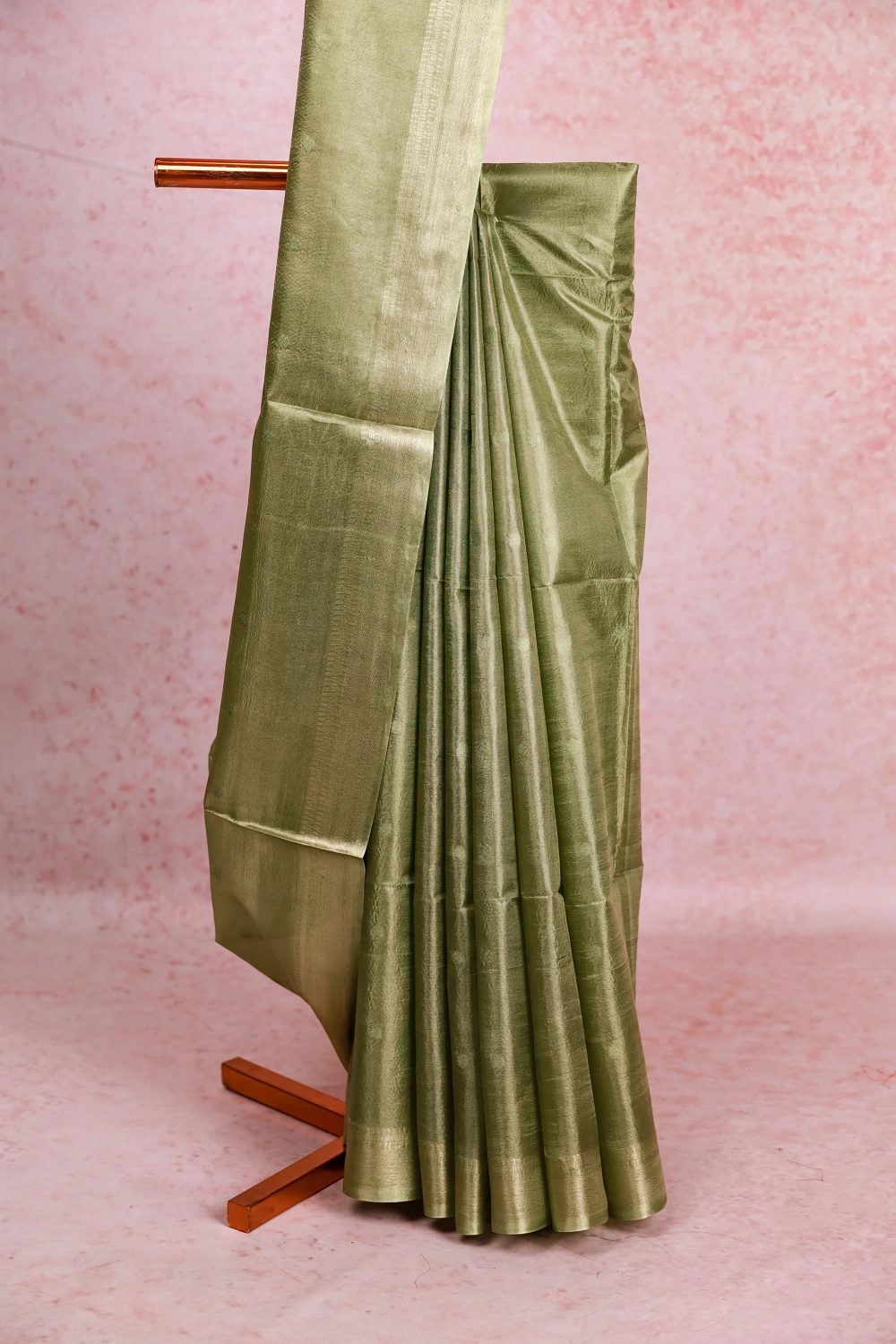 Pastel Green Semi Tussar Butta Saree With Zari Border. Includes Un Stitched Blouse
