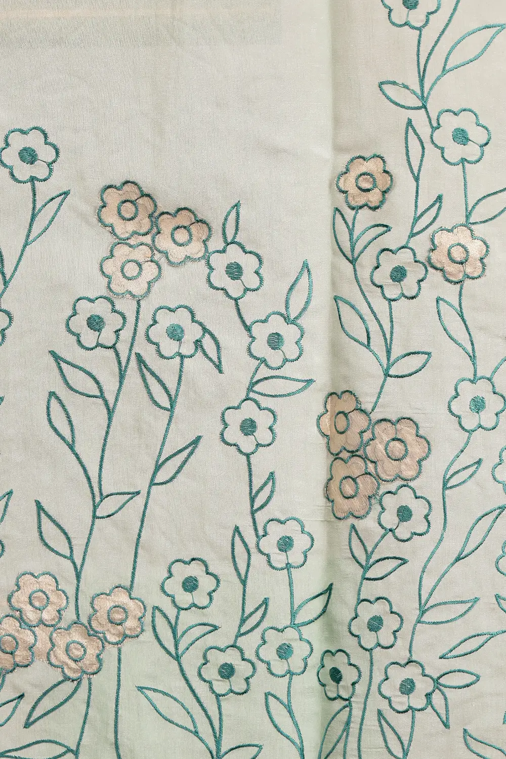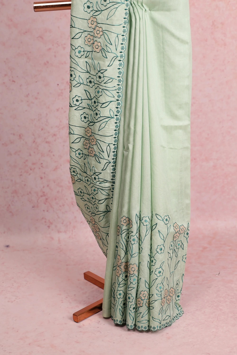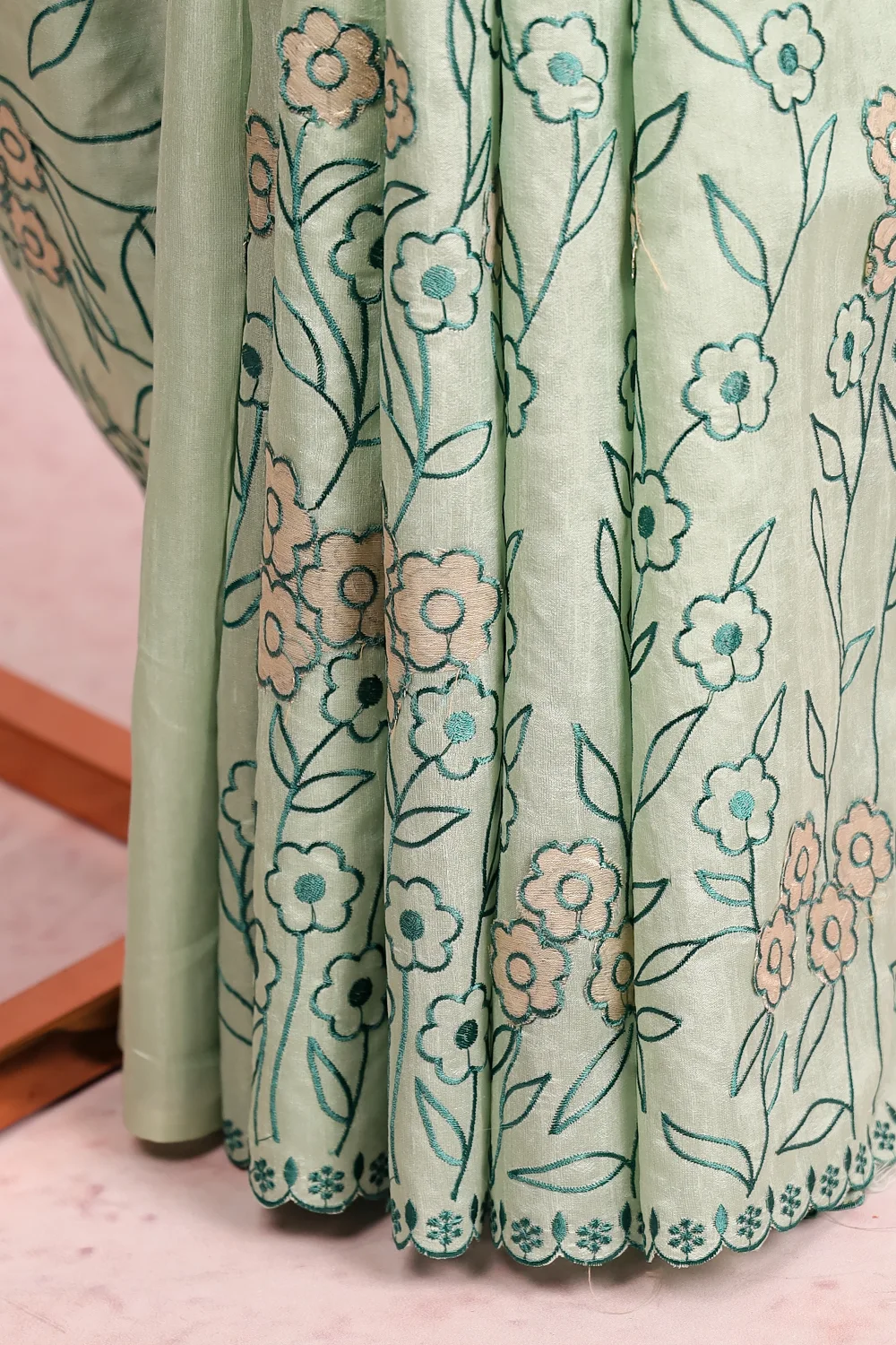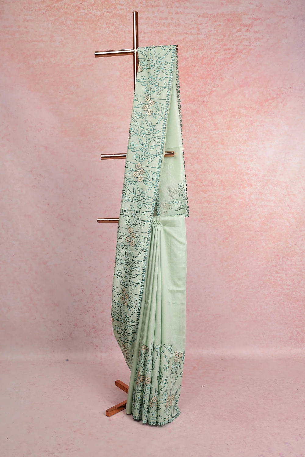 Pastel Green Tussar Tissue Applic Work Saree With Piping Border. Includes Un Stitched Blouse