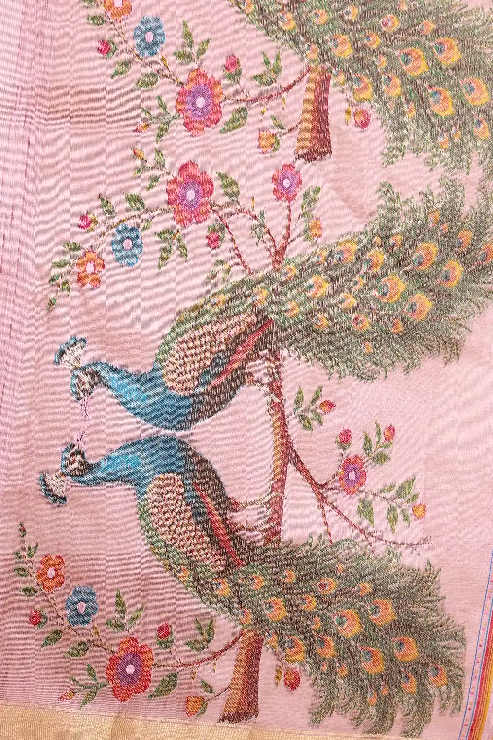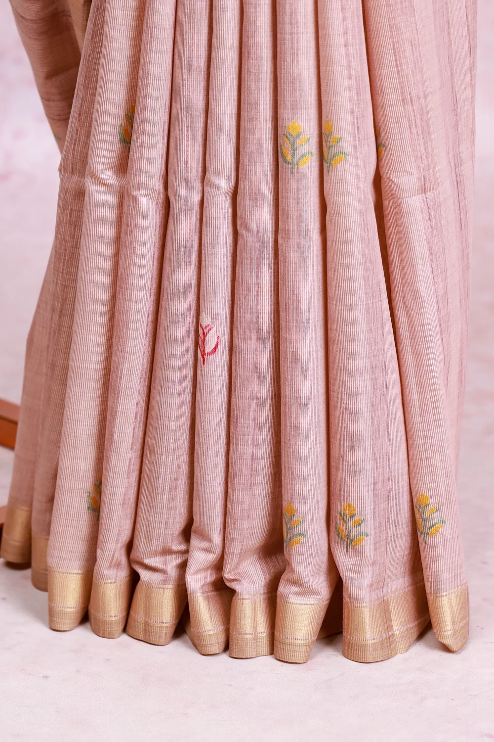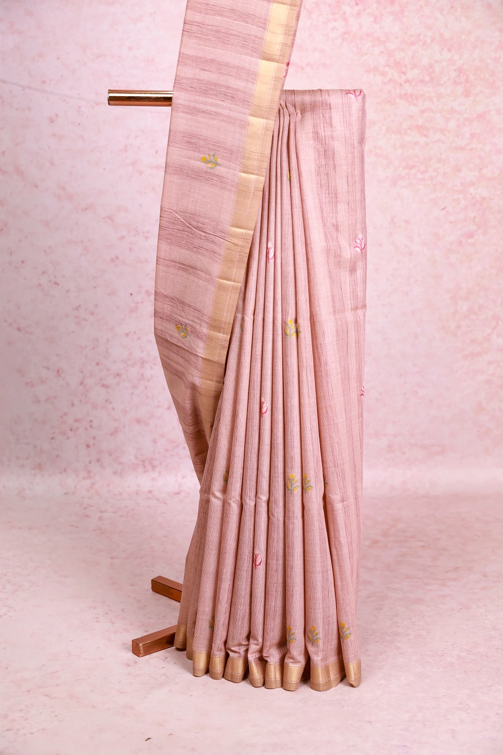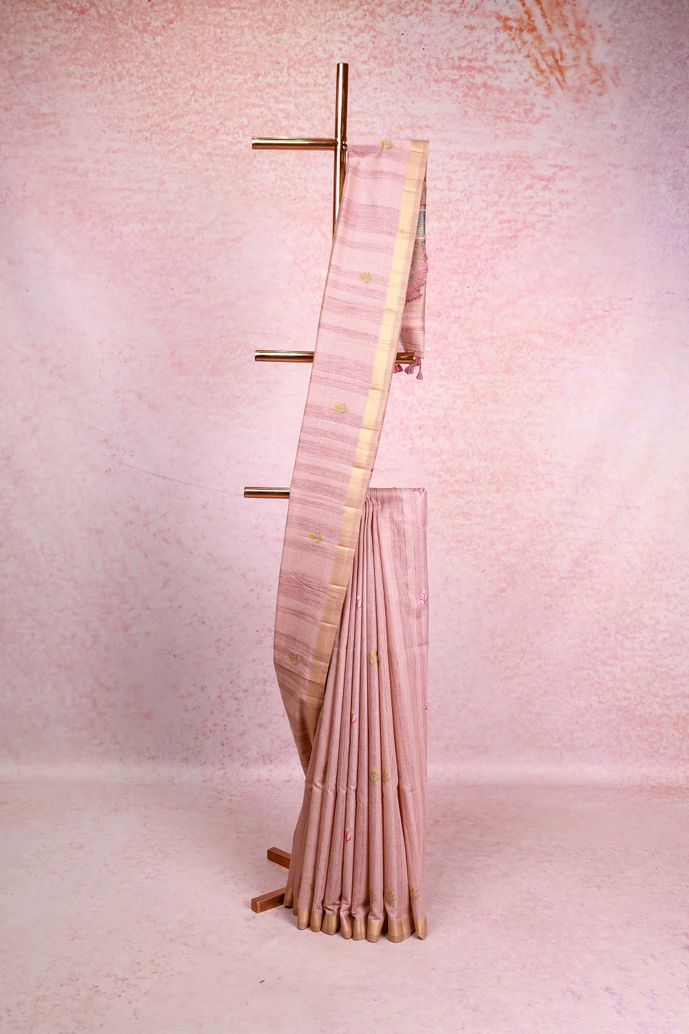 Pastel Pink Semi Tussar Butta Saree With Small Border. Includes Un Stitched Blouse