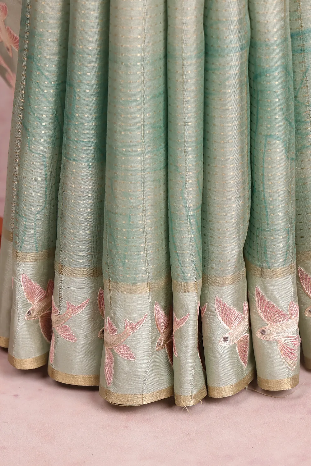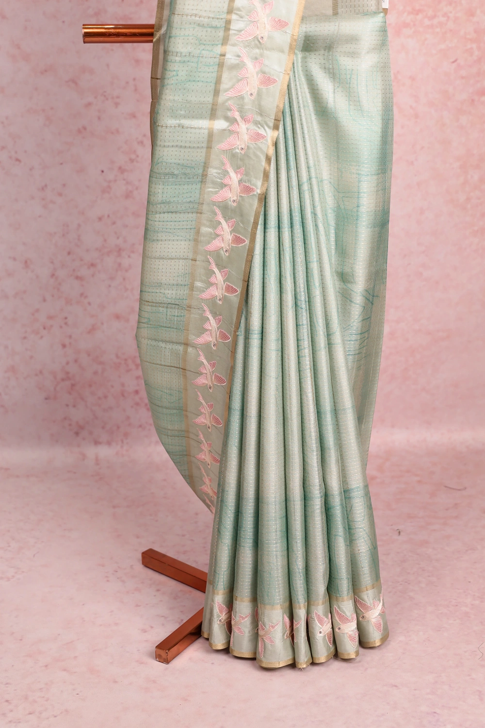 Pastel Sapphire Green Printed Saree With Small Border. Includes Un Stitched Blouse