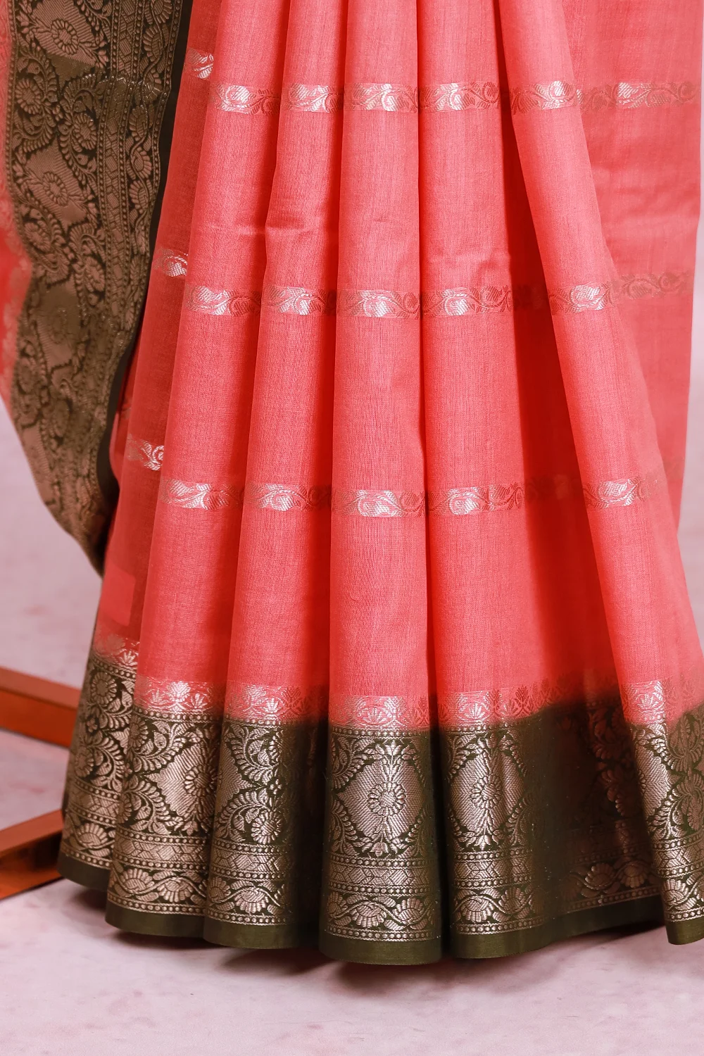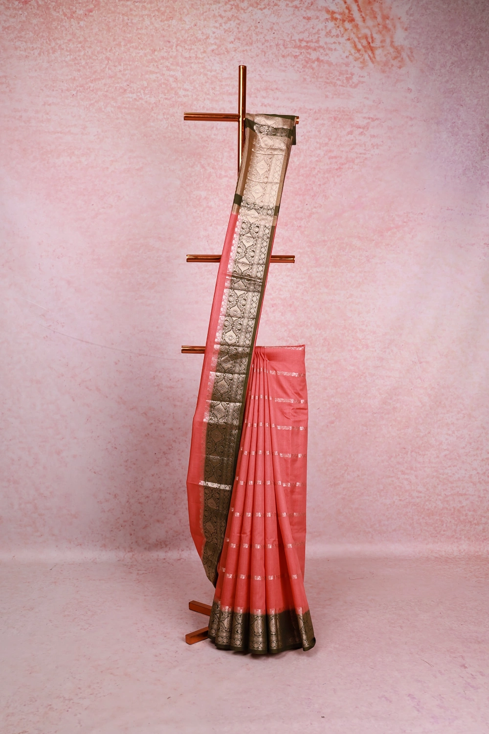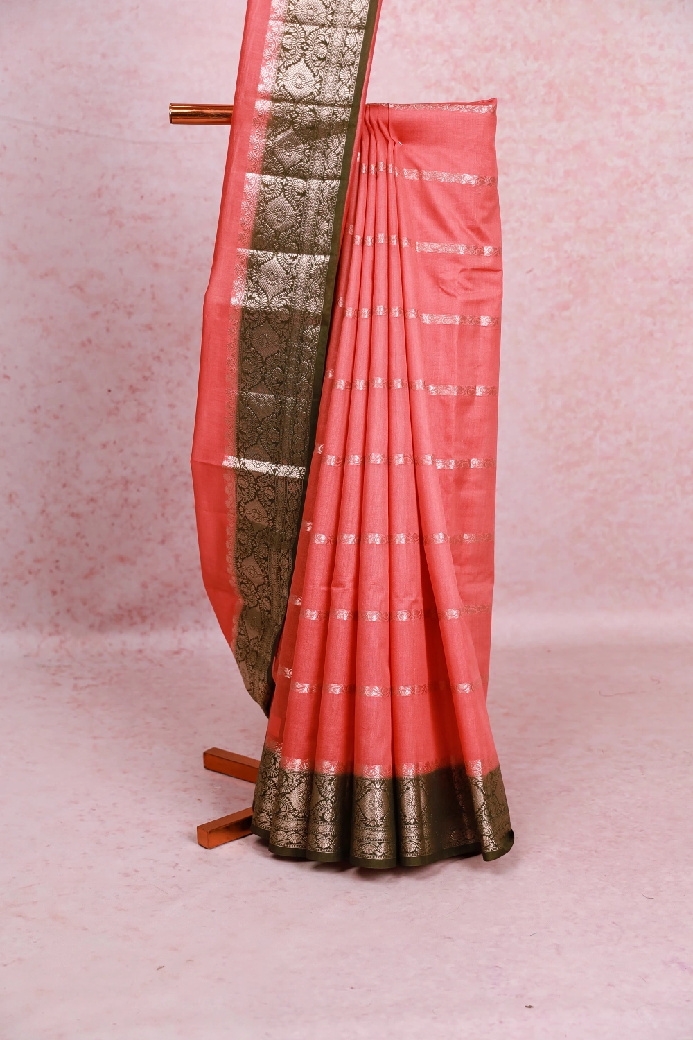 Peach Chiffon Zari Design Saree with Zari And Thread Border. Includes Unstitched Blouse