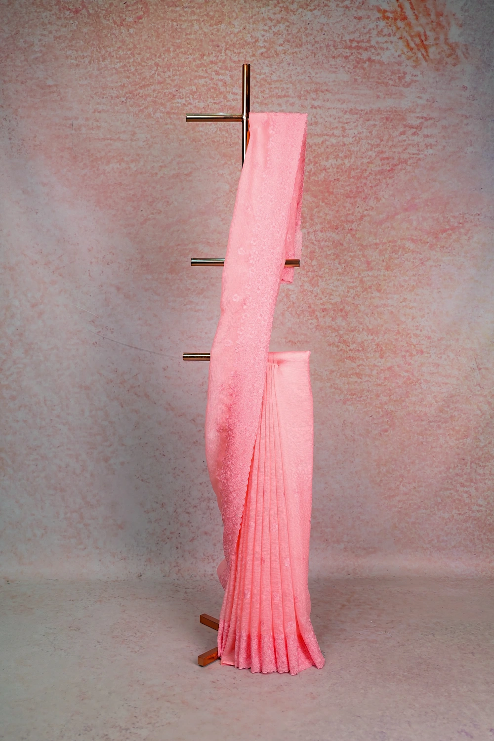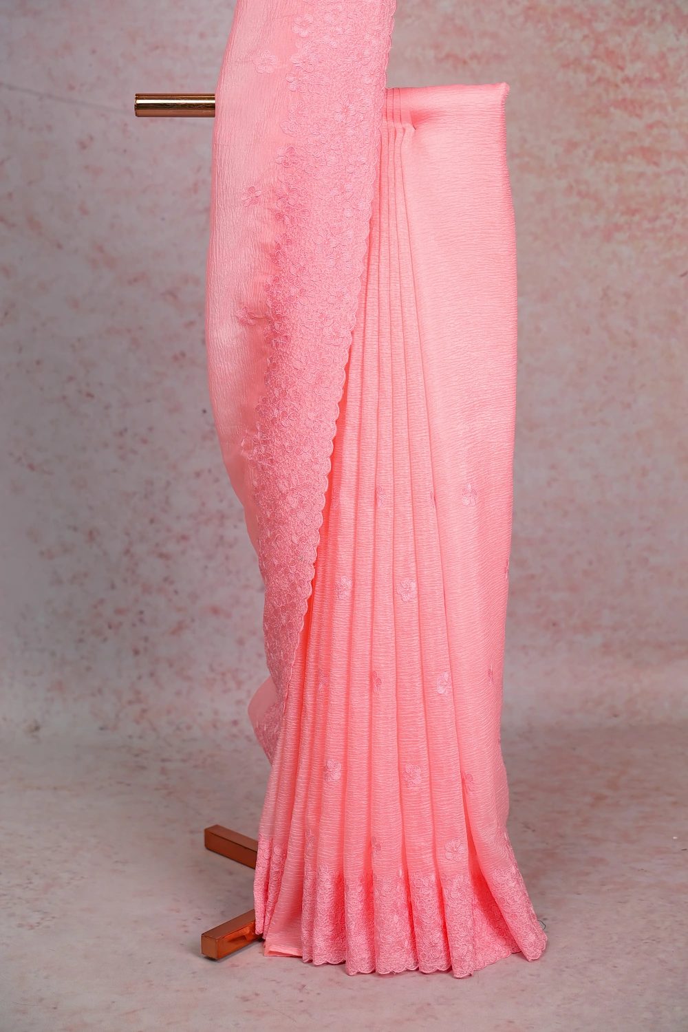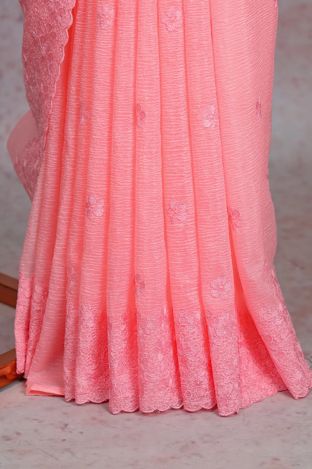 Peach Crush Organza Thread Work Saree with Scalp Border. Includes Unstitched Blouse