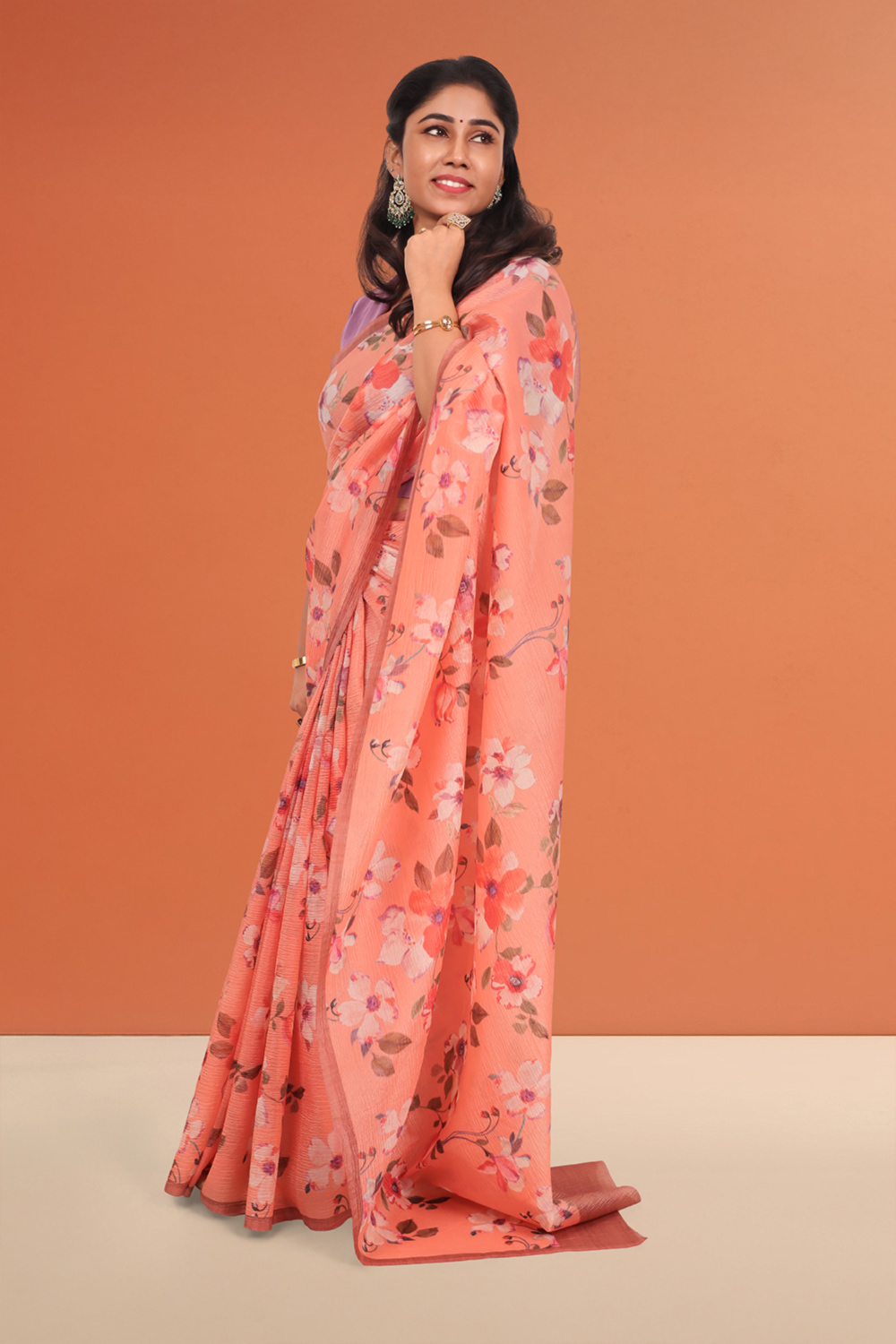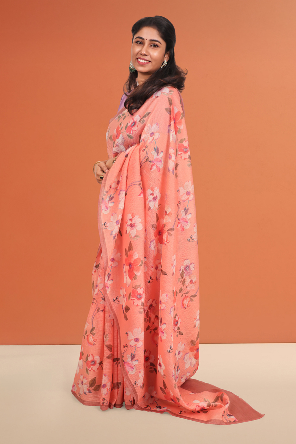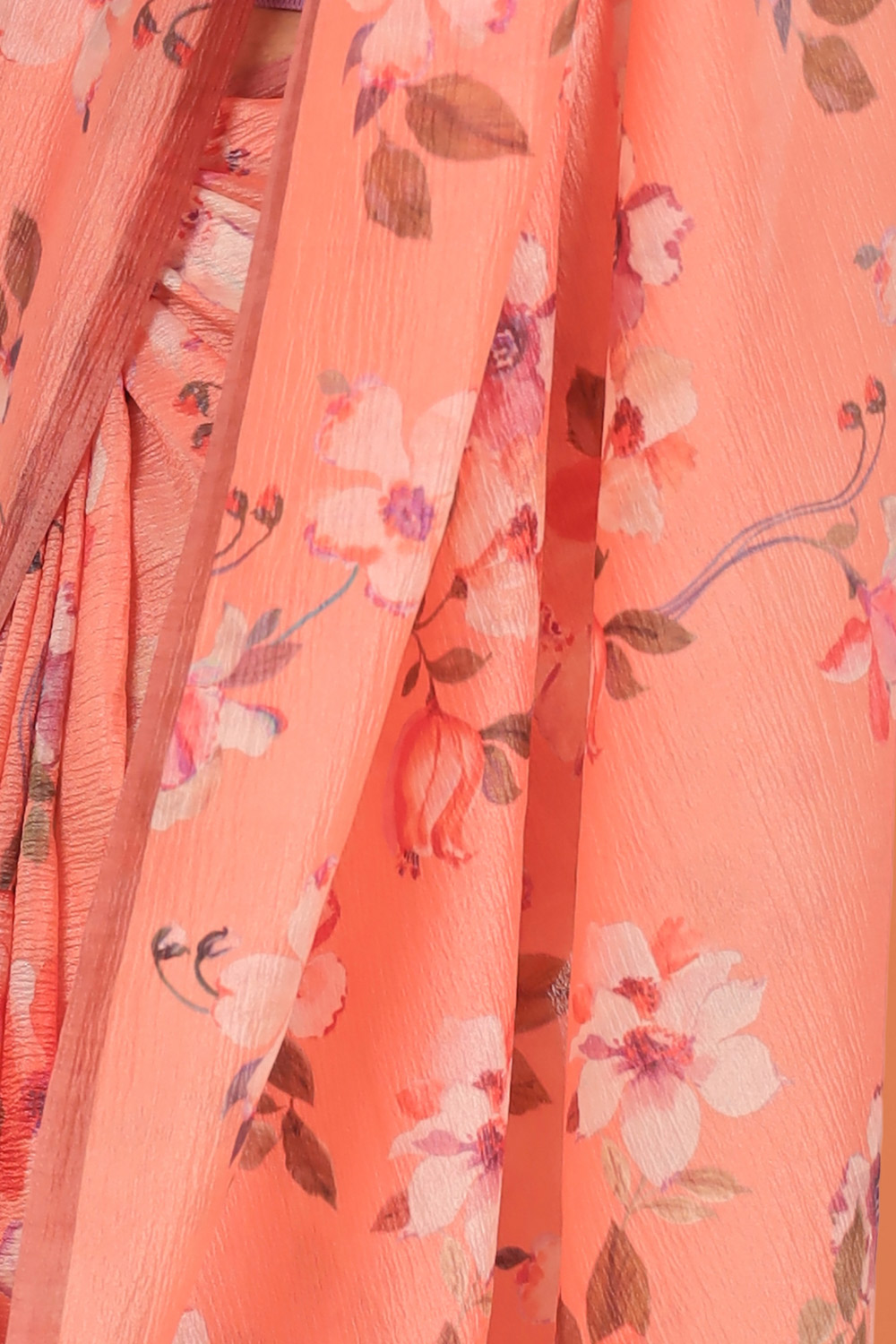 Peach Crush Organza Floral Printed Saree with Without border. Includes unstitched Blouse Material