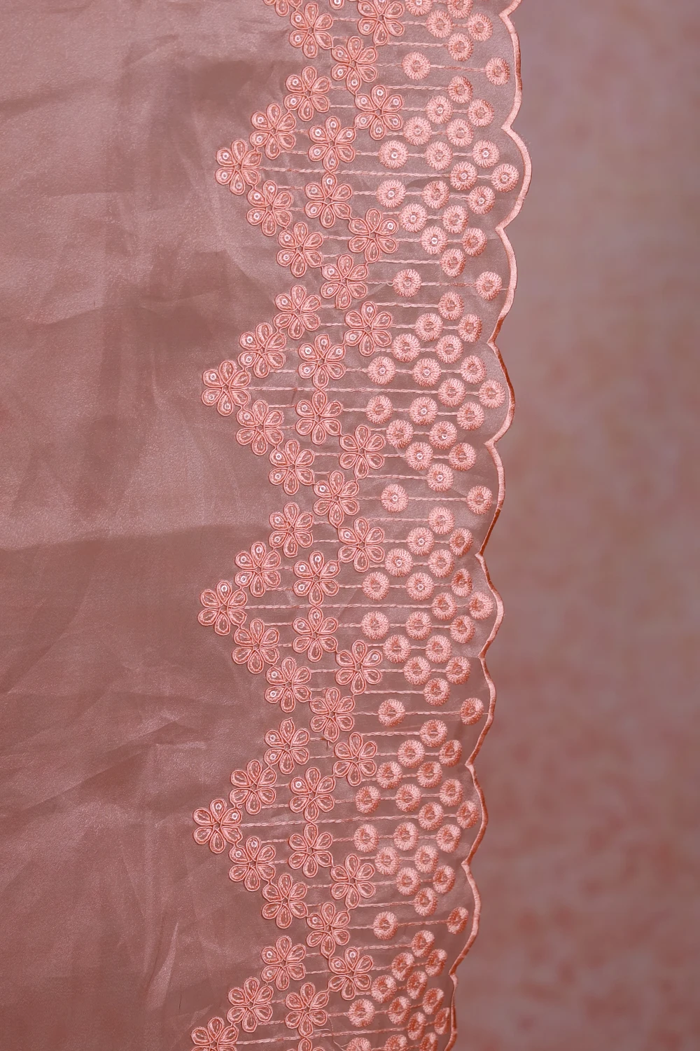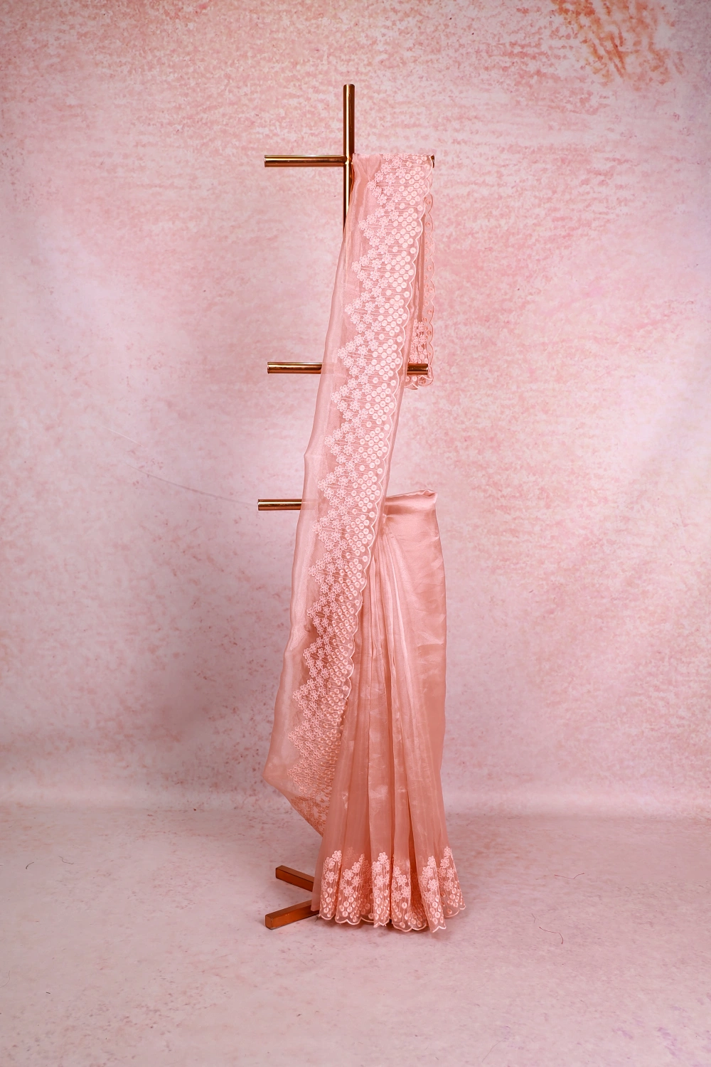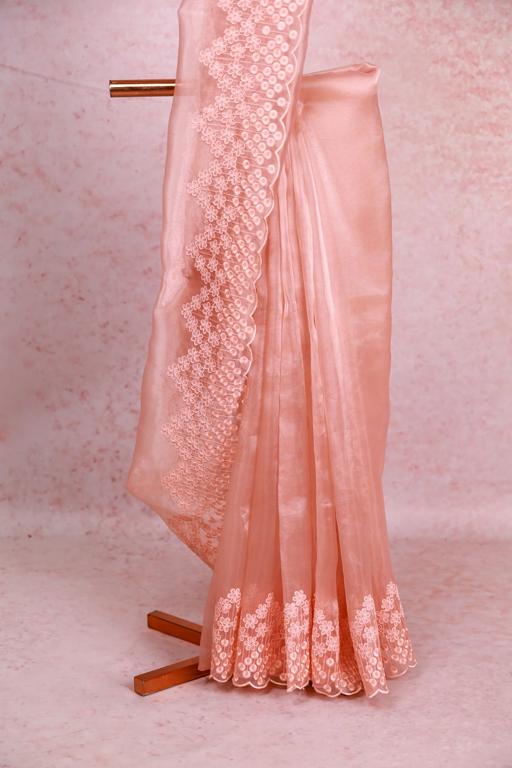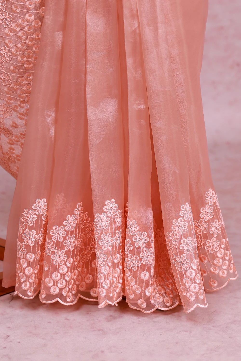 Peach Glass Organza Plain Body Saree With Scalp Border. Includes Un Stitched Blouse