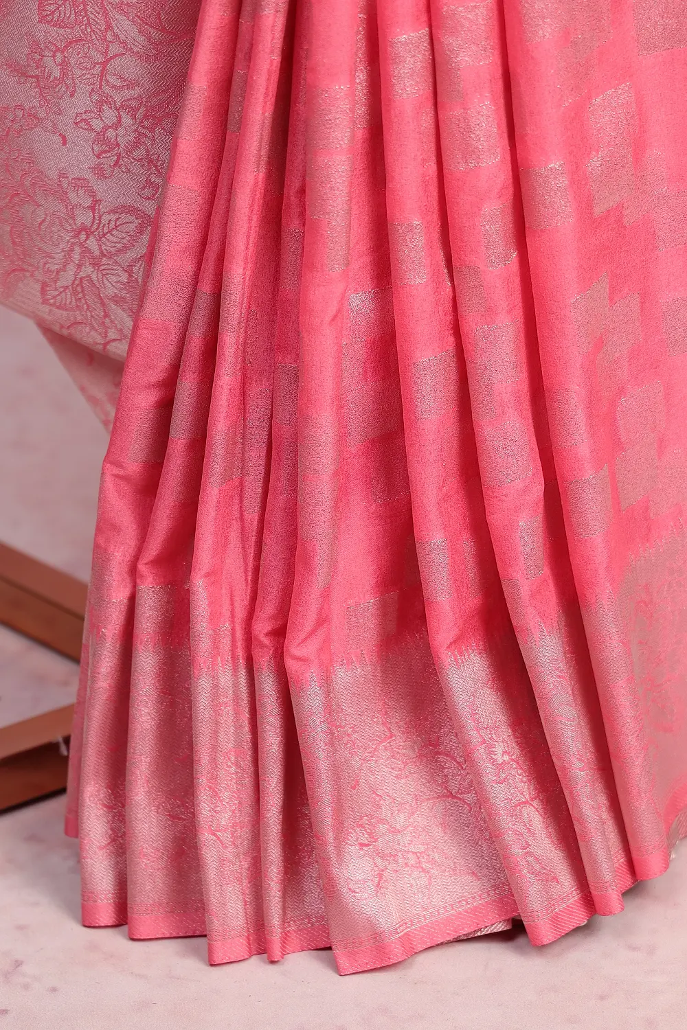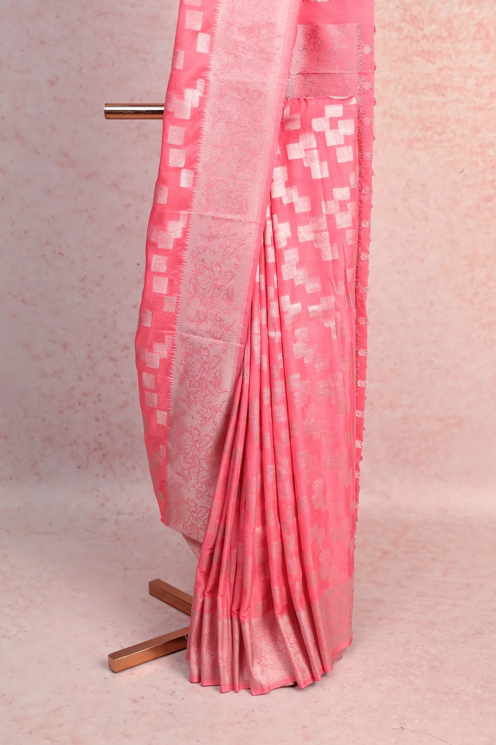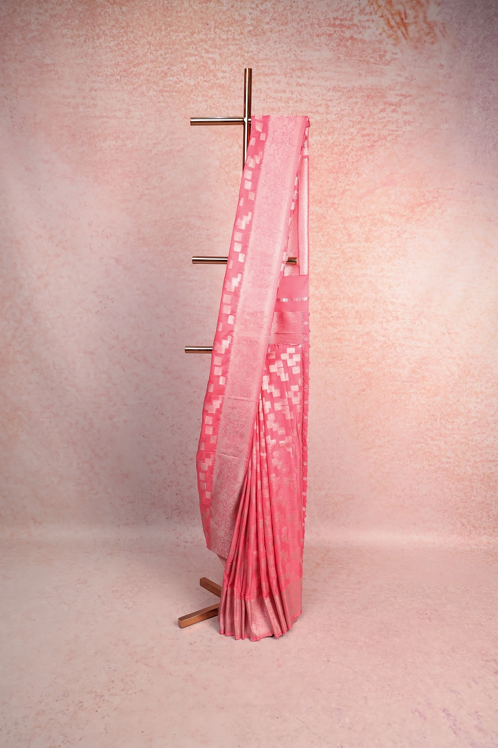 Peach Jute Banarasi Box Design Saree with Designer Border. Includes Unstitched Blouse