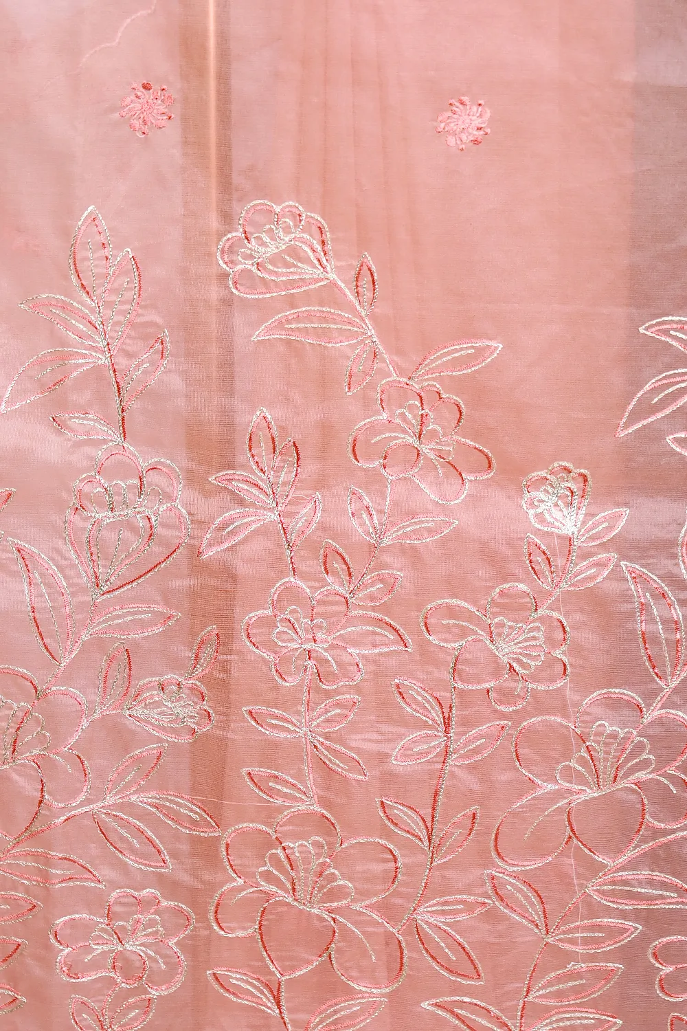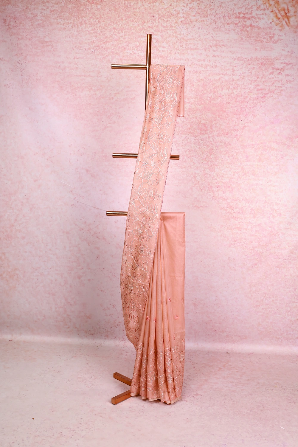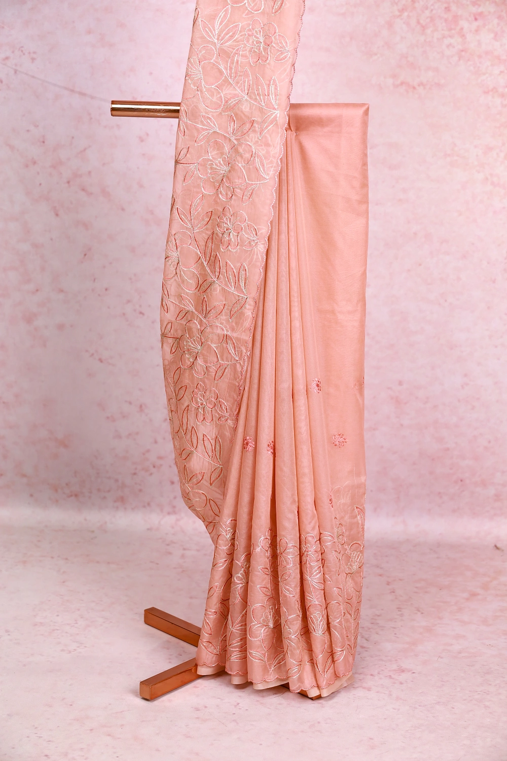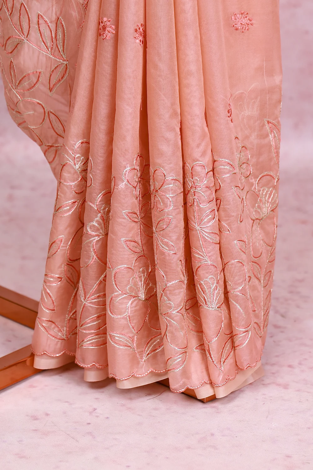 Peach Organza Embroidery Saree with Scalp Border. Includes Unstitched Blouse