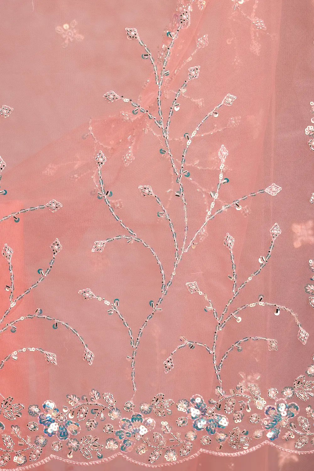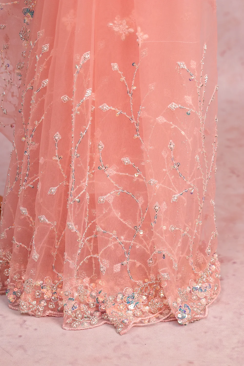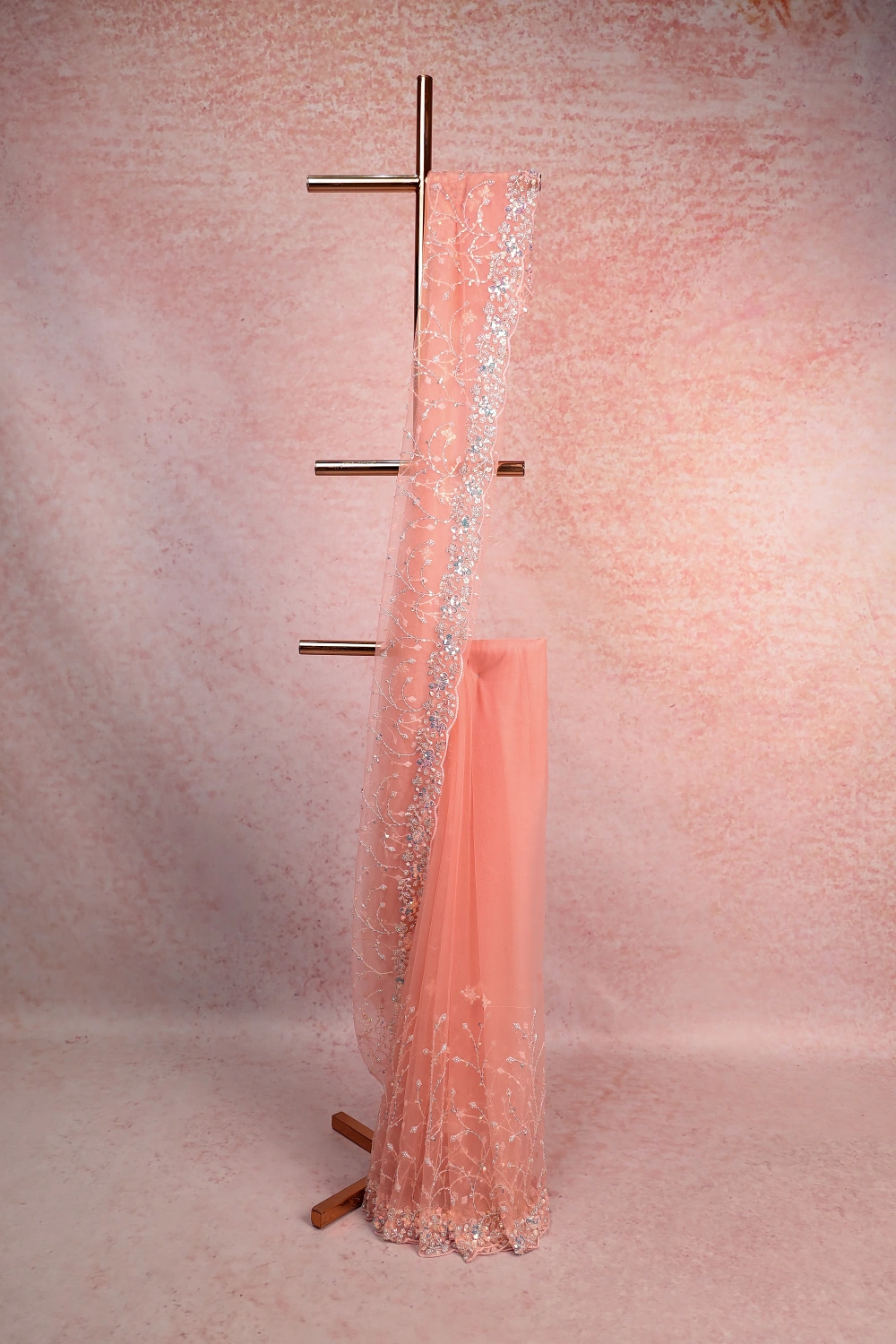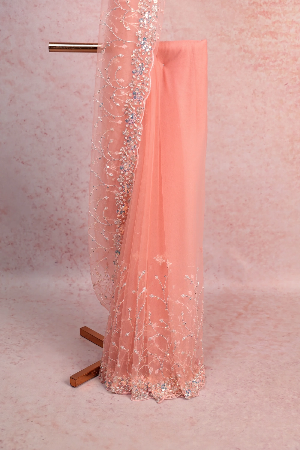 Peach Pink Net Pearl Work Saree with Scalp Border. Includes Un stitched Blouse