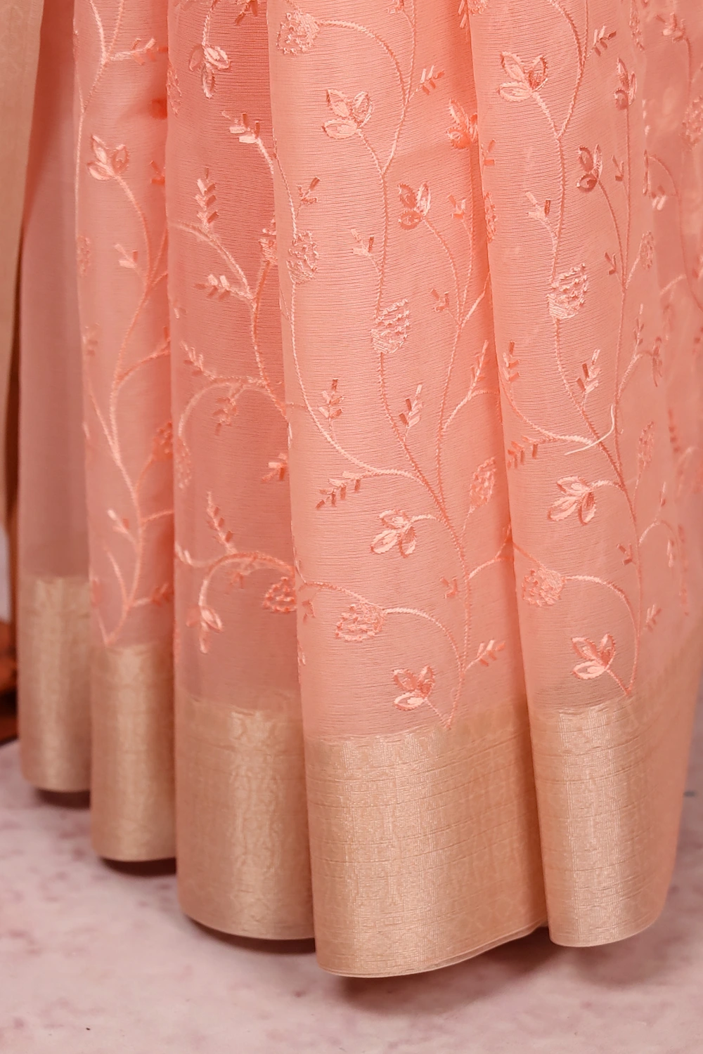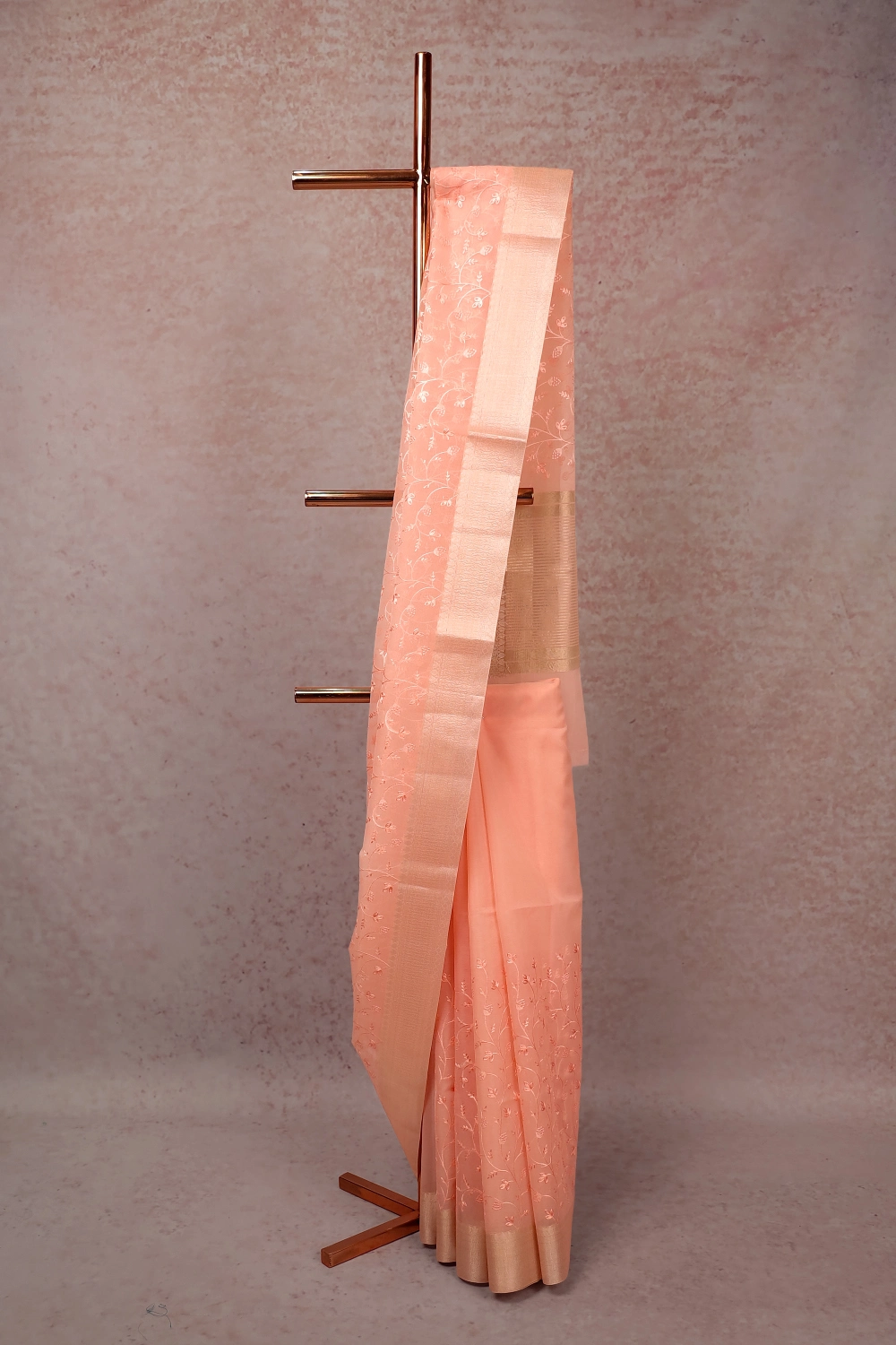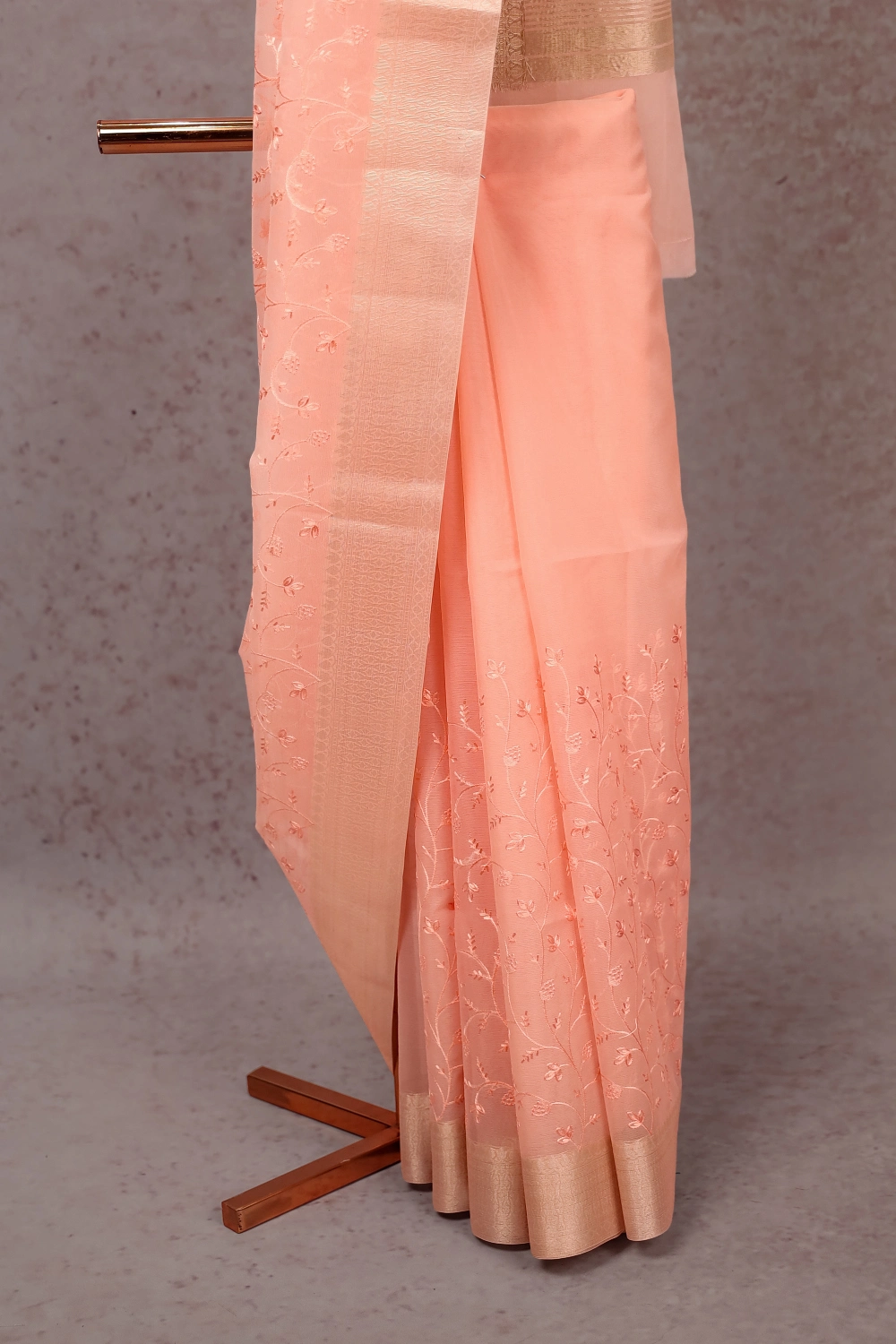 Peach Semi Organza Embroidery Saree with Designer Border. Includes Un stitched Blouse