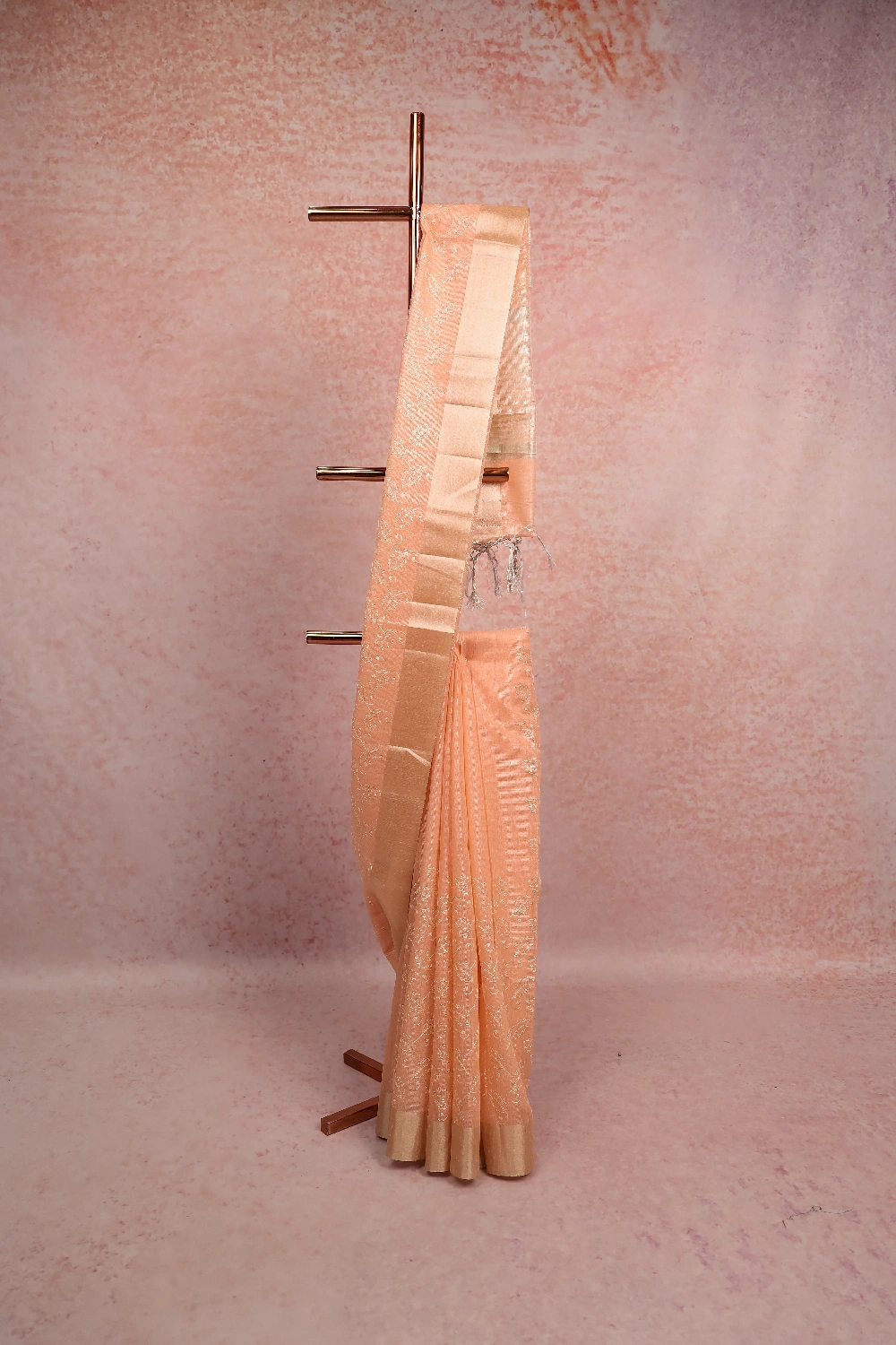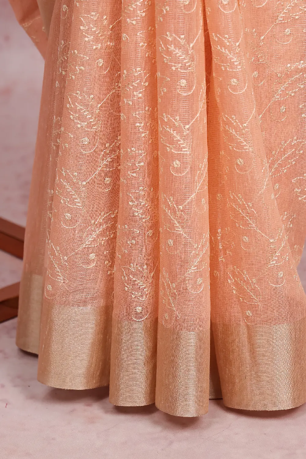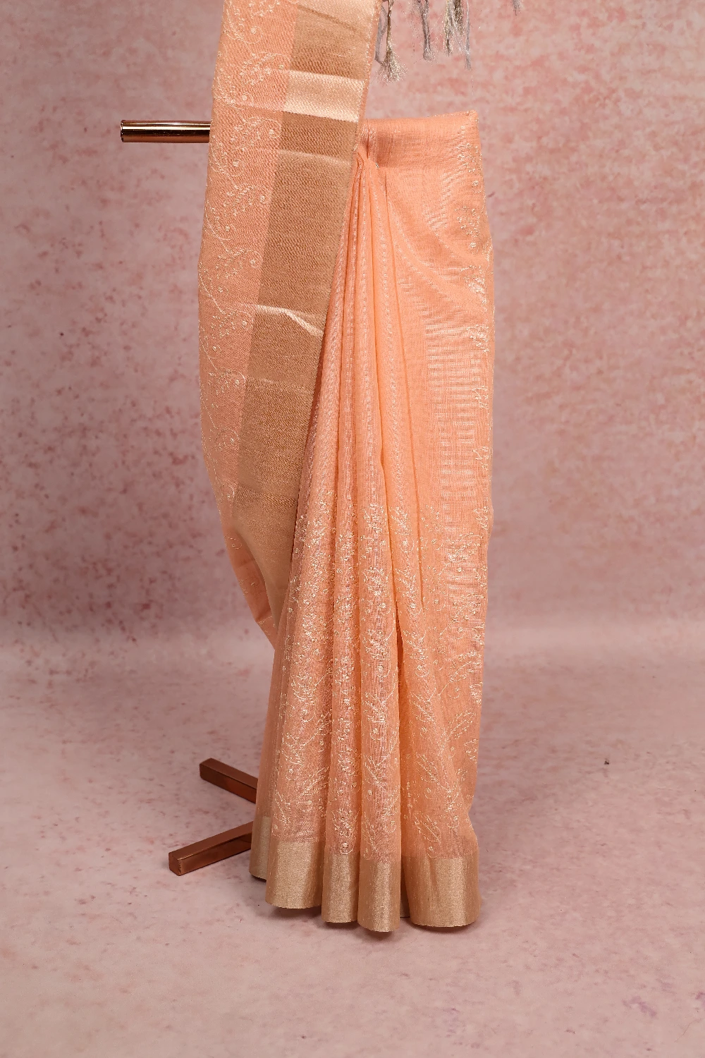 Peach Semi Tissue Organza Embroidery Saree with Golden Border. Includes Unstitched Blouse
