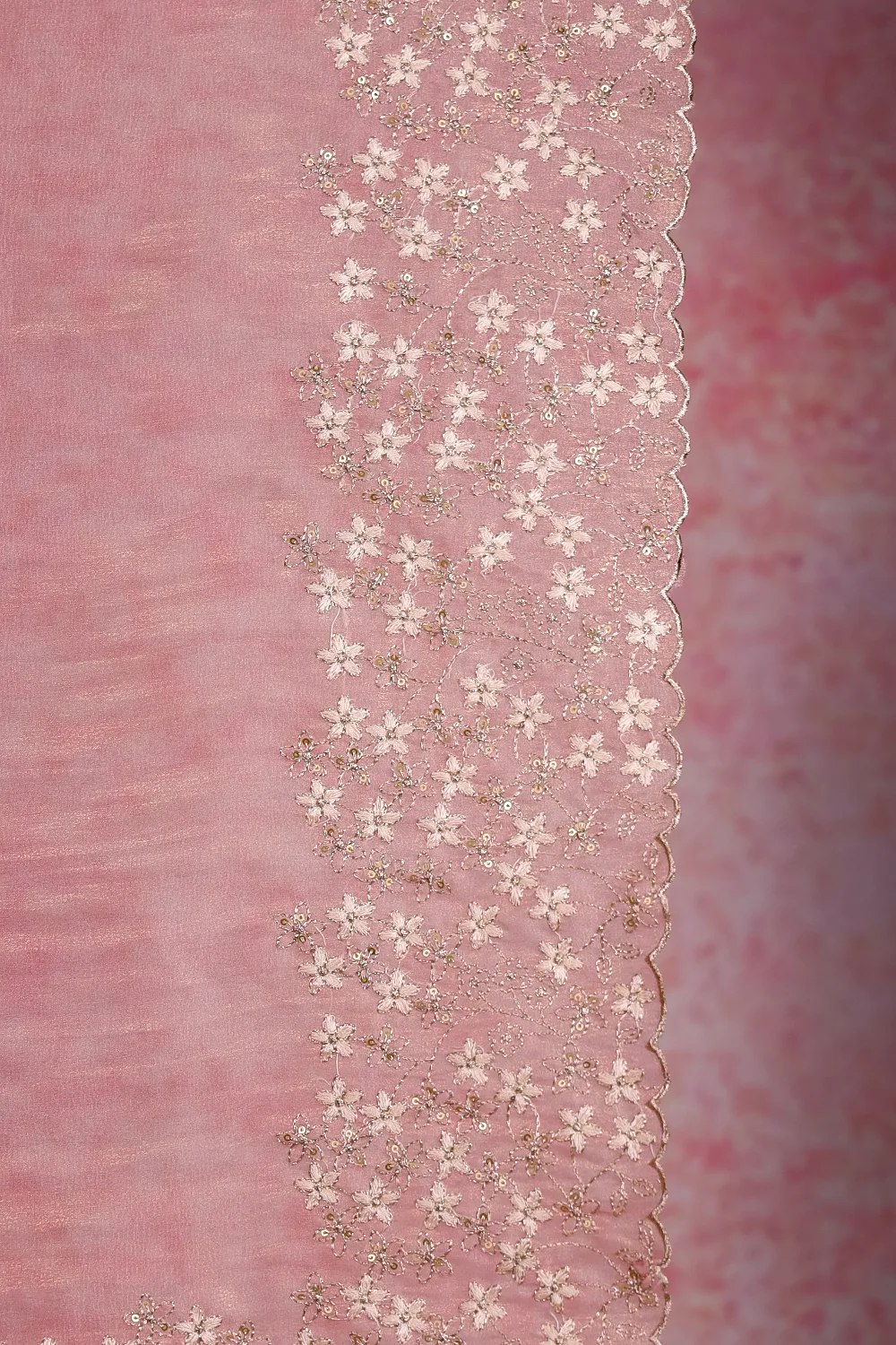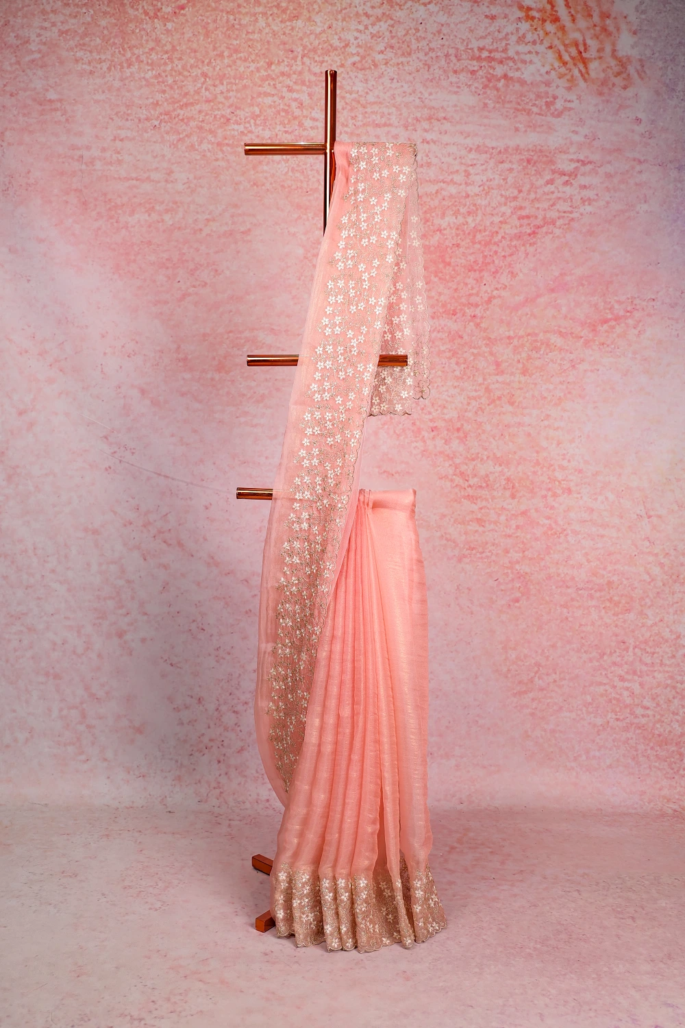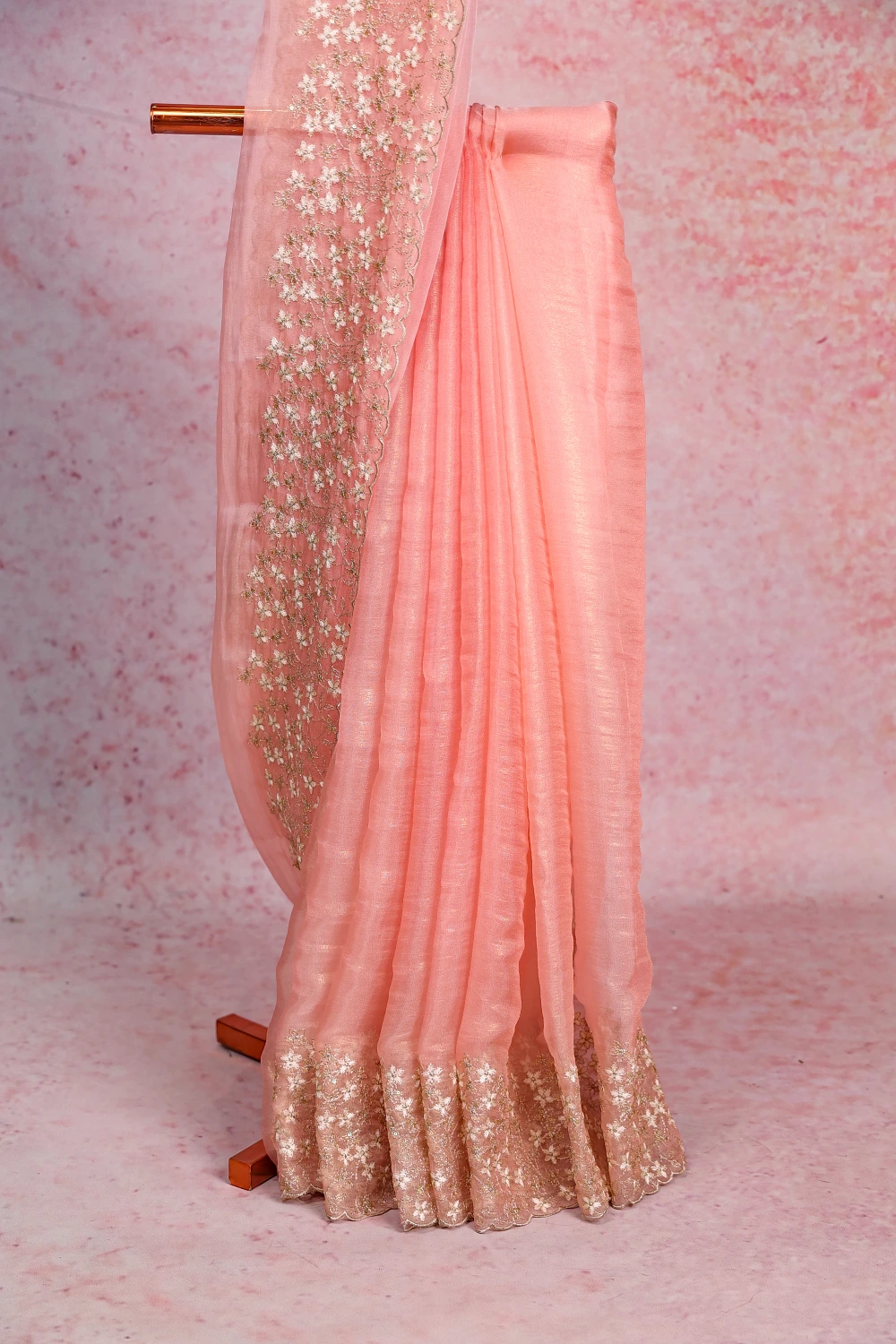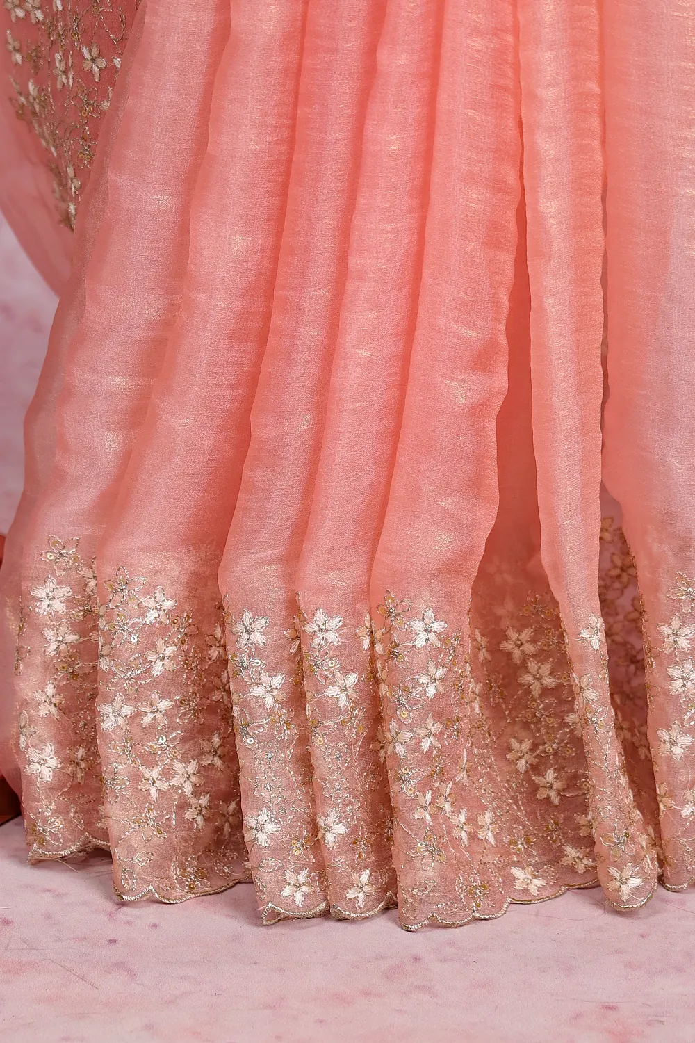 Peach Tissue Organza Plain Body Saree with Scalp Border. Includes Unstitched Blouse