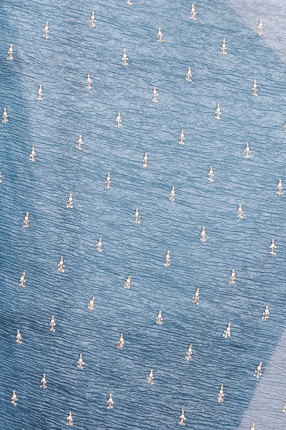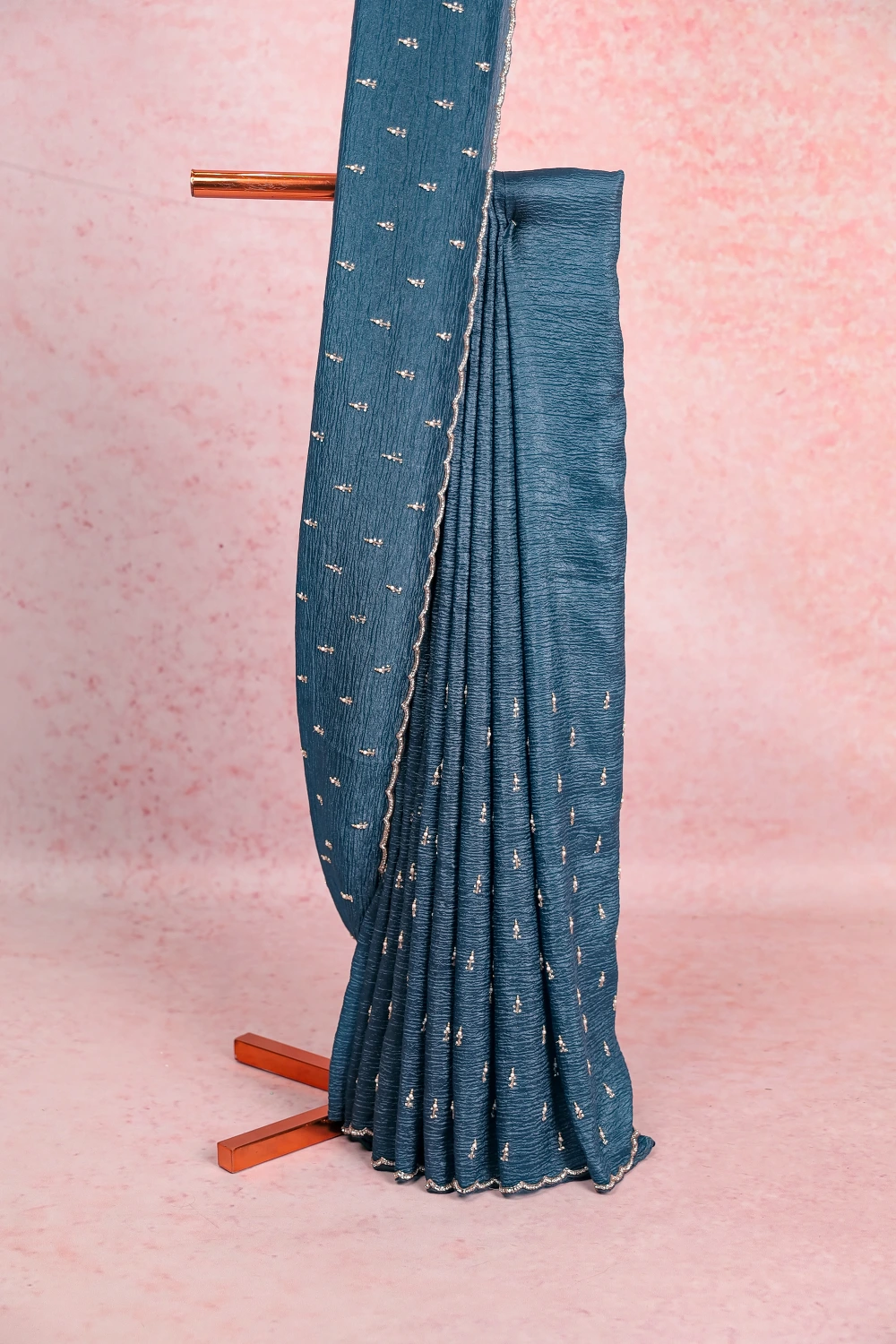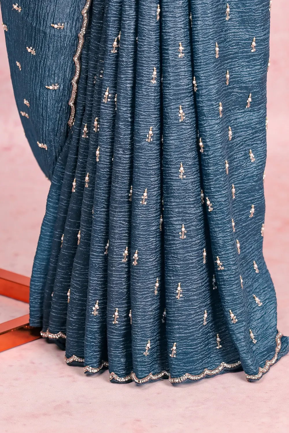 Peacock Blue Crush Organza Pearl And Stone Work Saree with Scallop Border. Includes Unstitched Blouse