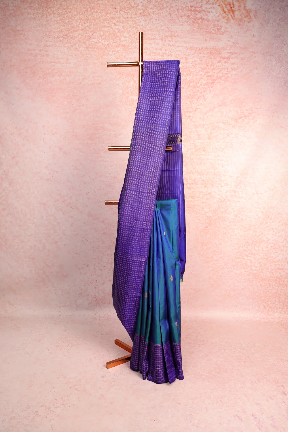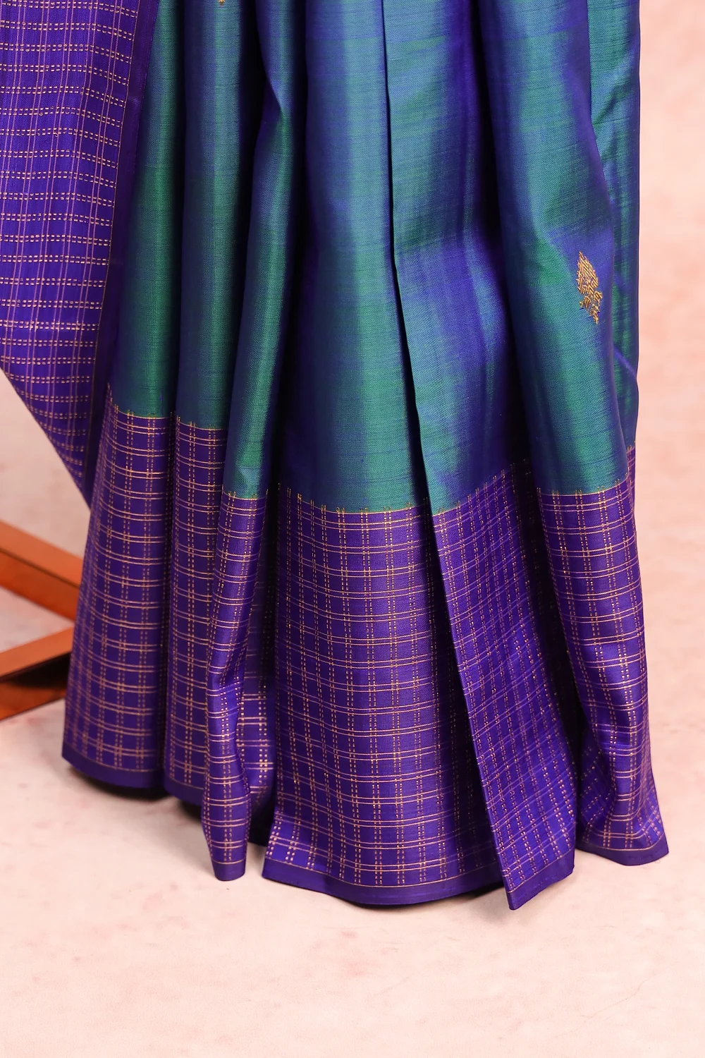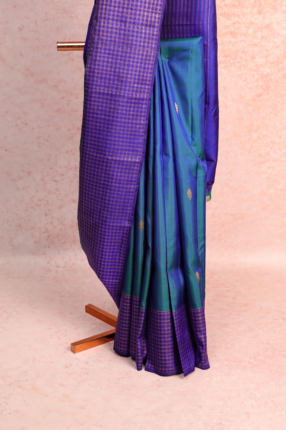 Peacock Blue Kancheepuram Silk Butta Saree with Check Border. Includes Unstitched Blouse