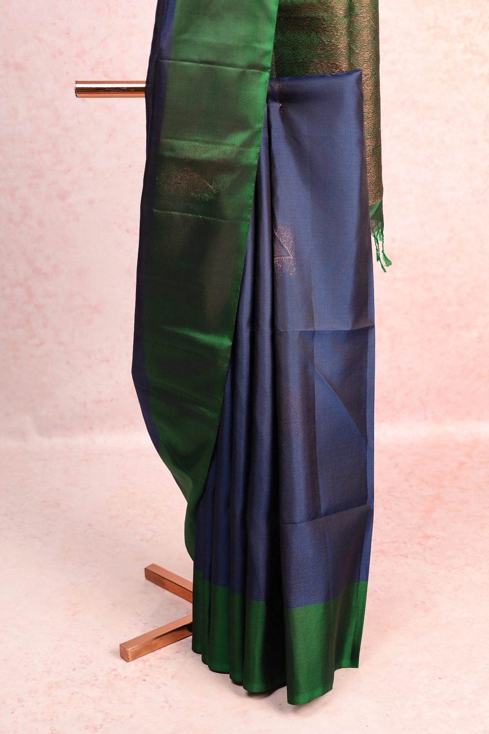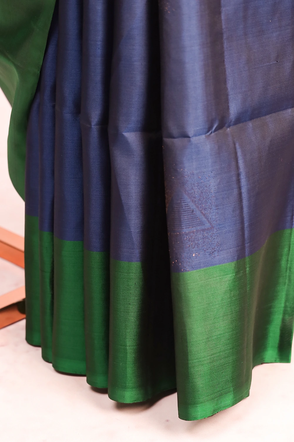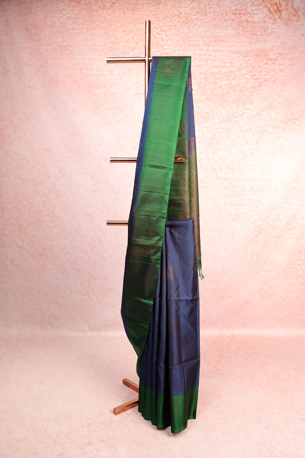Peacock Blue Kancheepuram Soft Silk Geometrical Design Saree with Plain Border. Includes Un stitched Blouse