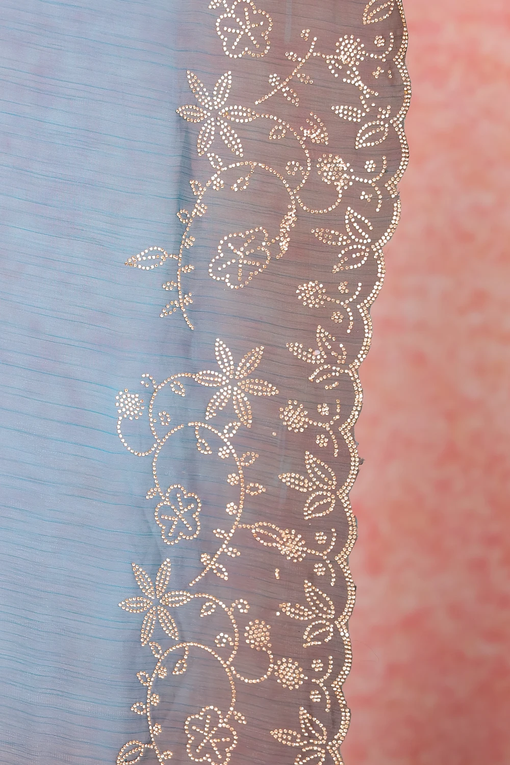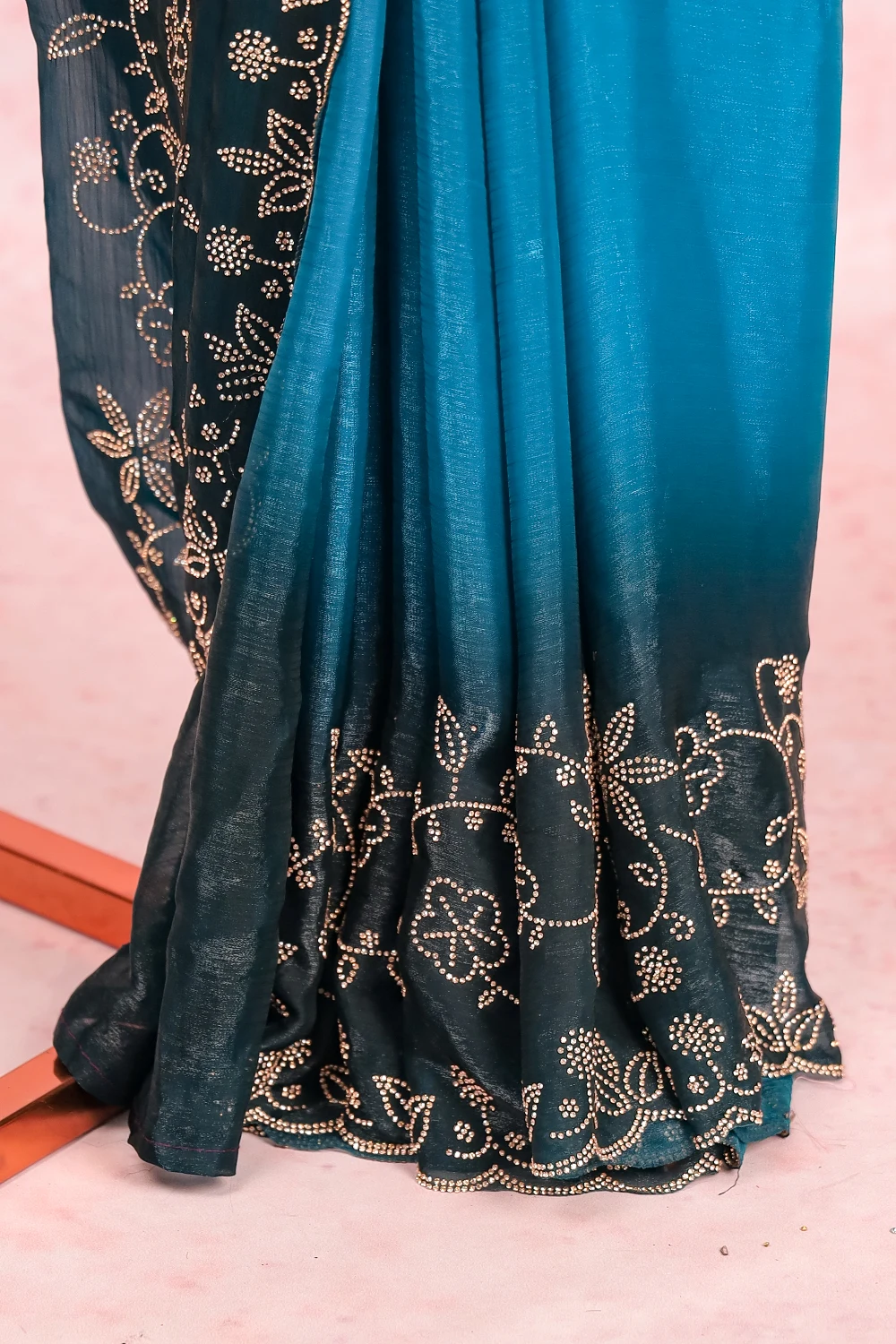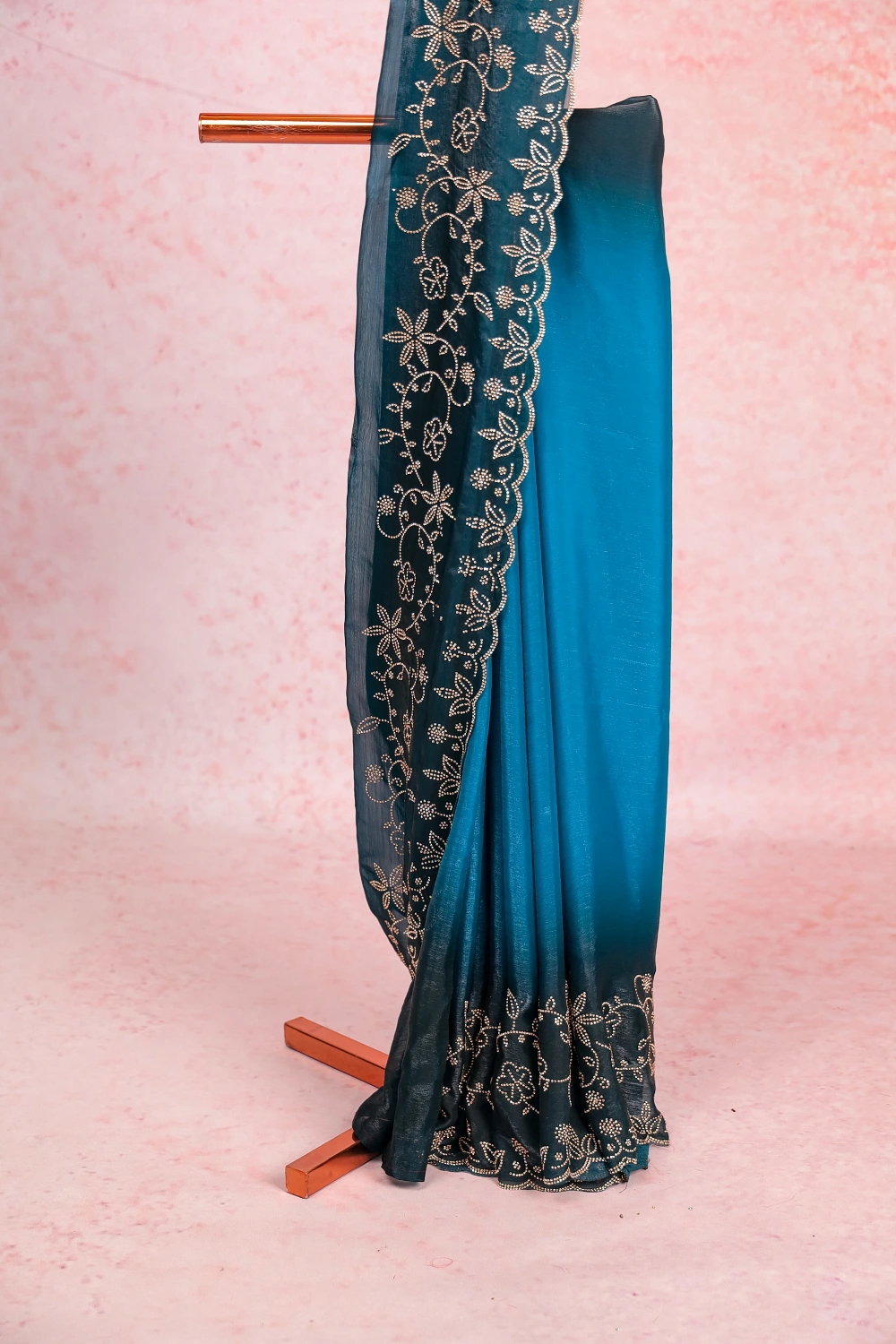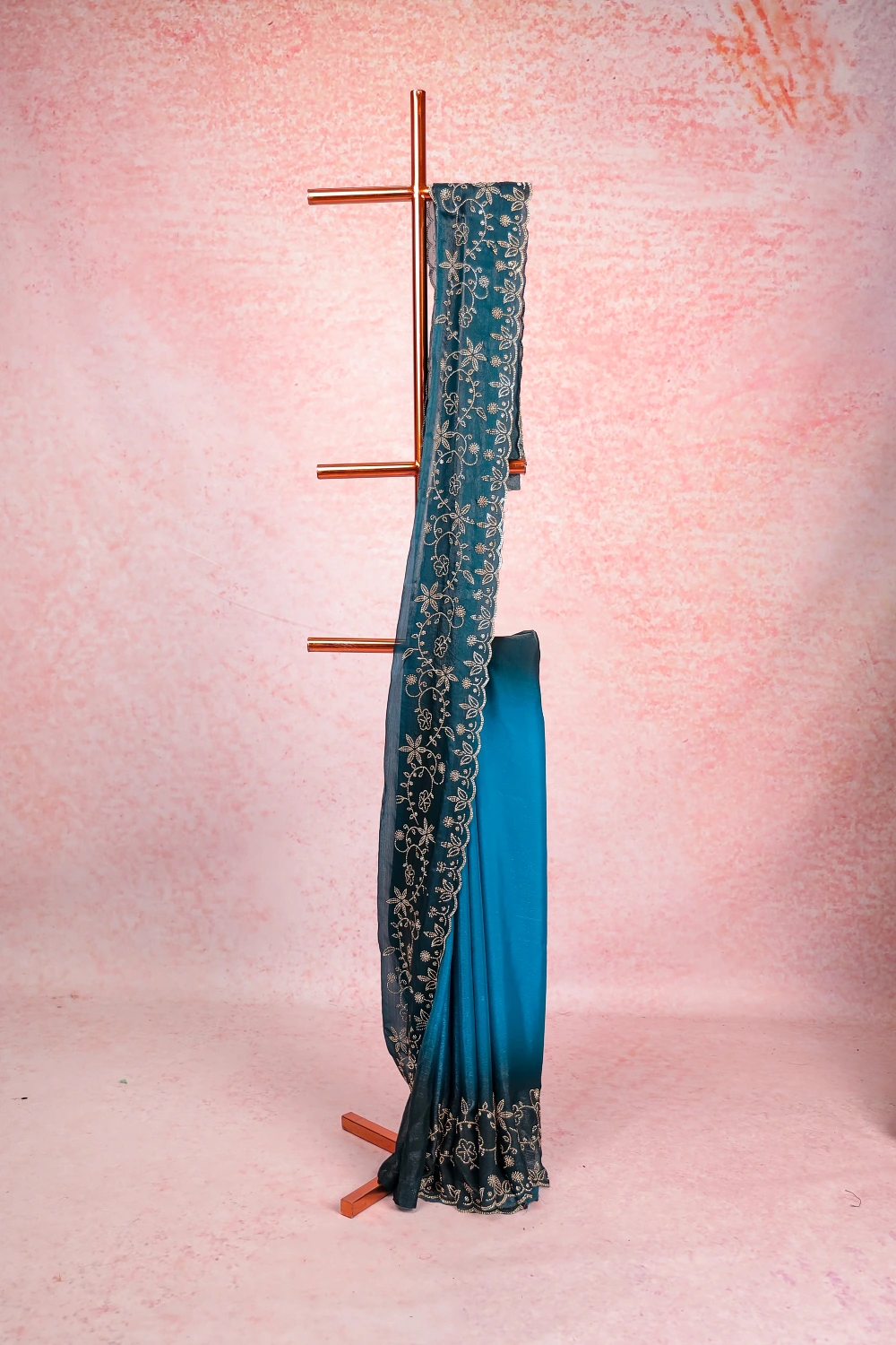 Peacock Blue Organza Plain Saree with Scallop Border. Includes Unstitched Blouse