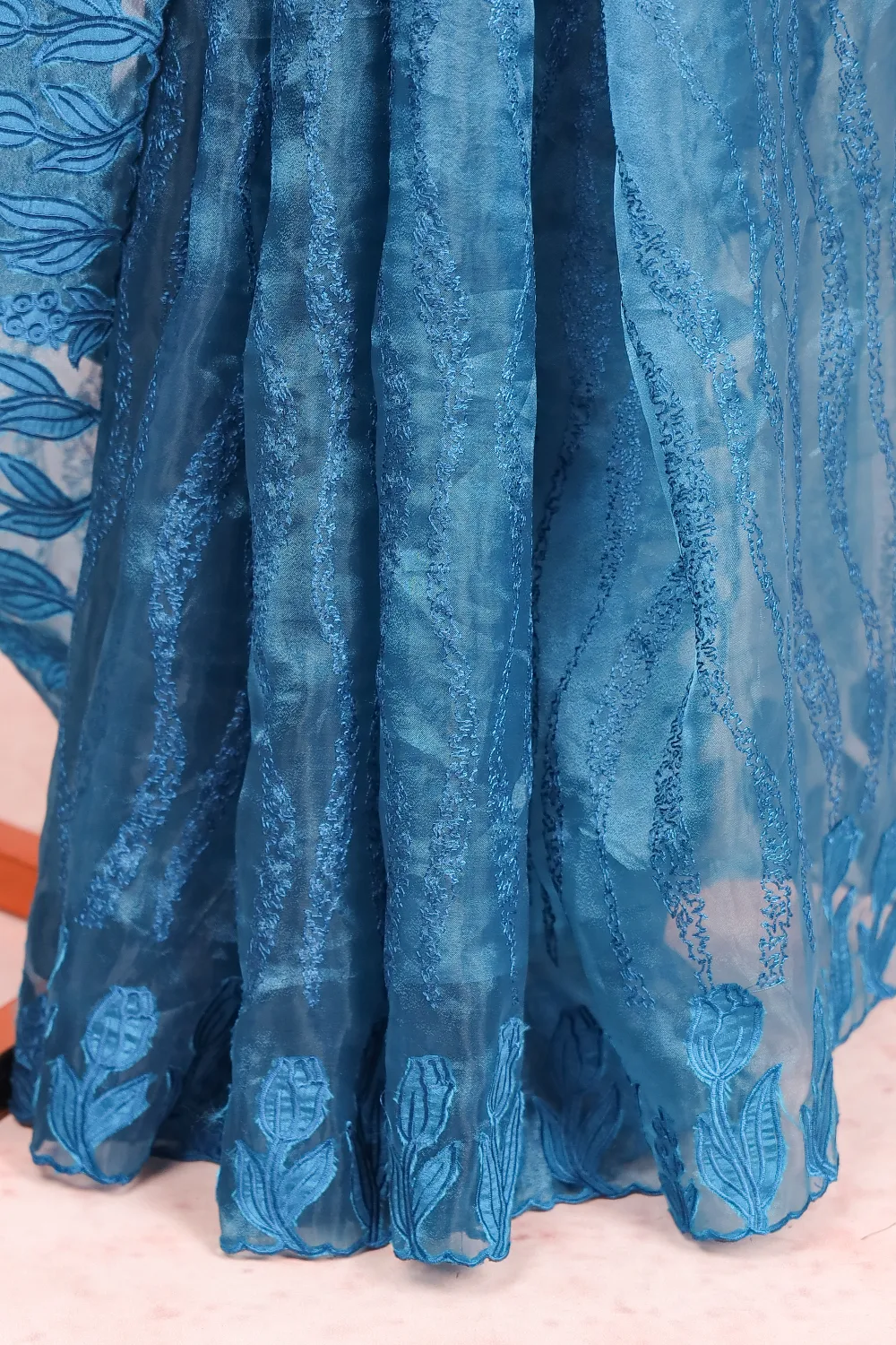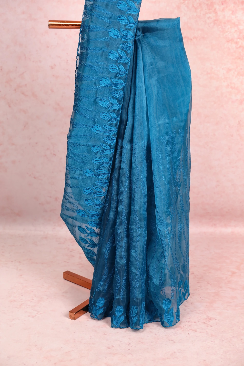 Peacock Blue Organza Thread Work Saree With Scallop Border. Includes Un Stitched Blouse