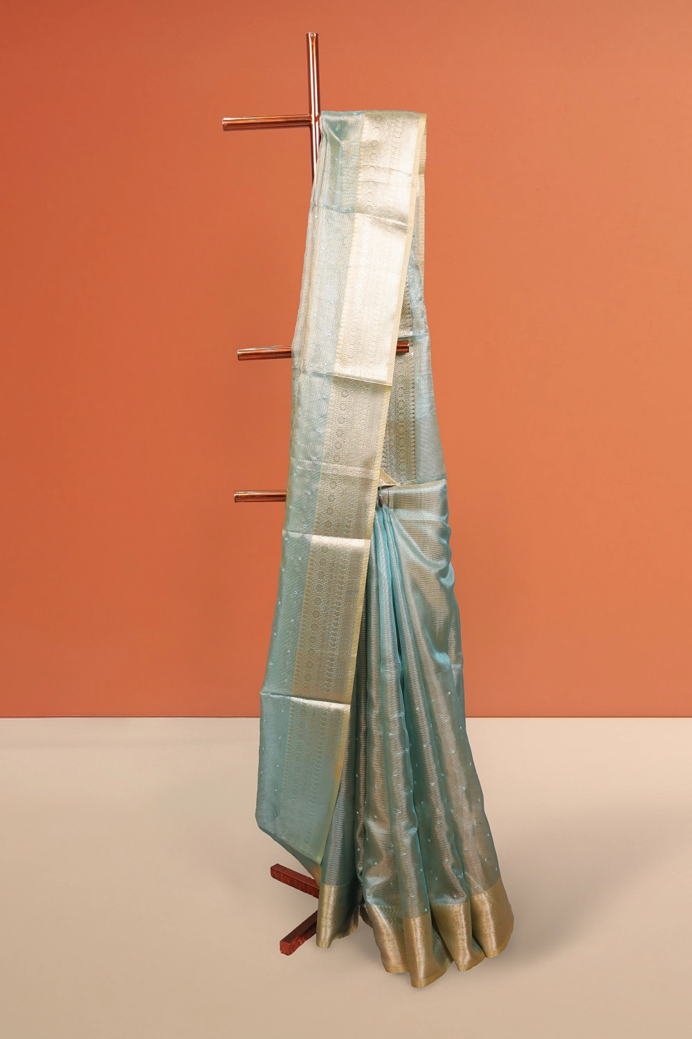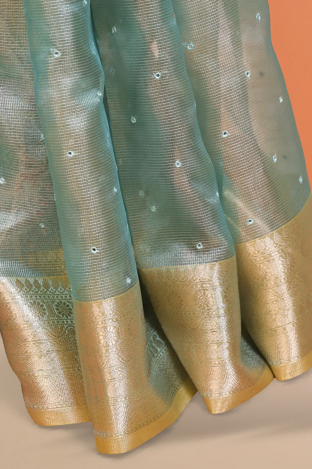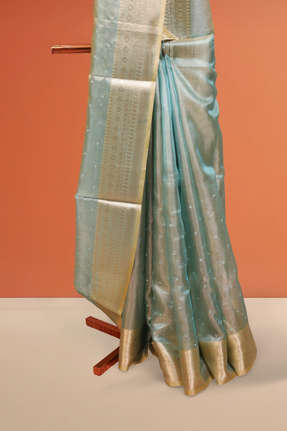 Peacock Blue Semi Tissue Mirror Work Saree with Designer Border. Includes Unstitched Blouse