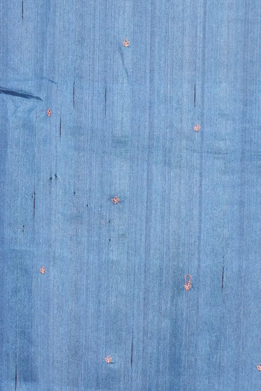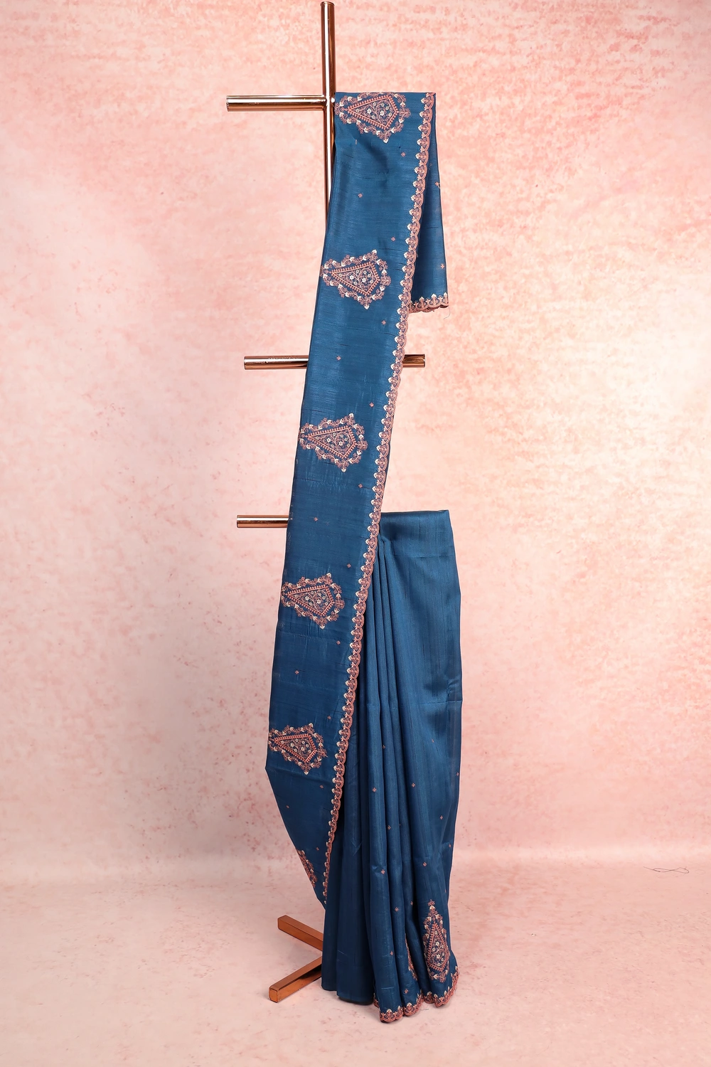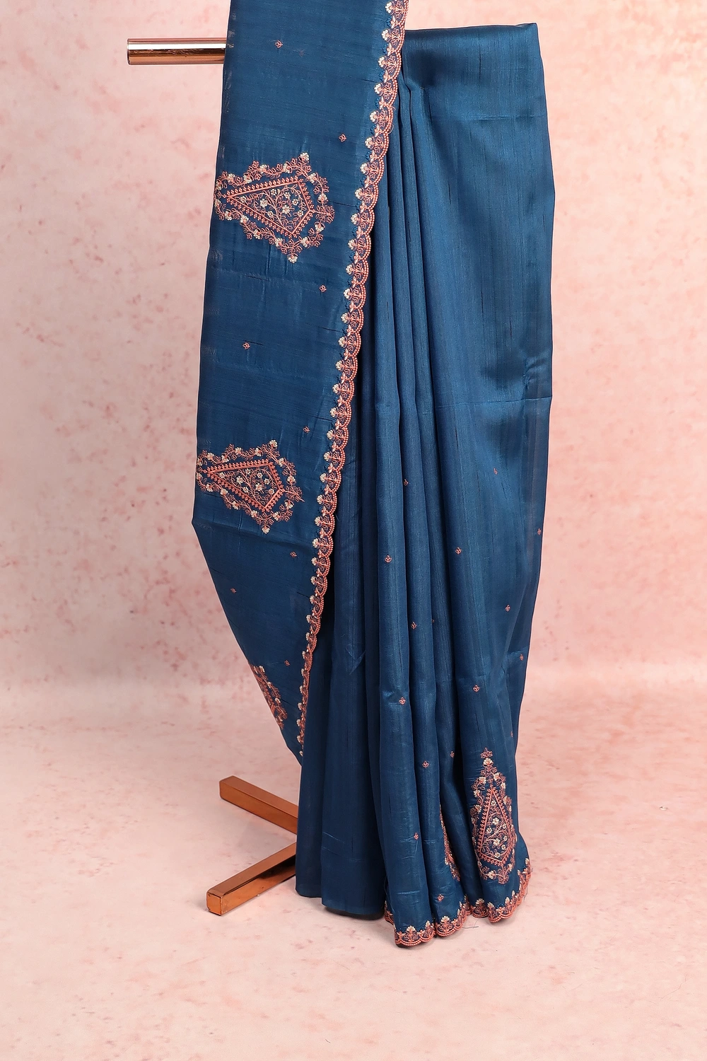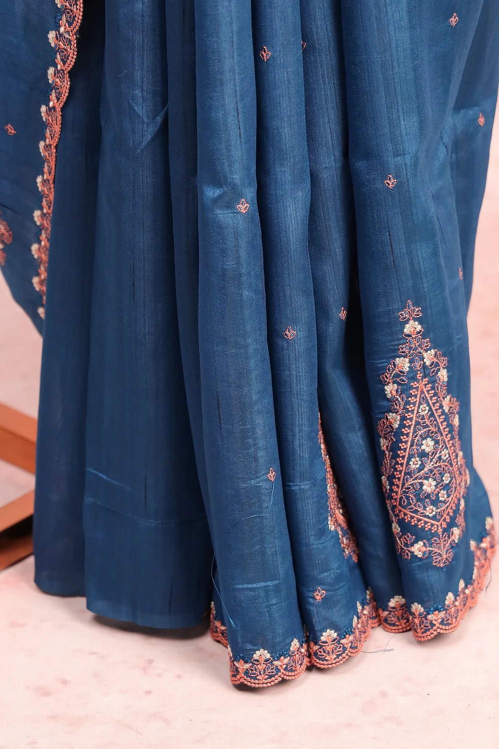 Peacock Blue Semi Tussar Butta Saree with Thread Border. Includes Un stitched Blouse