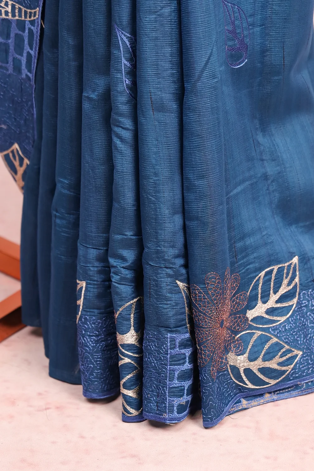 Peacock Blue Semi Tussar Embroidery Saree with Thread Border. Includes Un stitched Blouse