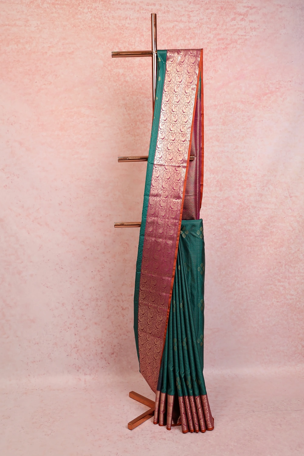 Peacock Green Kancheepuram Semi Silk Lines With Butta Saree with Designer Border. Includes Unstitched Blouse